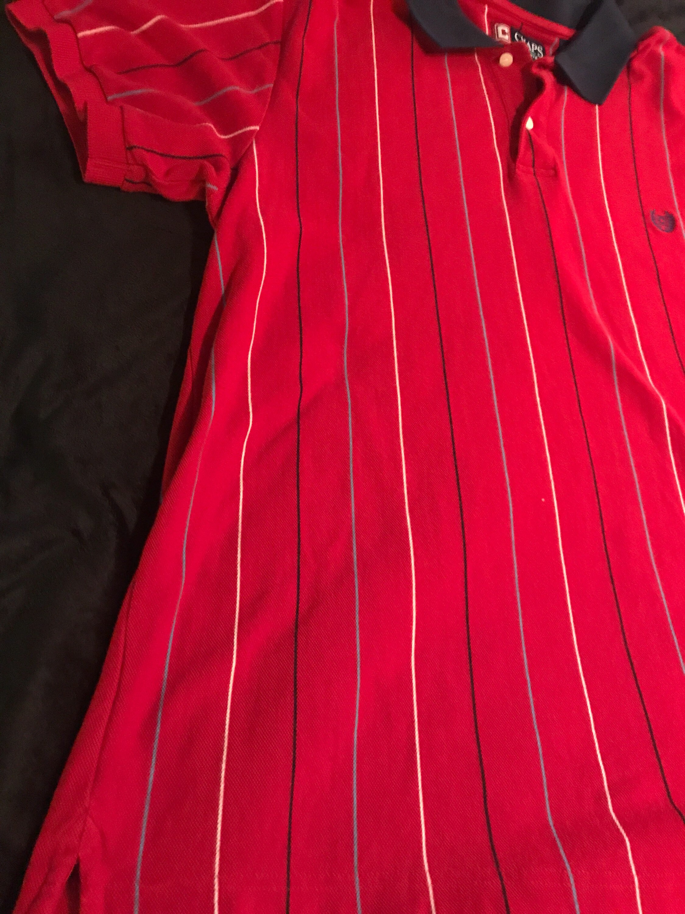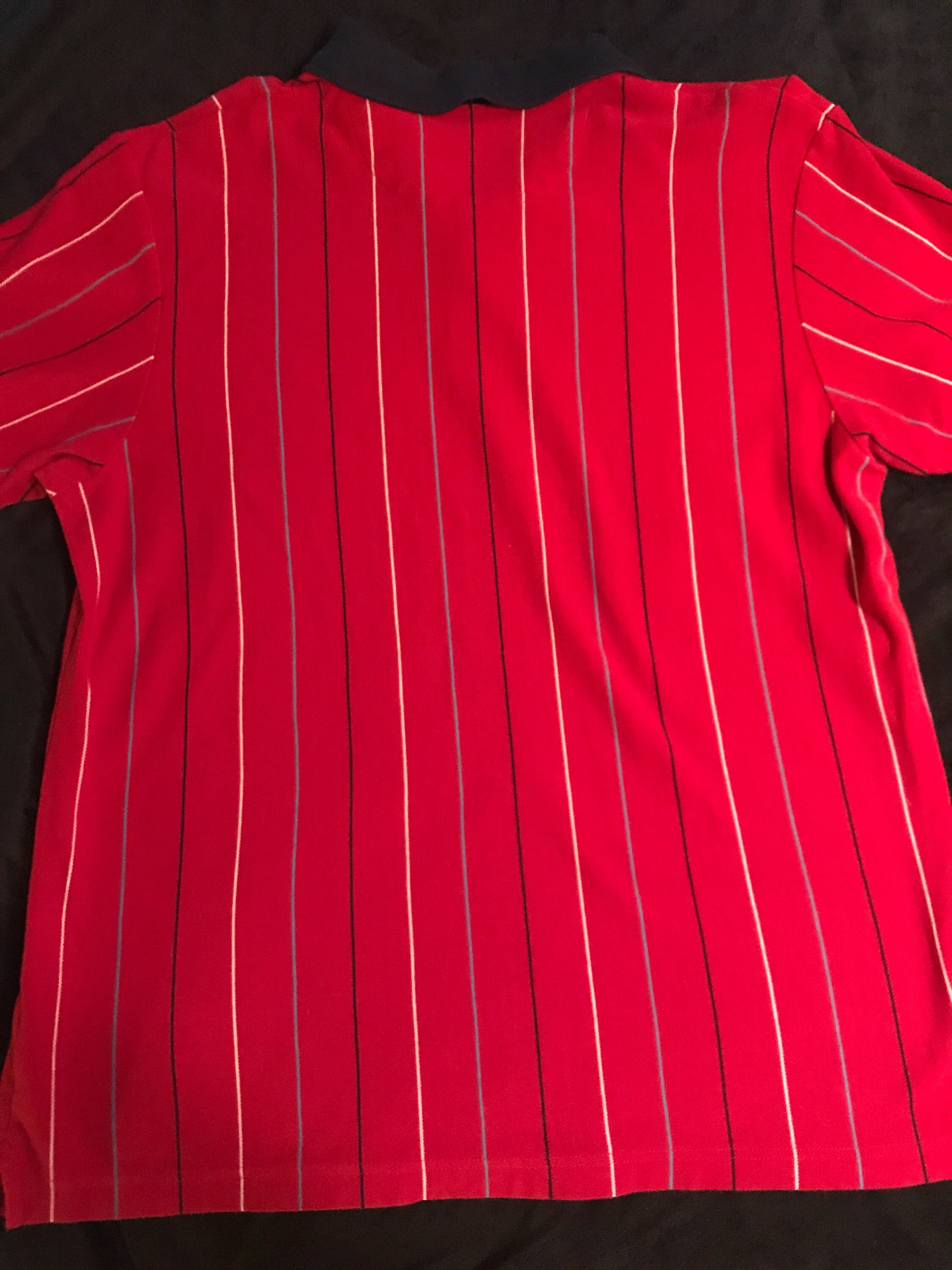 Very nice, Ralph Lauren red with navy collar and white, light blue, and navy thin stripes on it. I think it’s from the 90’s. It’s in good vintage condition!