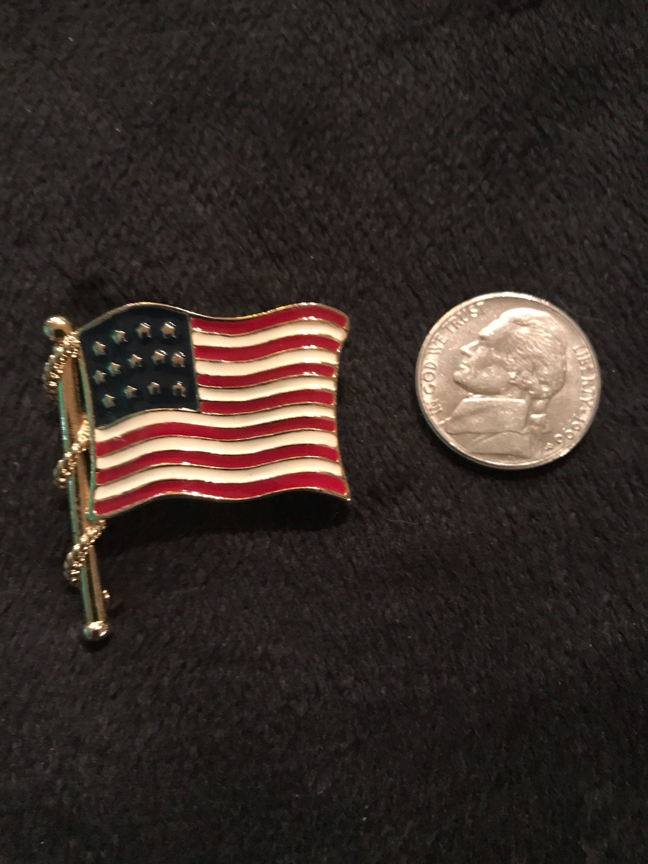 This is a nice unsigned USA flag brooch. The flag is gold tone, with blue, red, and silver enamel. The flag looks as if it’s waving in the wind. Great vintage condition.