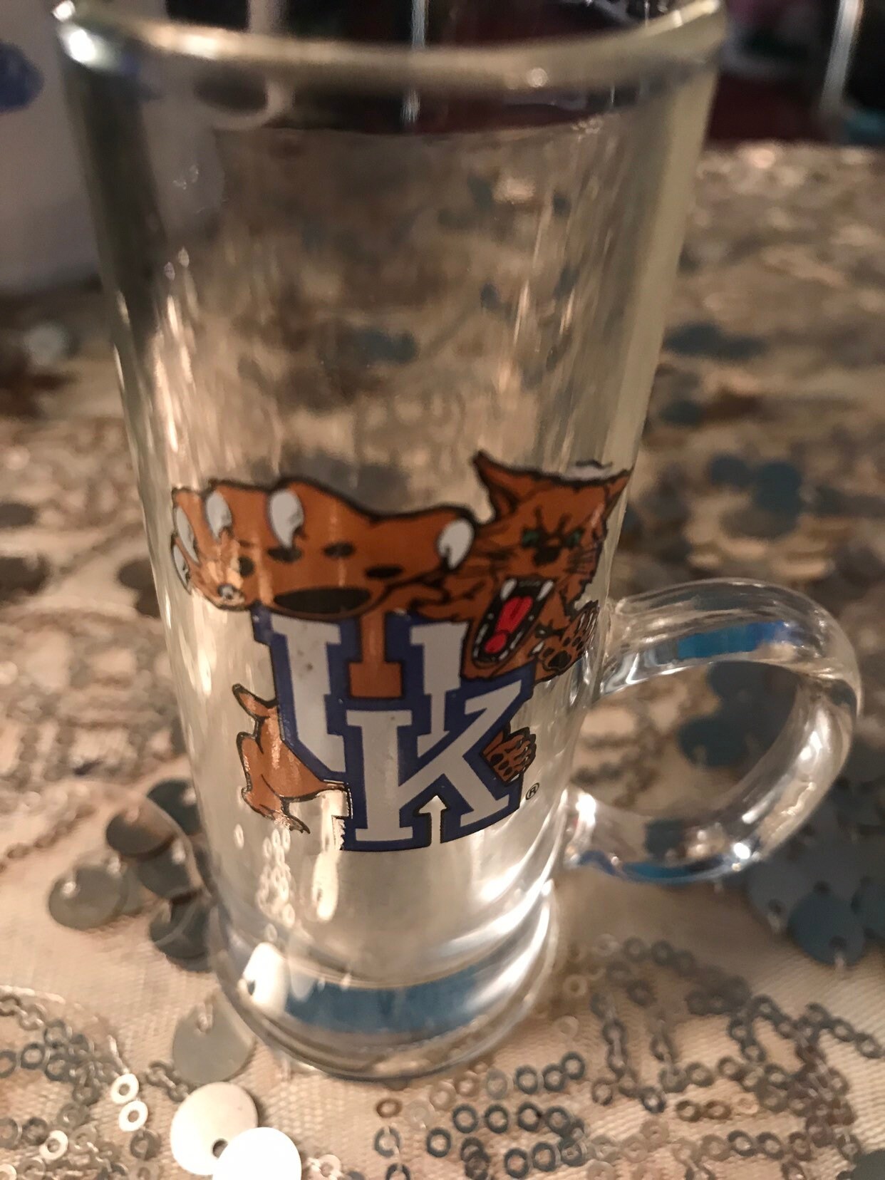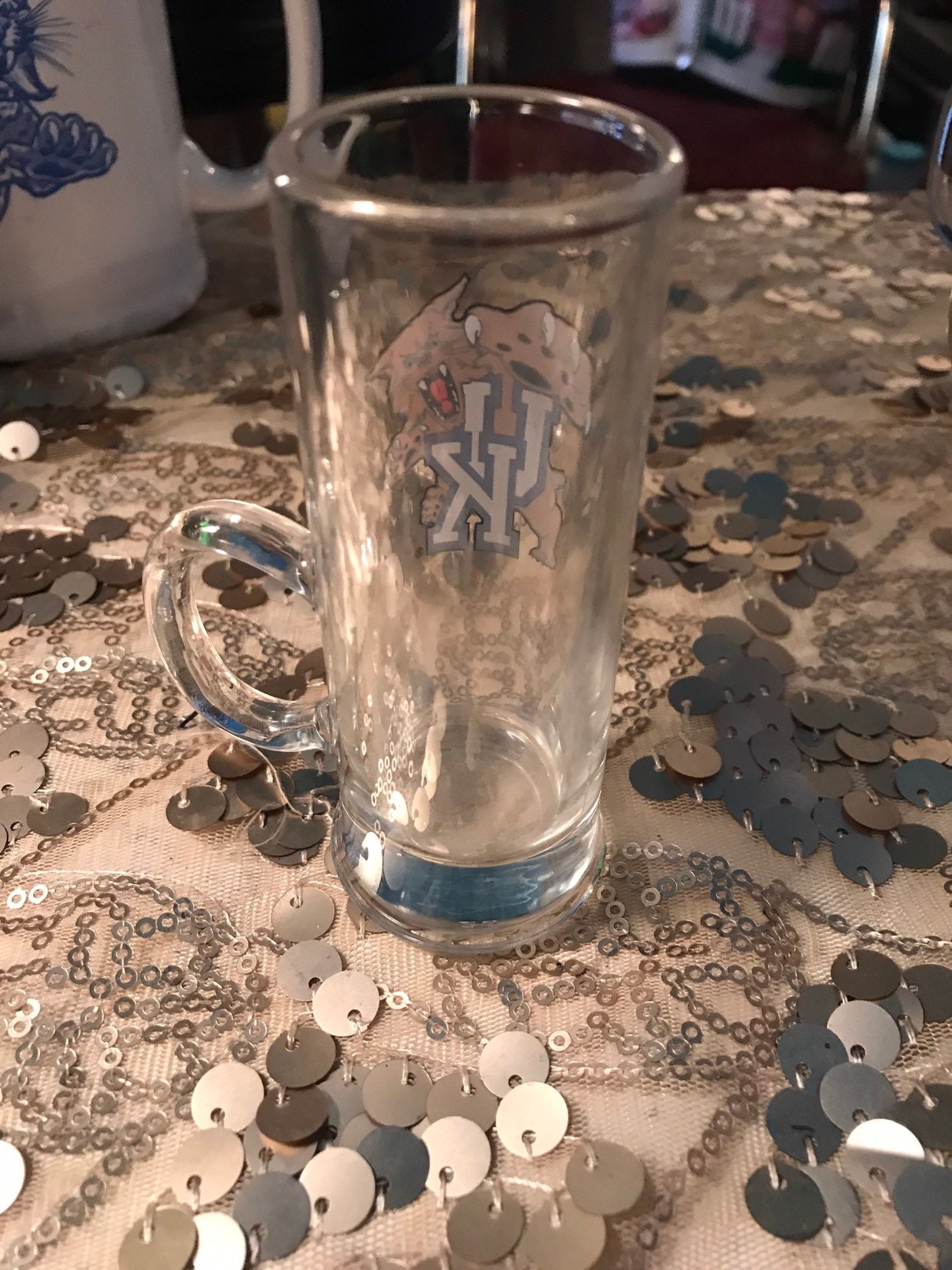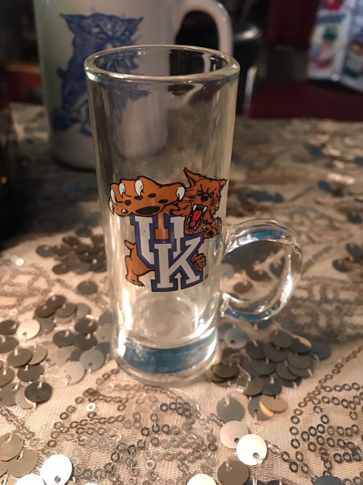 This is an awesome Kentucky Wildcat shot glass! Its a tall shot glass with a little handle. It's in good vintage condition.