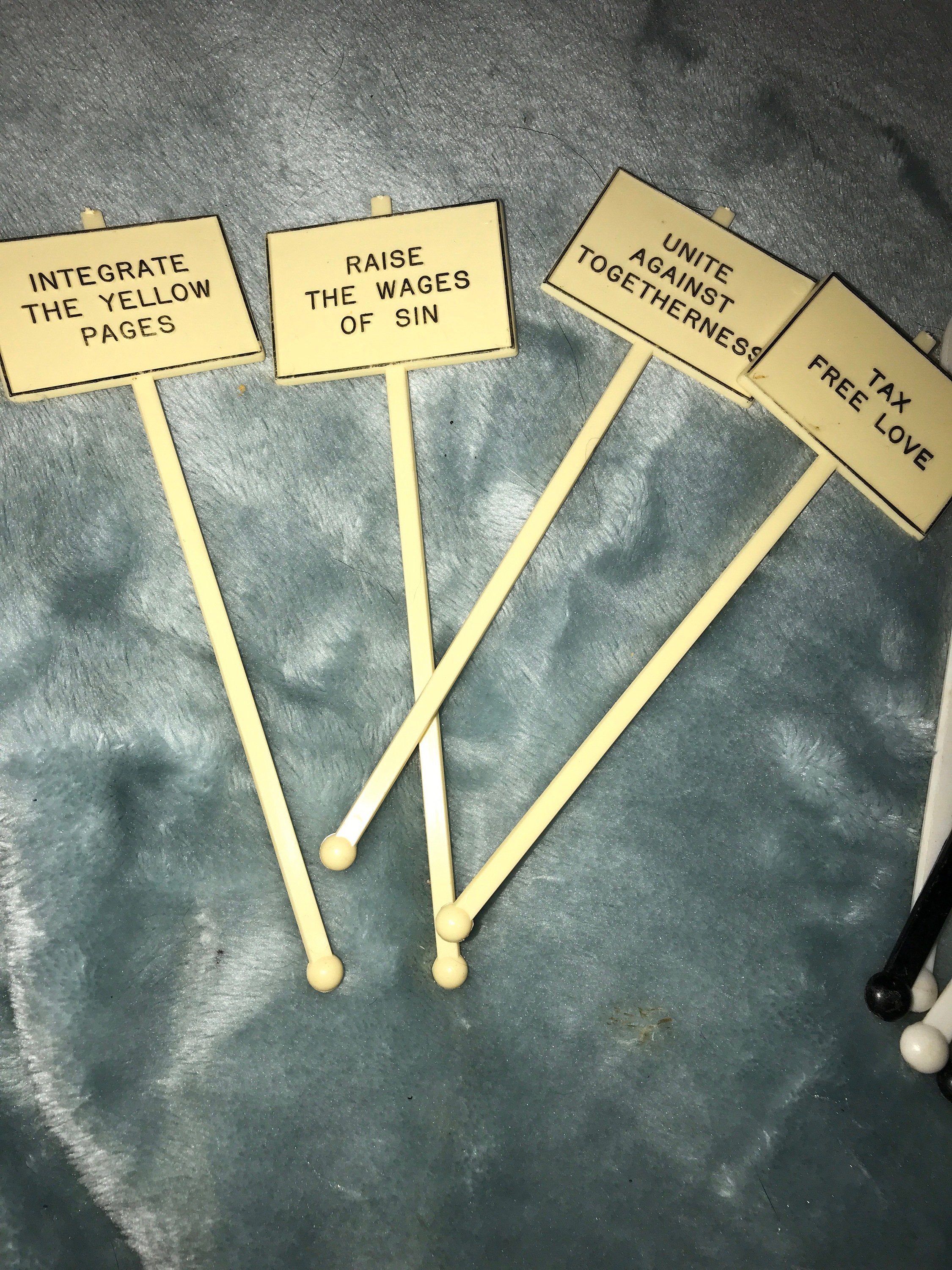 This is a nice little collection of vintage stir sticks. These are the funnies. I don’t have a complete set of either kind, so I put them together. The rounded set are from an MCM set of stir sticks called “Ridiculous Rumors”. The second set is just silly one liners.