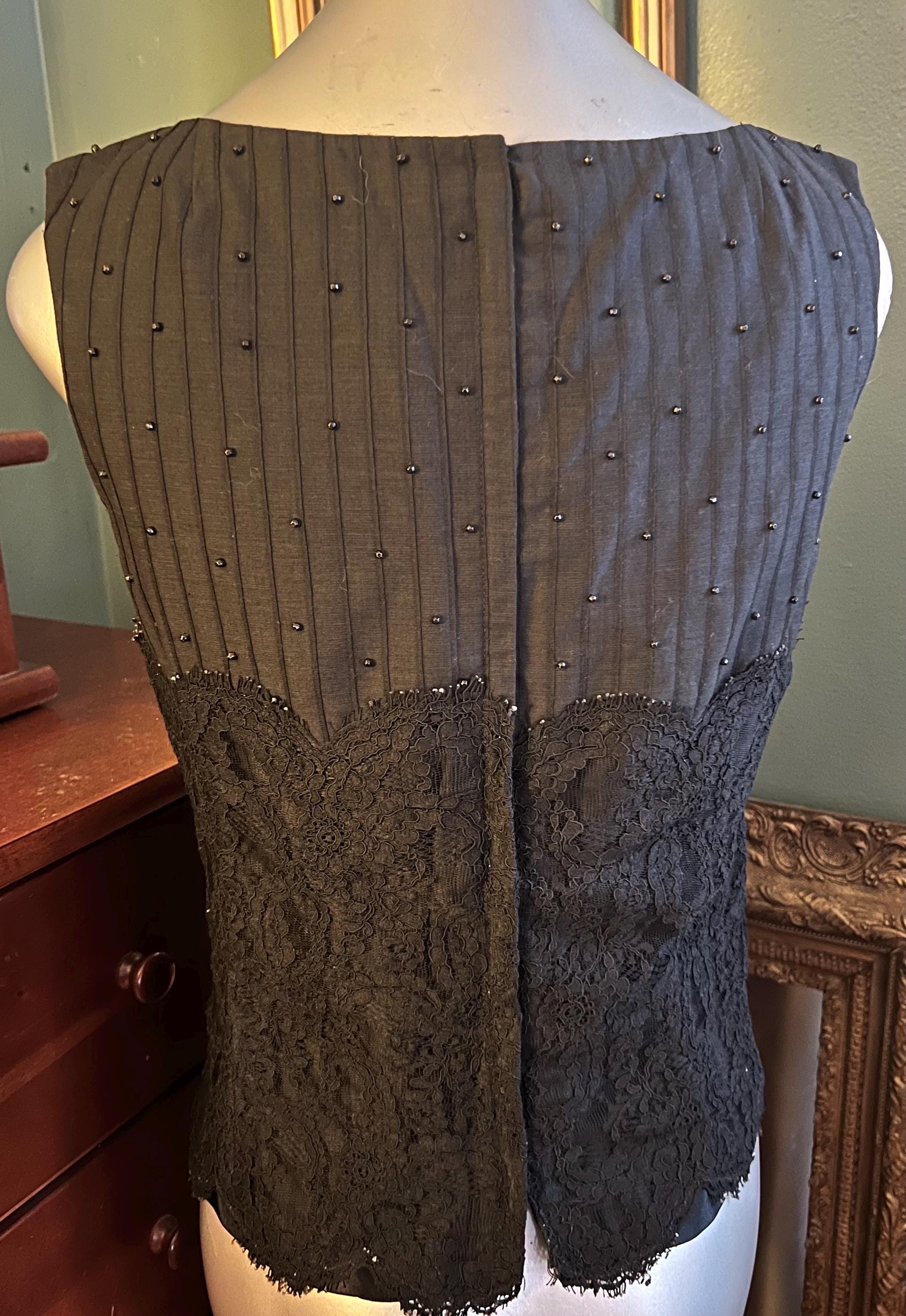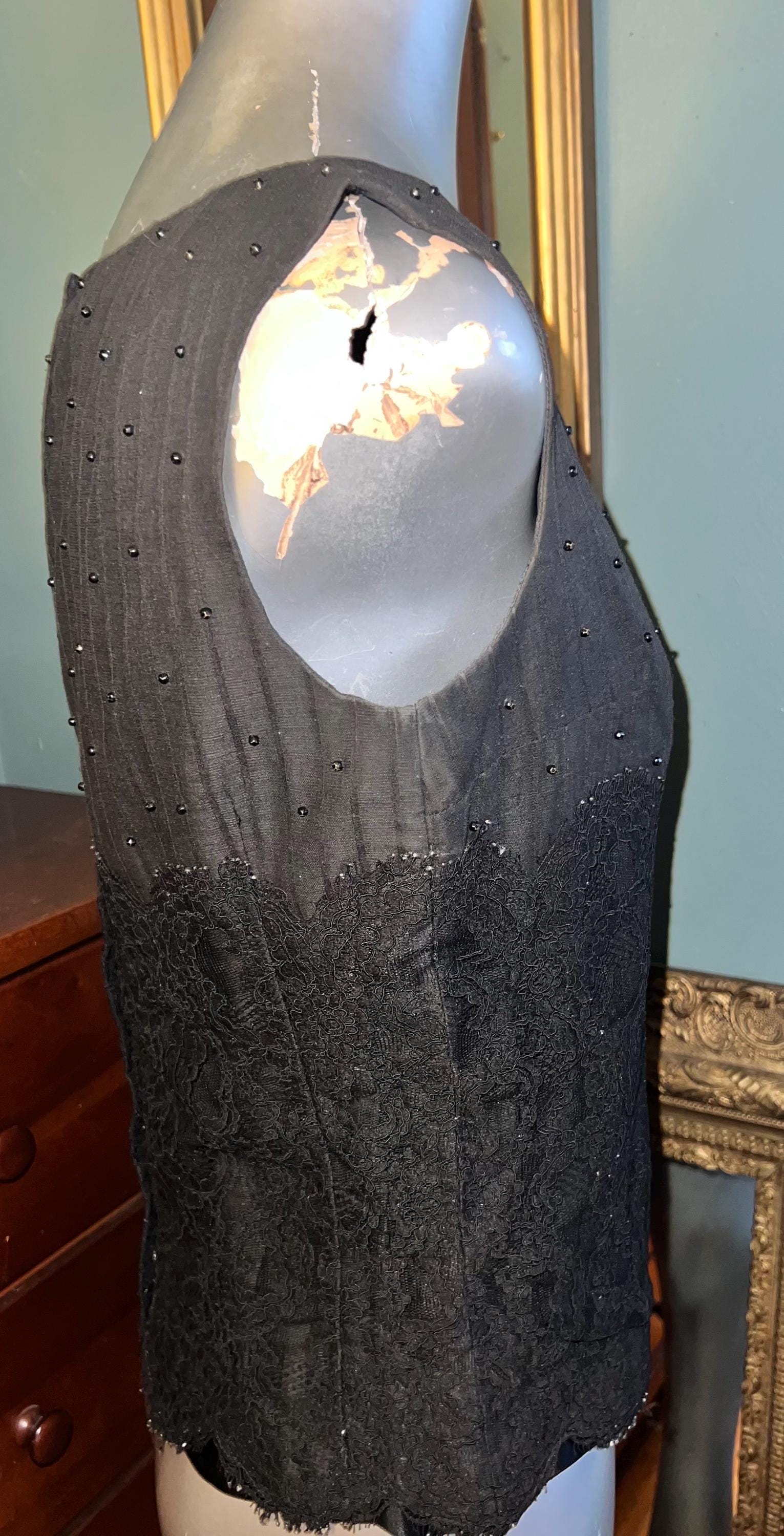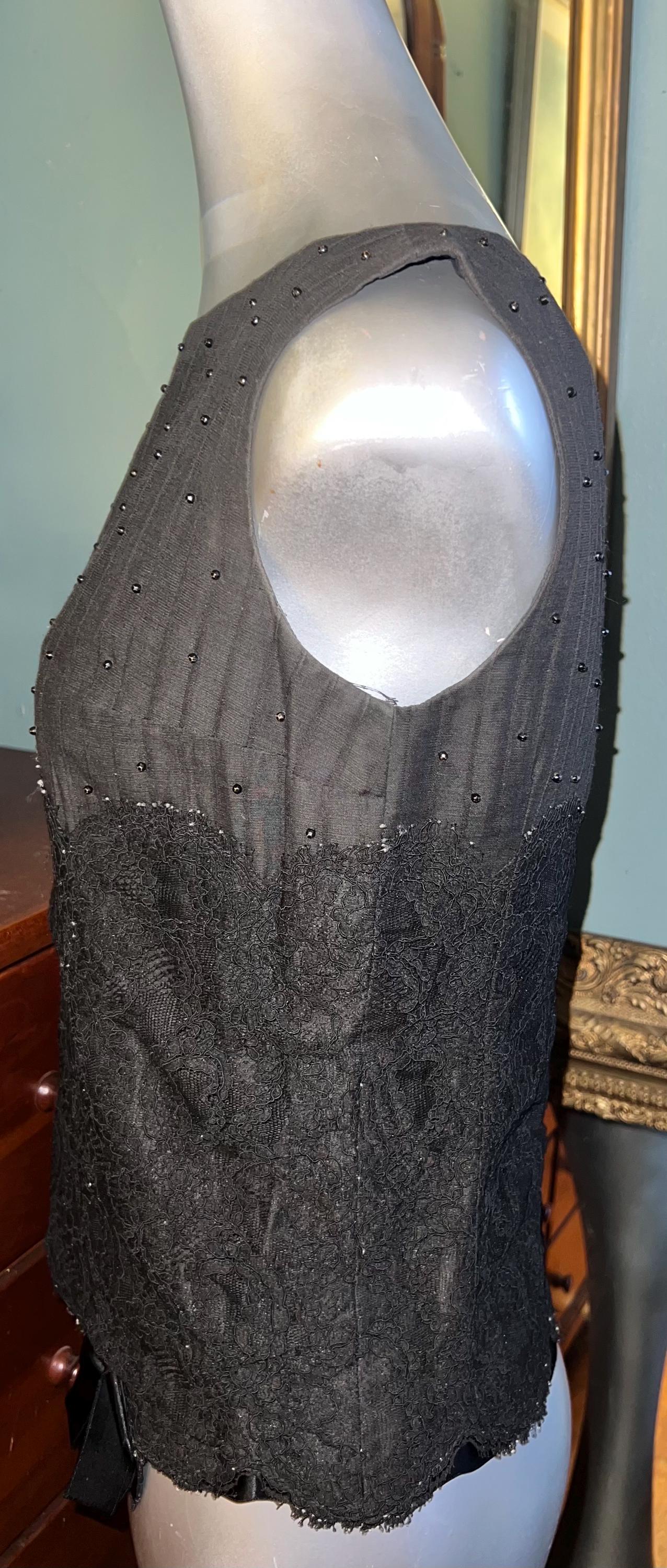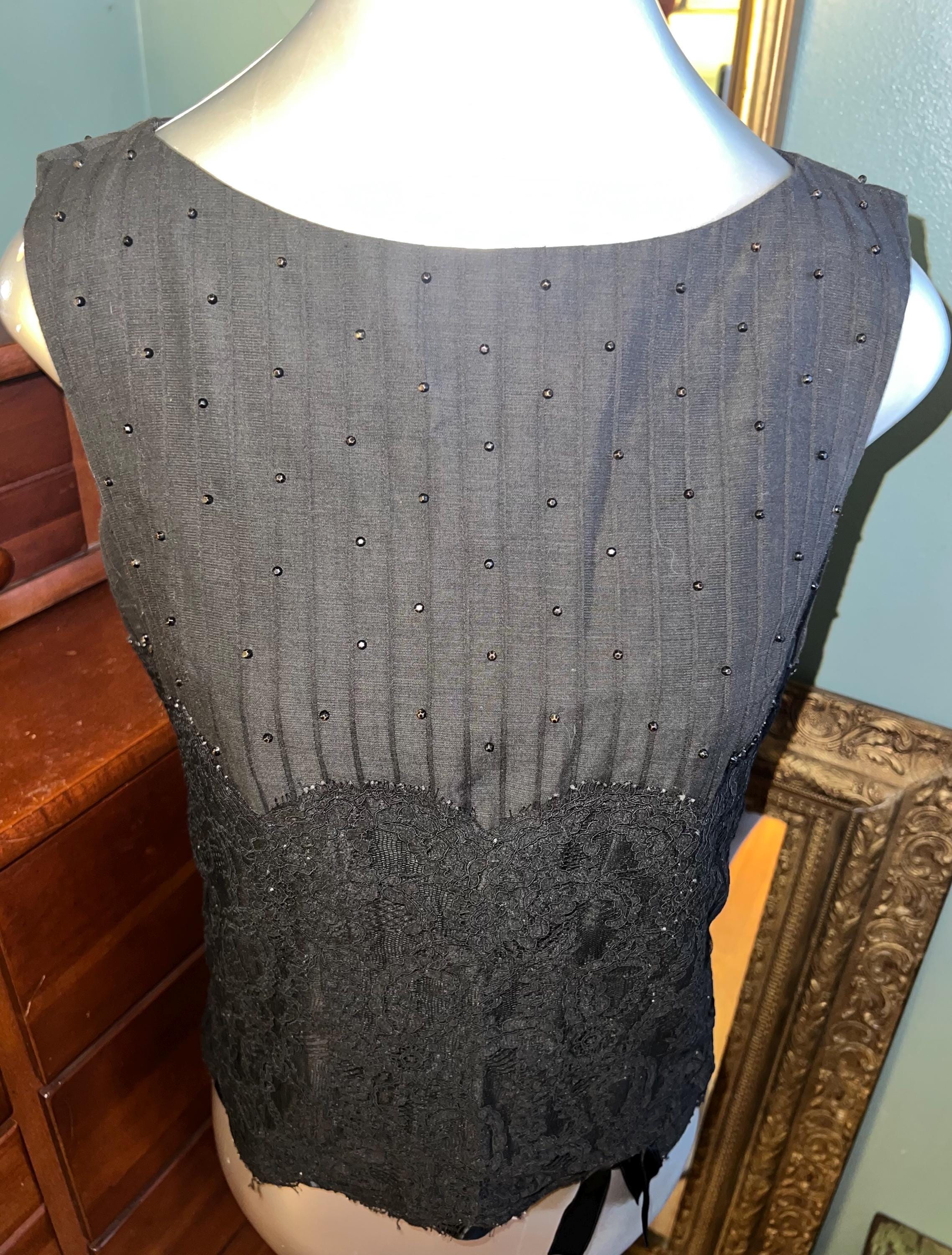 1950’s black lace and beads sleeveless shirt. The bottom half is black lace which has frayed along hem but it’s not too big of a deal. The bodice has black beading and striping. The zipper works well. There’s a black satin bow at the hem. All in all and for it’s 70 year age it is in good vintage condition.