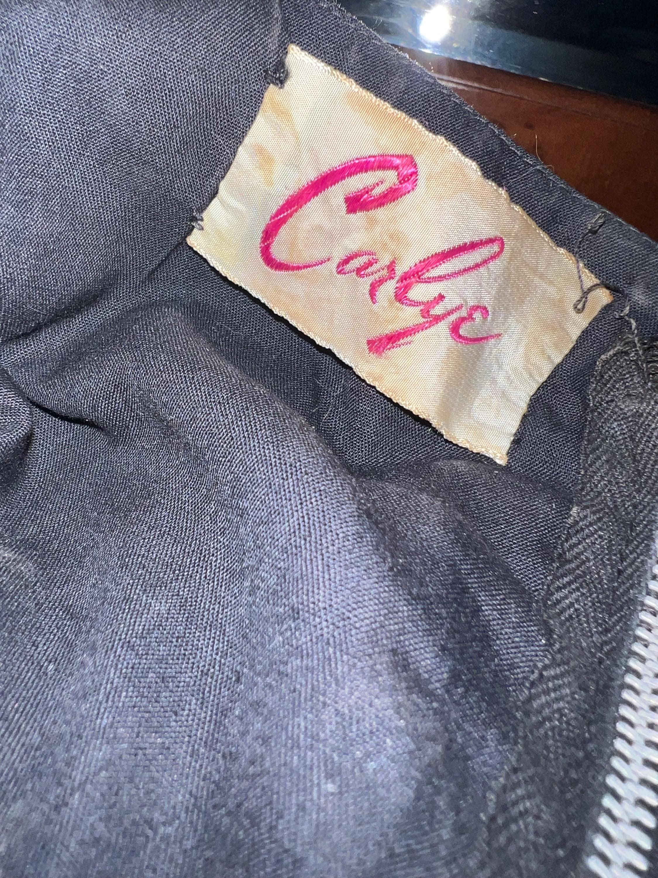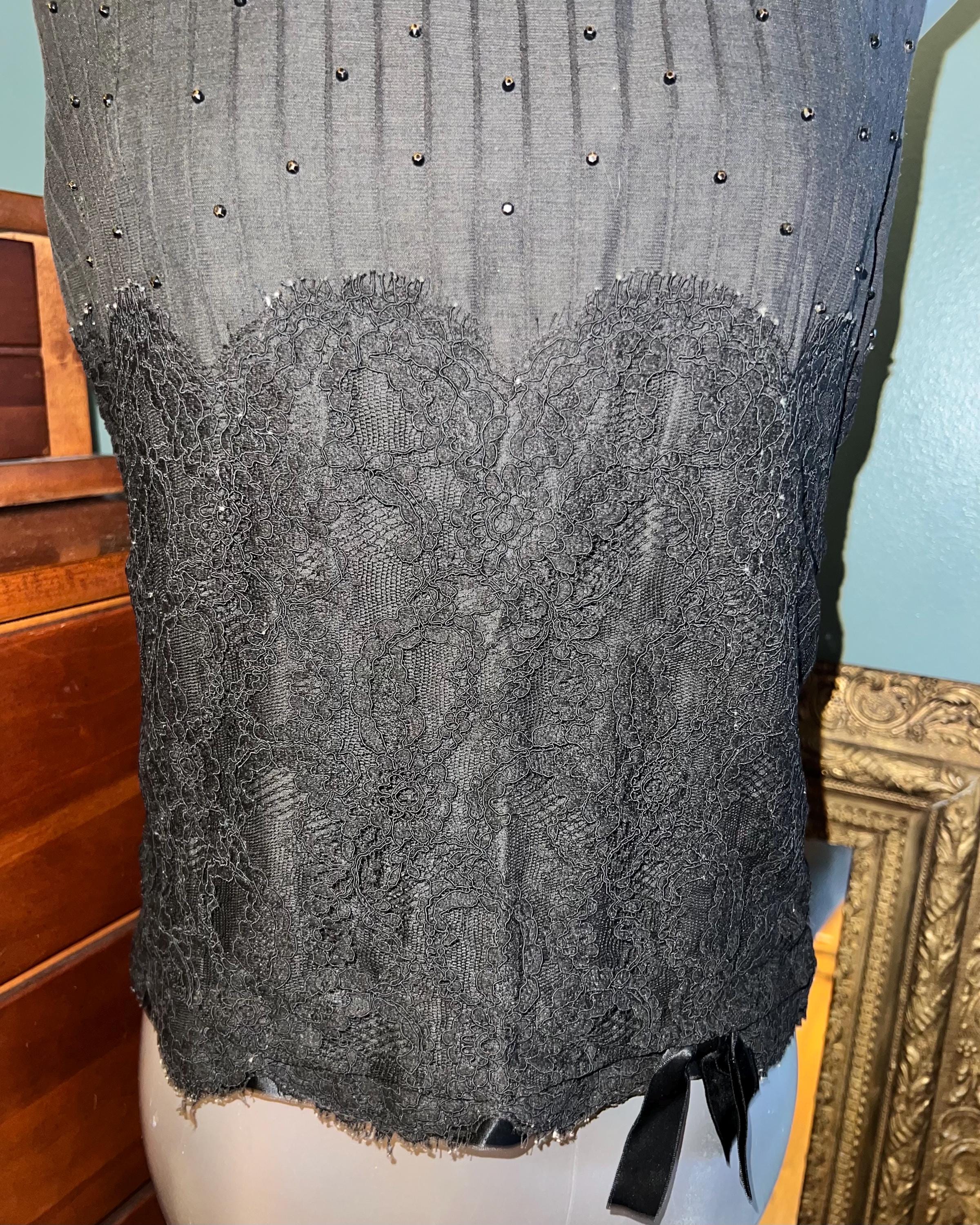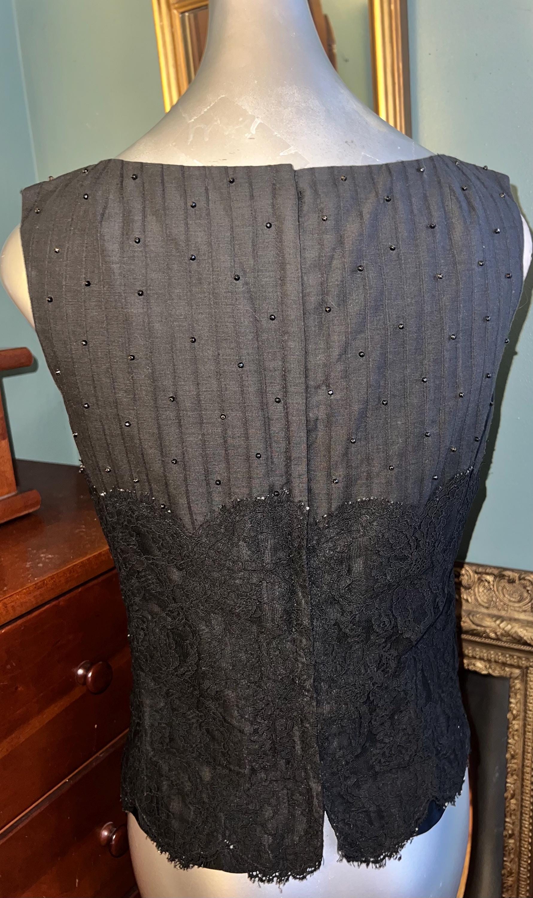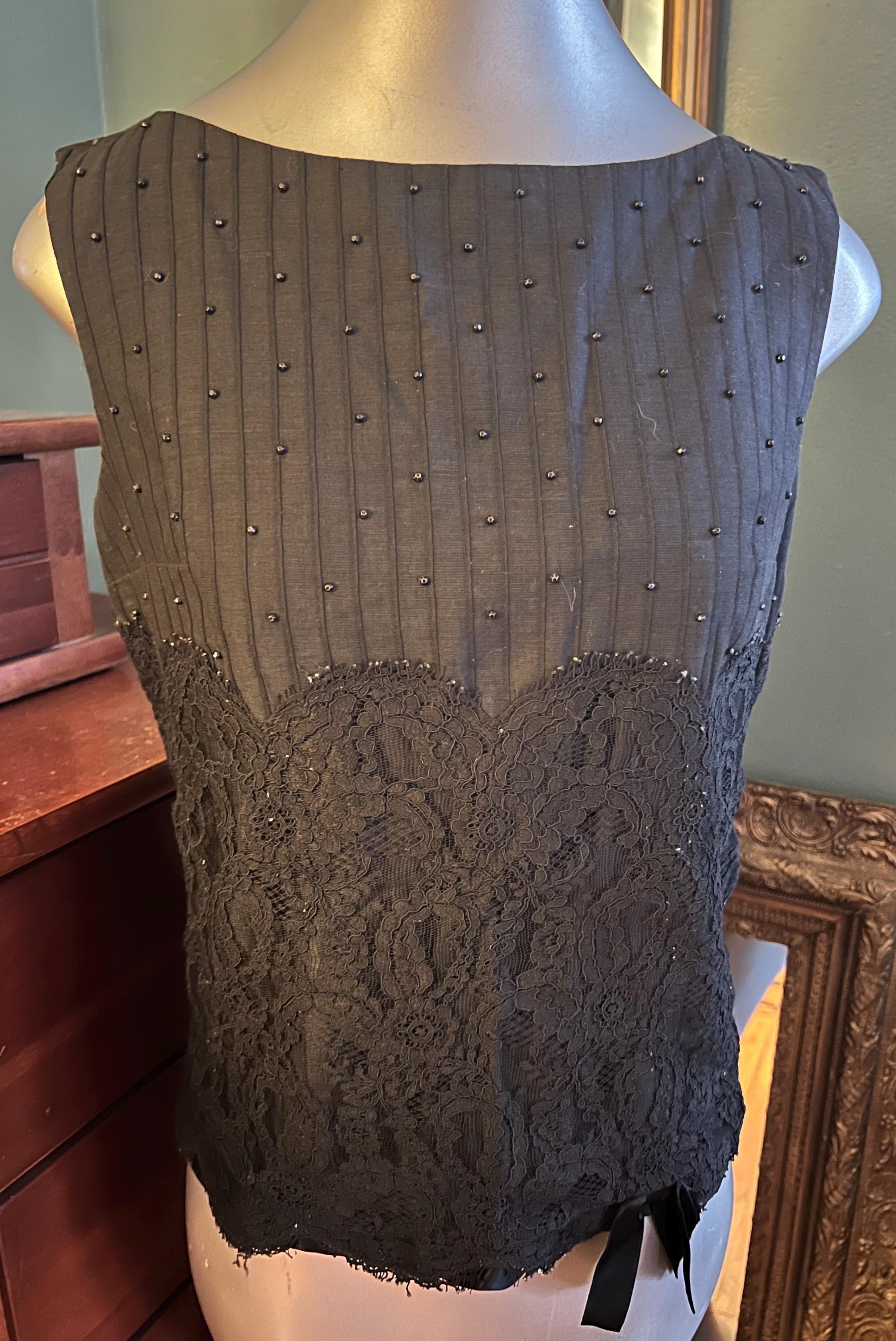 1950’s black lace and beads sleeveless shirt. The bottom half is black lace which has frayed along hem but it’s not too big of a deal. The bodice has black beading and striping. The zipper works well. There’s a black satin bow at the hem. All in all and for it’s 70 year age it is in good vintage condition.