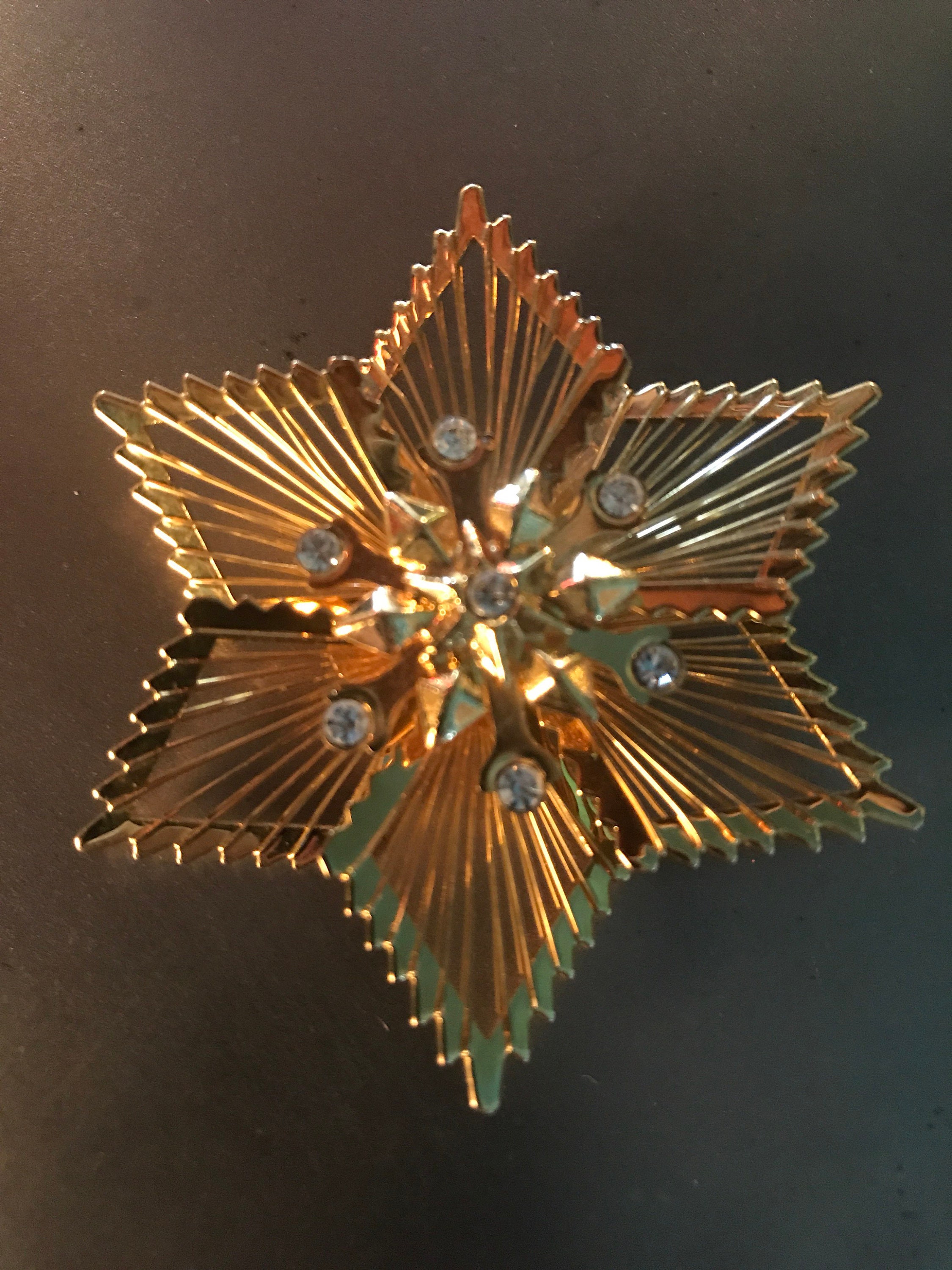 This is a super cool gold tone star brooch. It is very cool and definitely would make an awesome gift! It’s in good vintage condition.