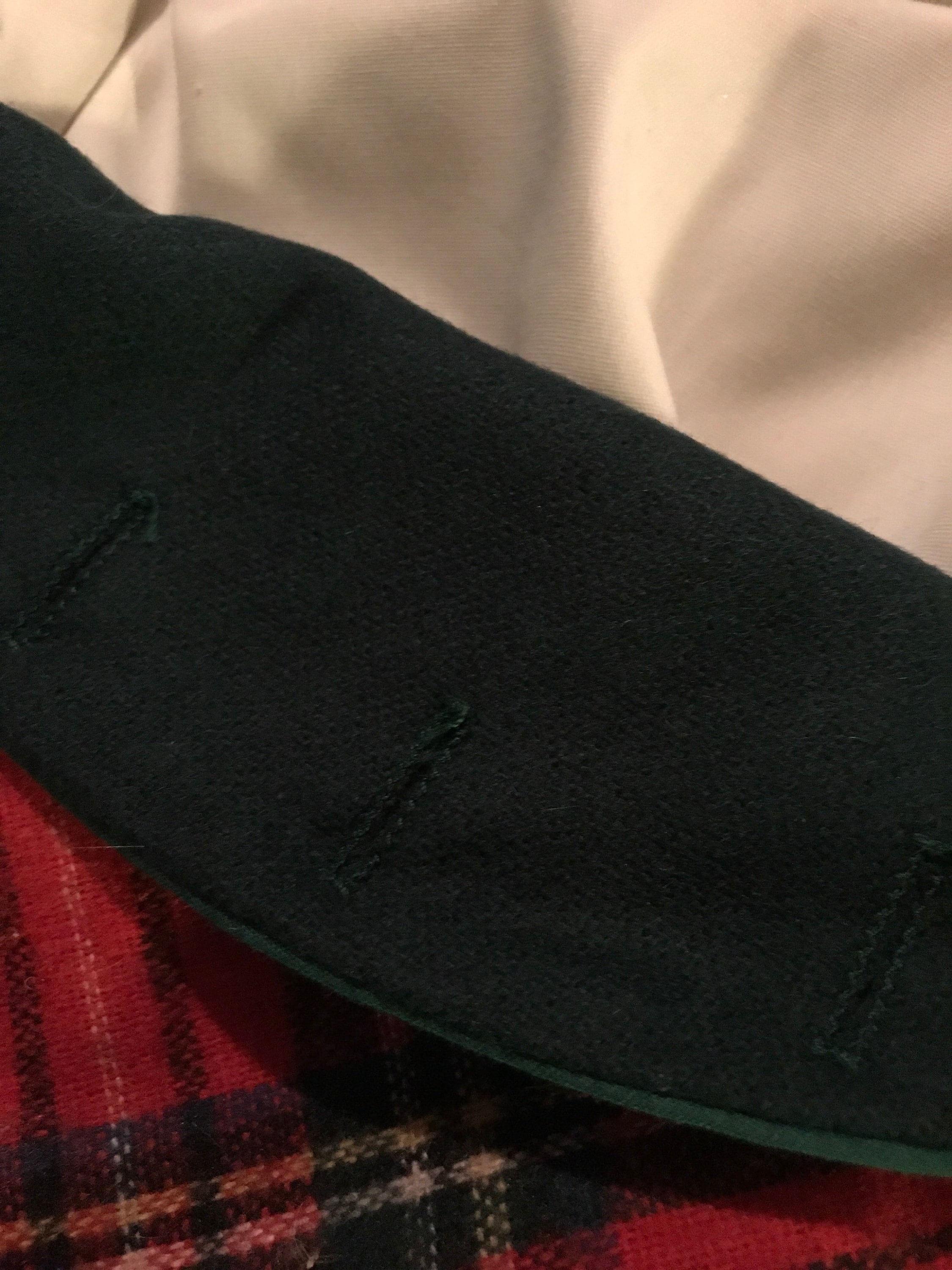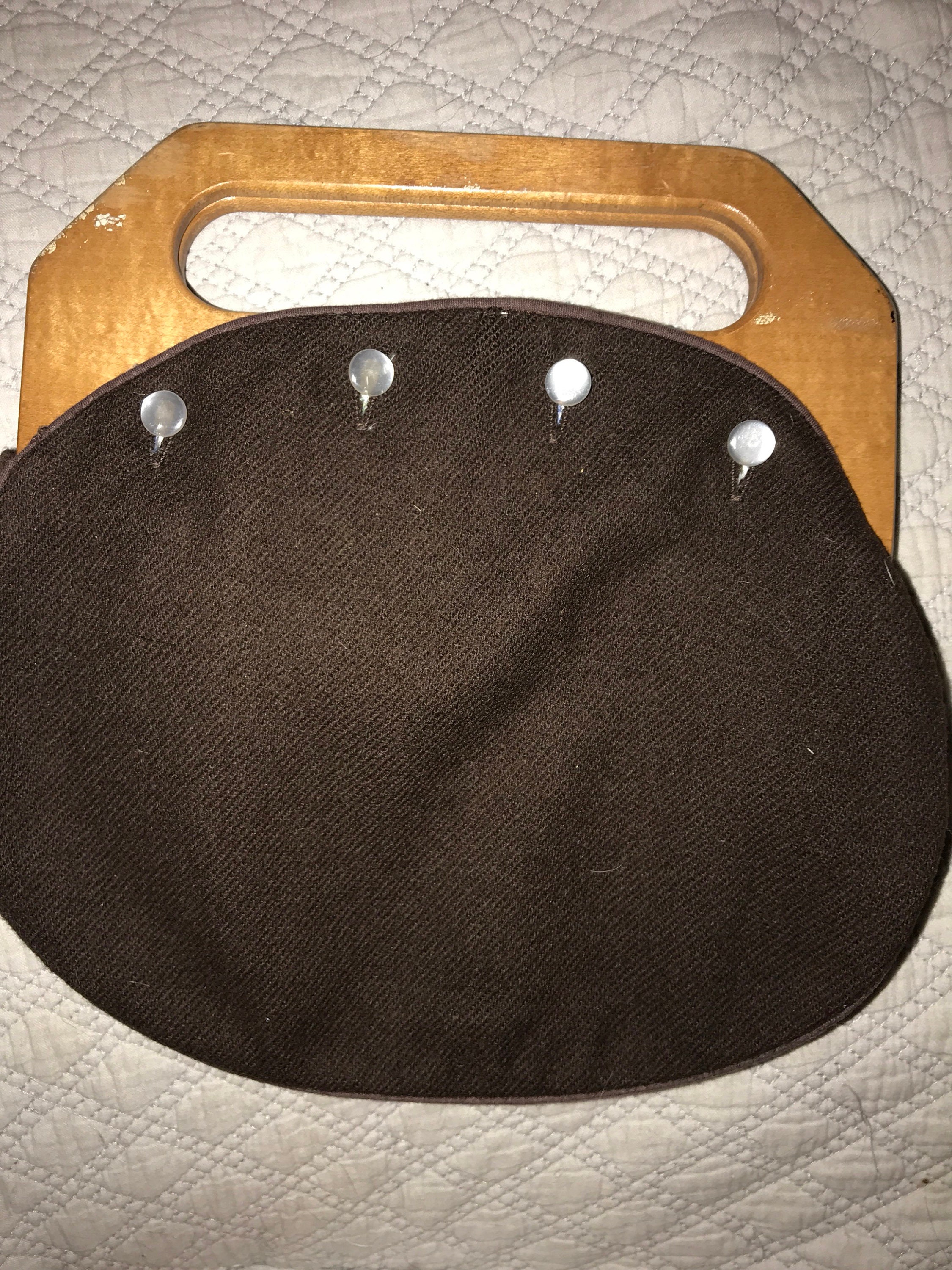 This is such a cute Jeannie Bouchever Bermuda bag with a light wood wooden handle. This purse comes with 6 different covers, one is khaki corduroy, navy blue corduroy, dark brown wool, dark gray wool, red plaid wool, and the fantastic one from the first photo. So many cute styles to choose from! It’s in good vintage condition.
