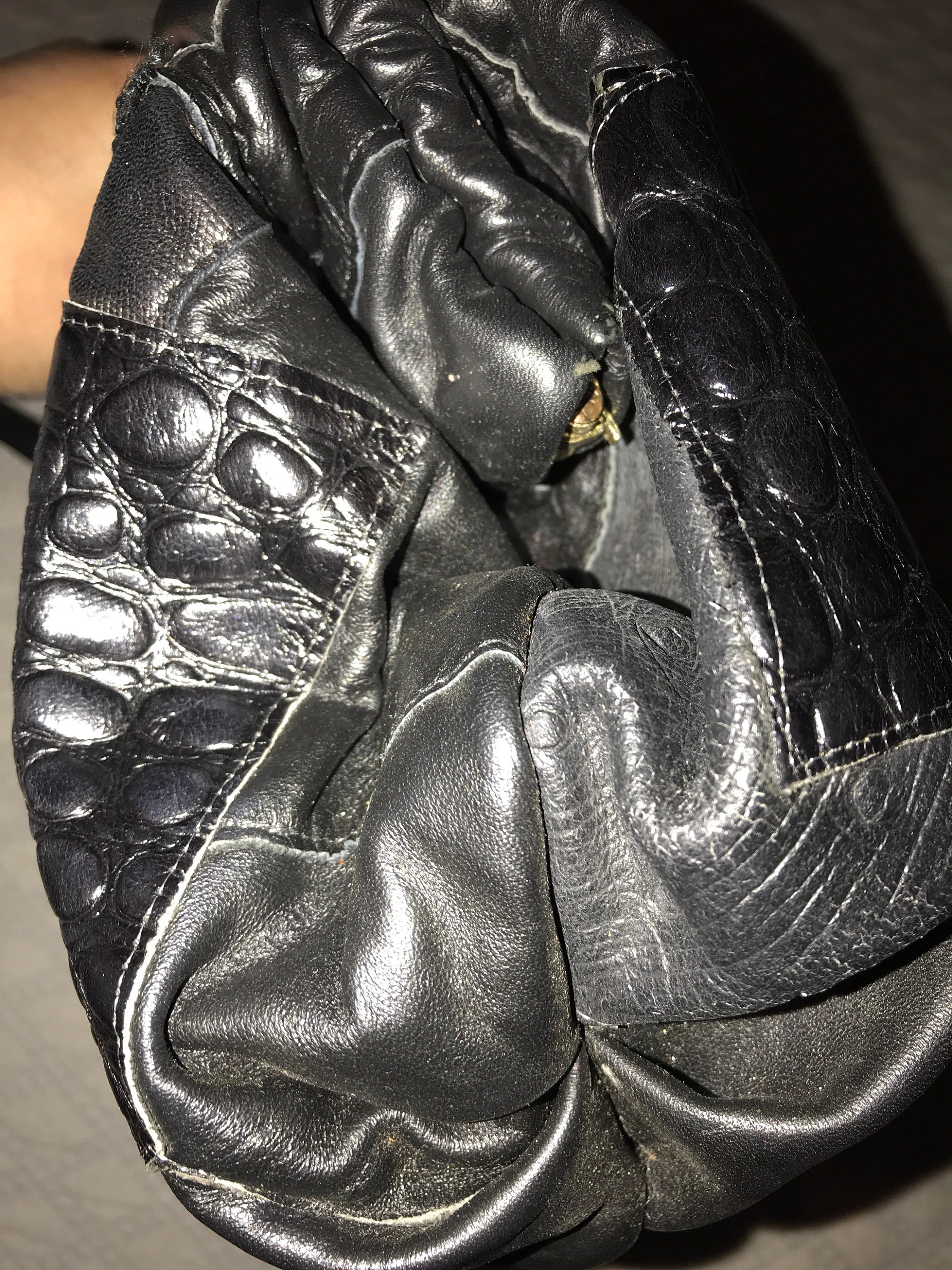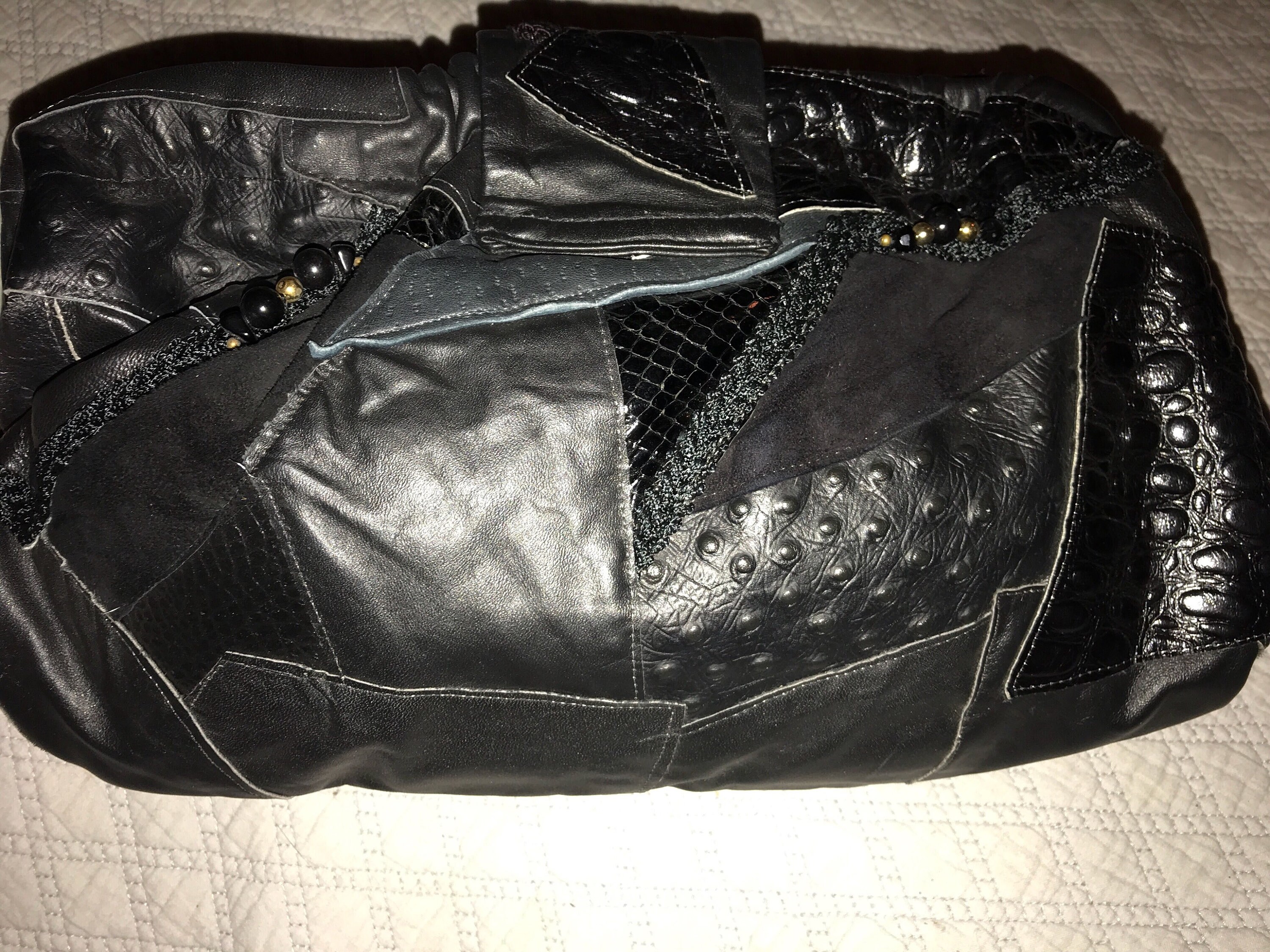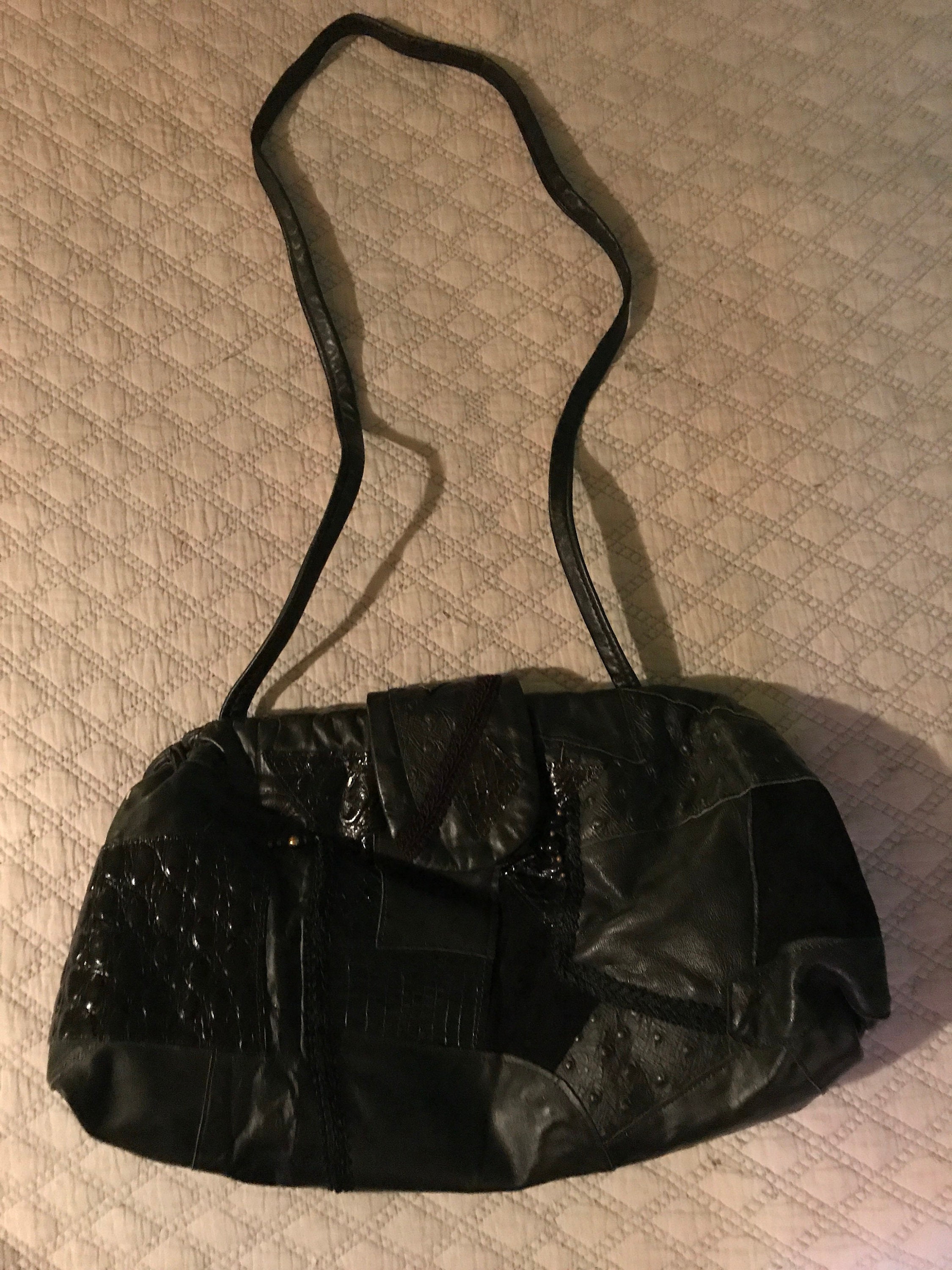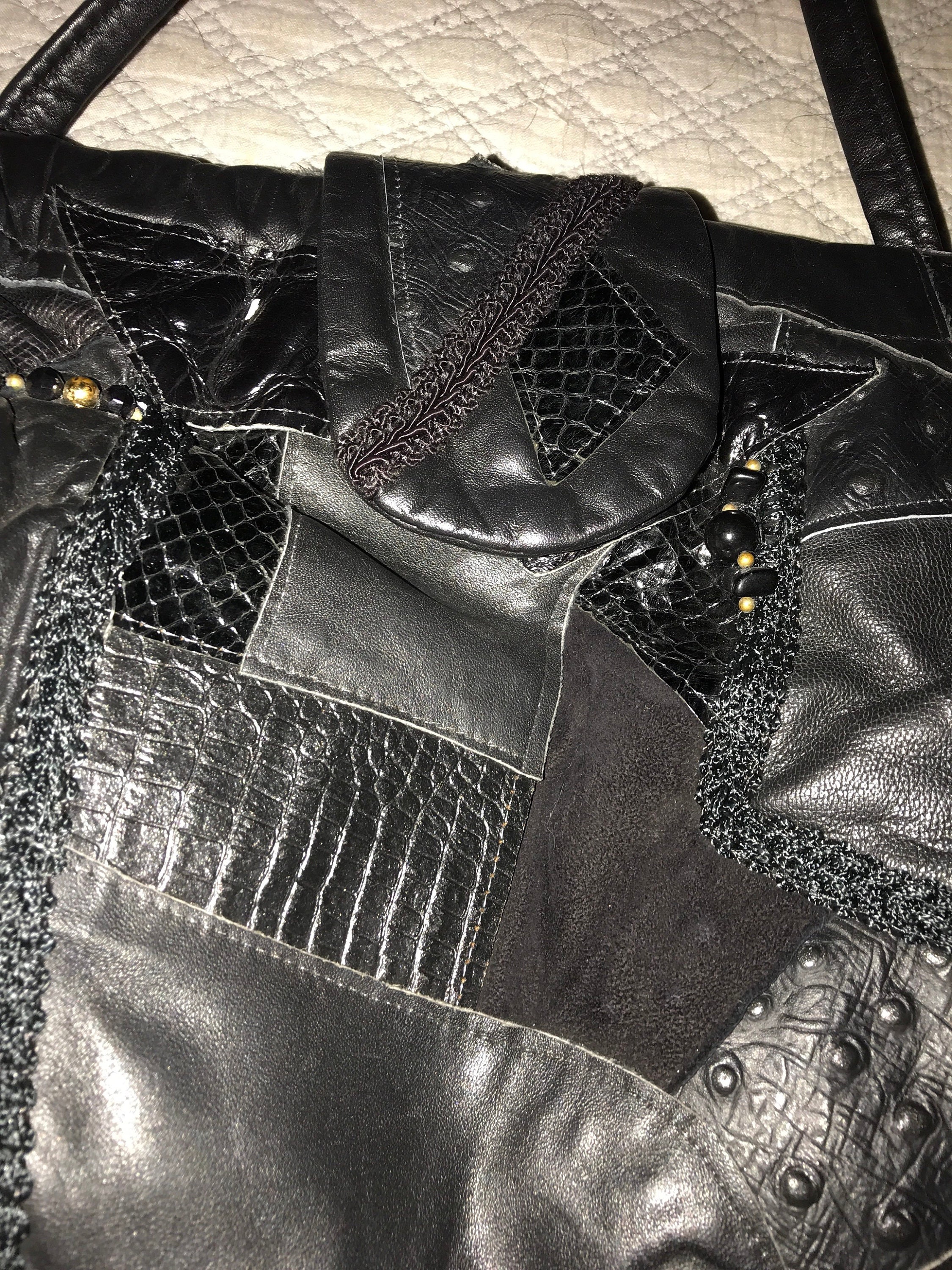 Very nice 80's patchwork black leather purse! The different leathers are sewn together in an all over pattern, with a few gold beads, and beads and braids of fabric mixed in. It's so fantasticly amazing! It's in great vintage condition.