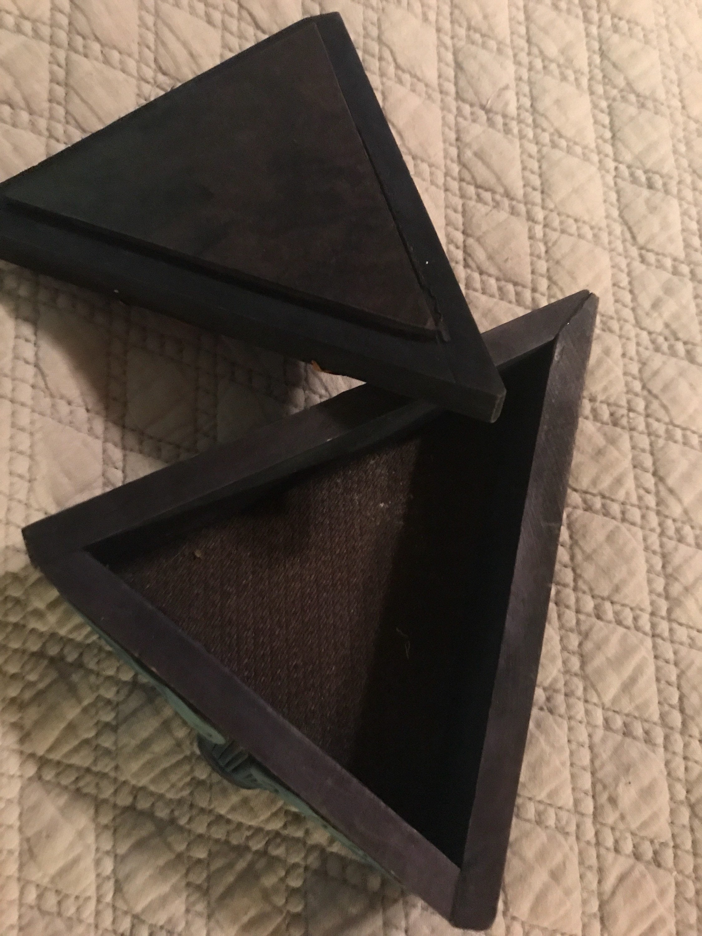 This is super cool! It’s a triangle shaped box (I assume hand made) with what looks like clay used on it to make the cool sun on the lid and the “Costa Rica” on each side. It’s in good vintage condition.