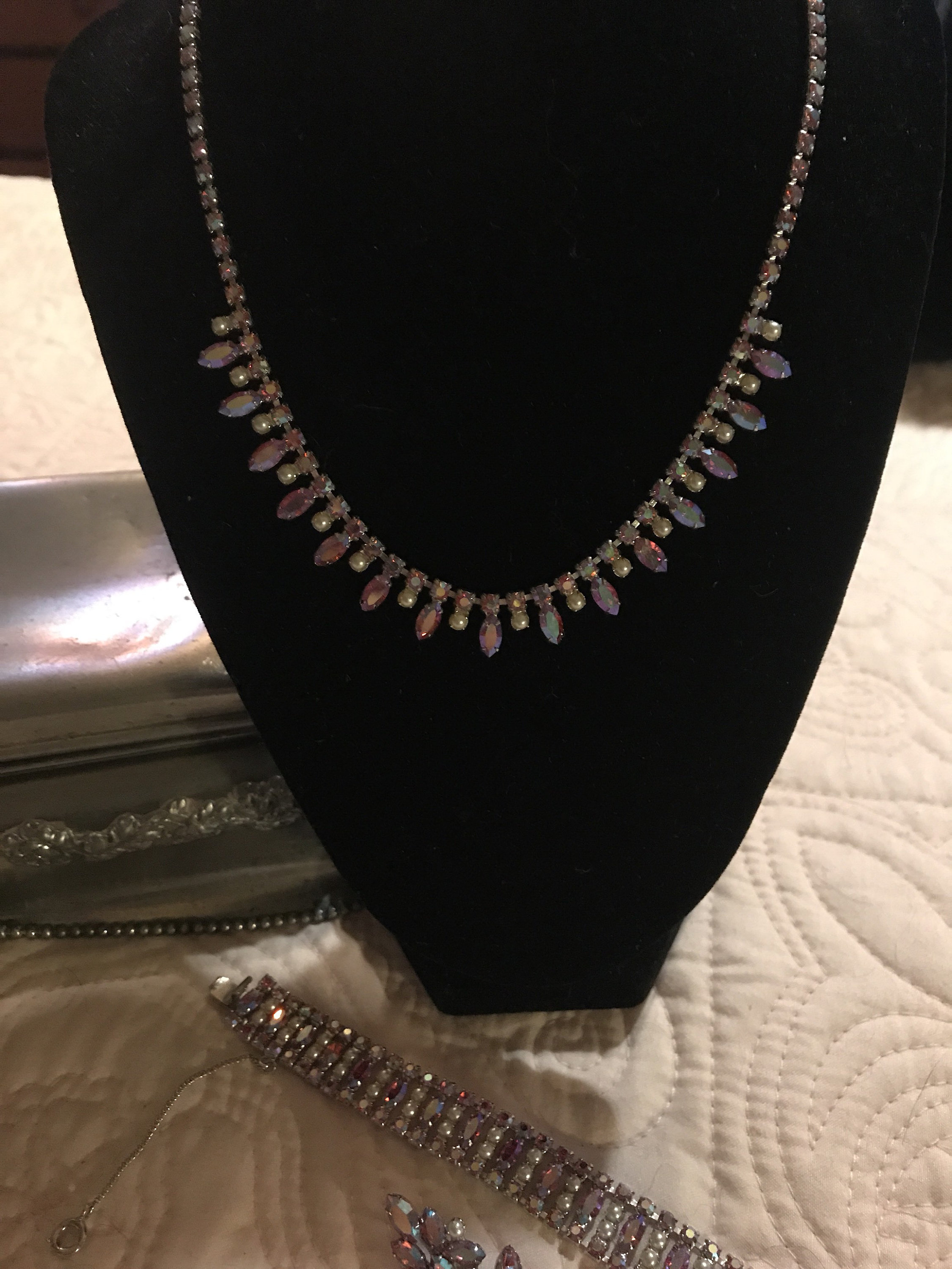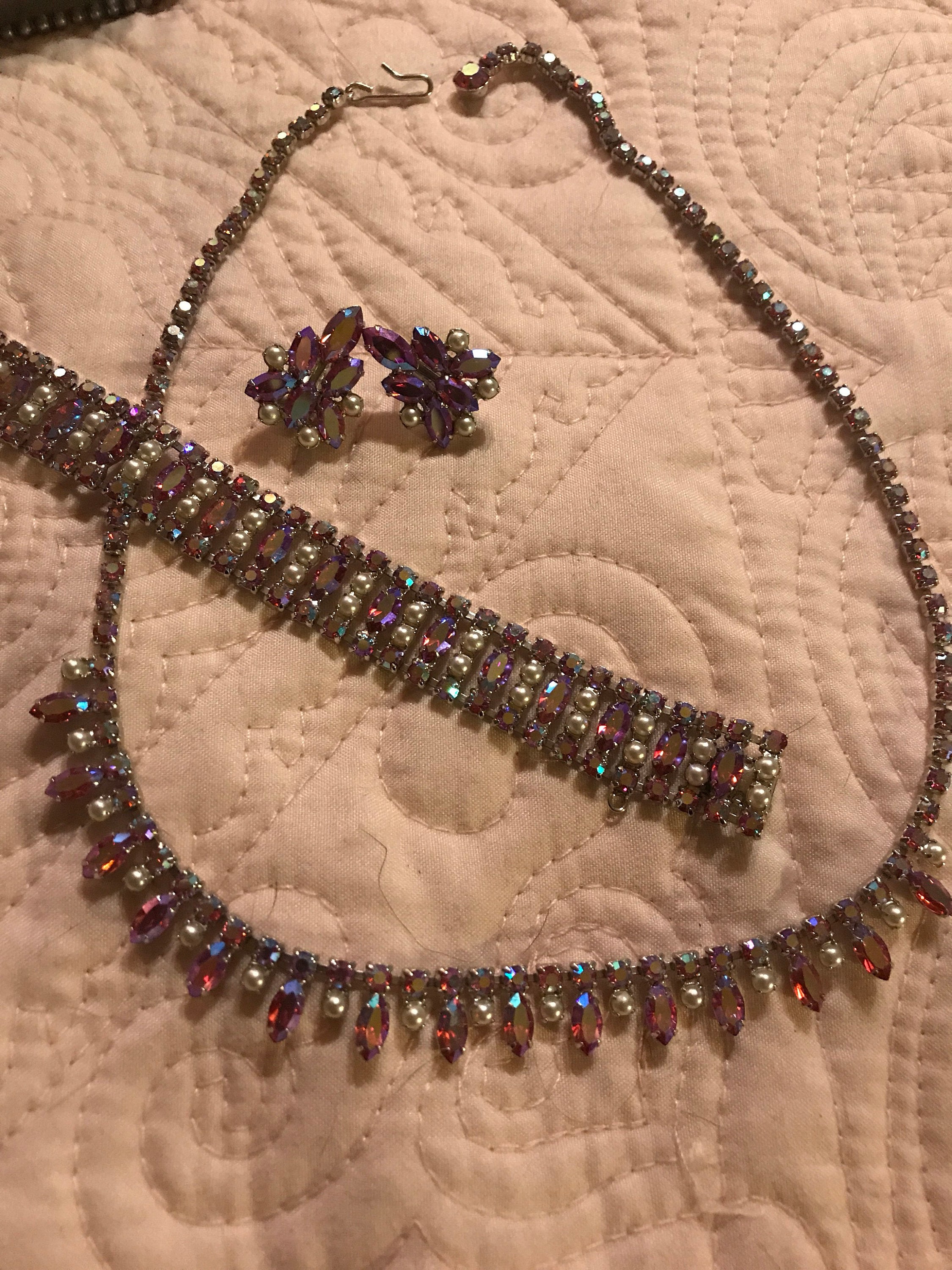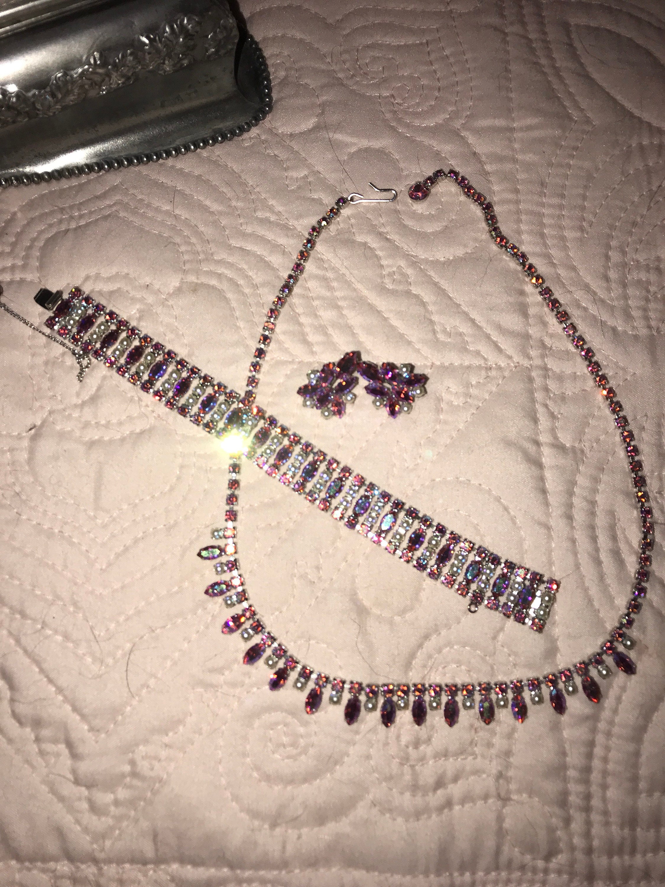 This is a Gorgeous Amazing b. David rhinestone necklace, bracelet and clip-on earrings. The clip on earrings are nobody’s favorite but if you wanted you could turn them into posts. This set needs to be worn, it could be worn to a prom, a ball, on tv, a flower girl in a vintage theme wedding or a flower girl in a princess theme wedding. So many ways it could be worn. It’s stunning. In good vintage condition.