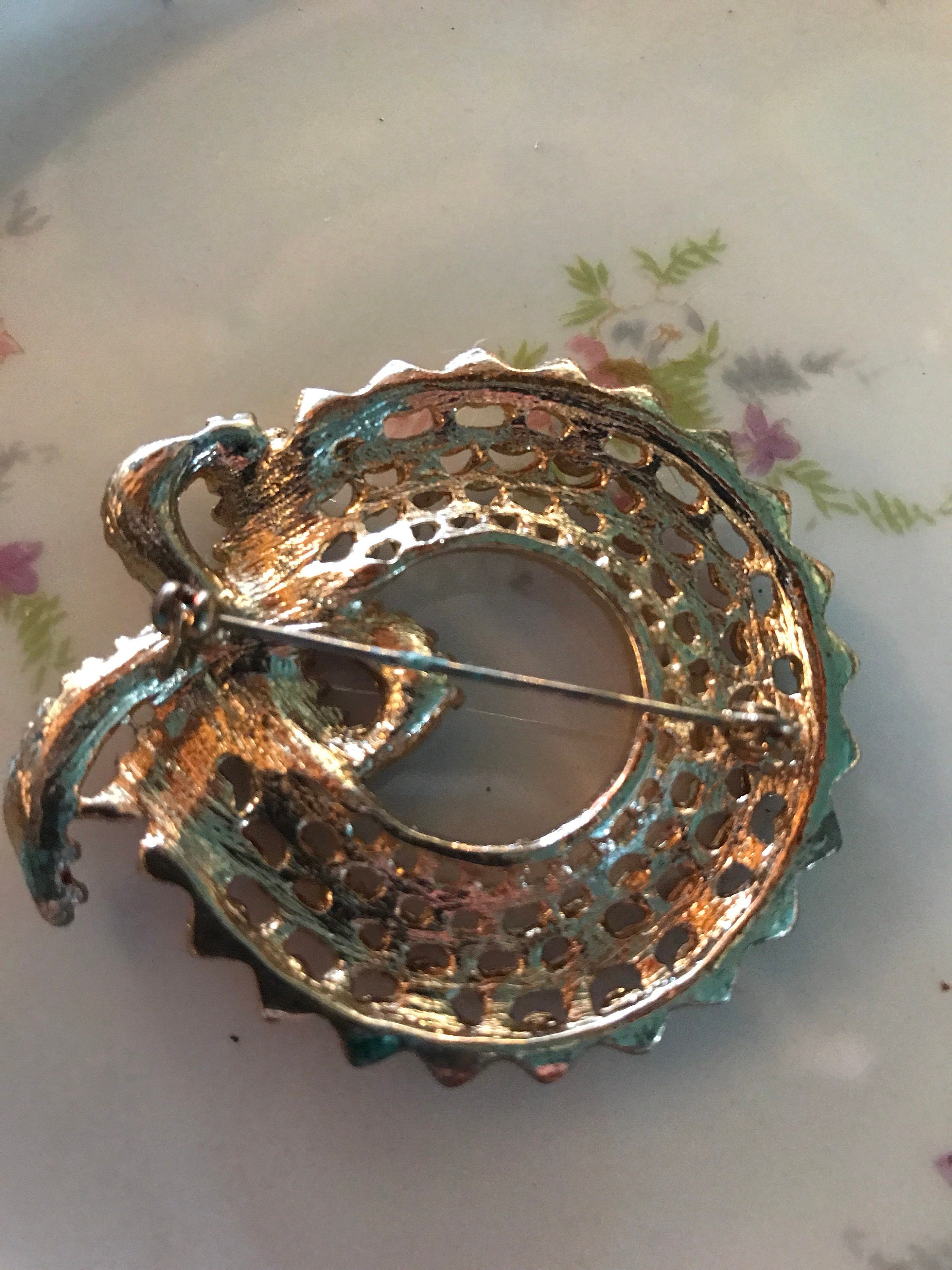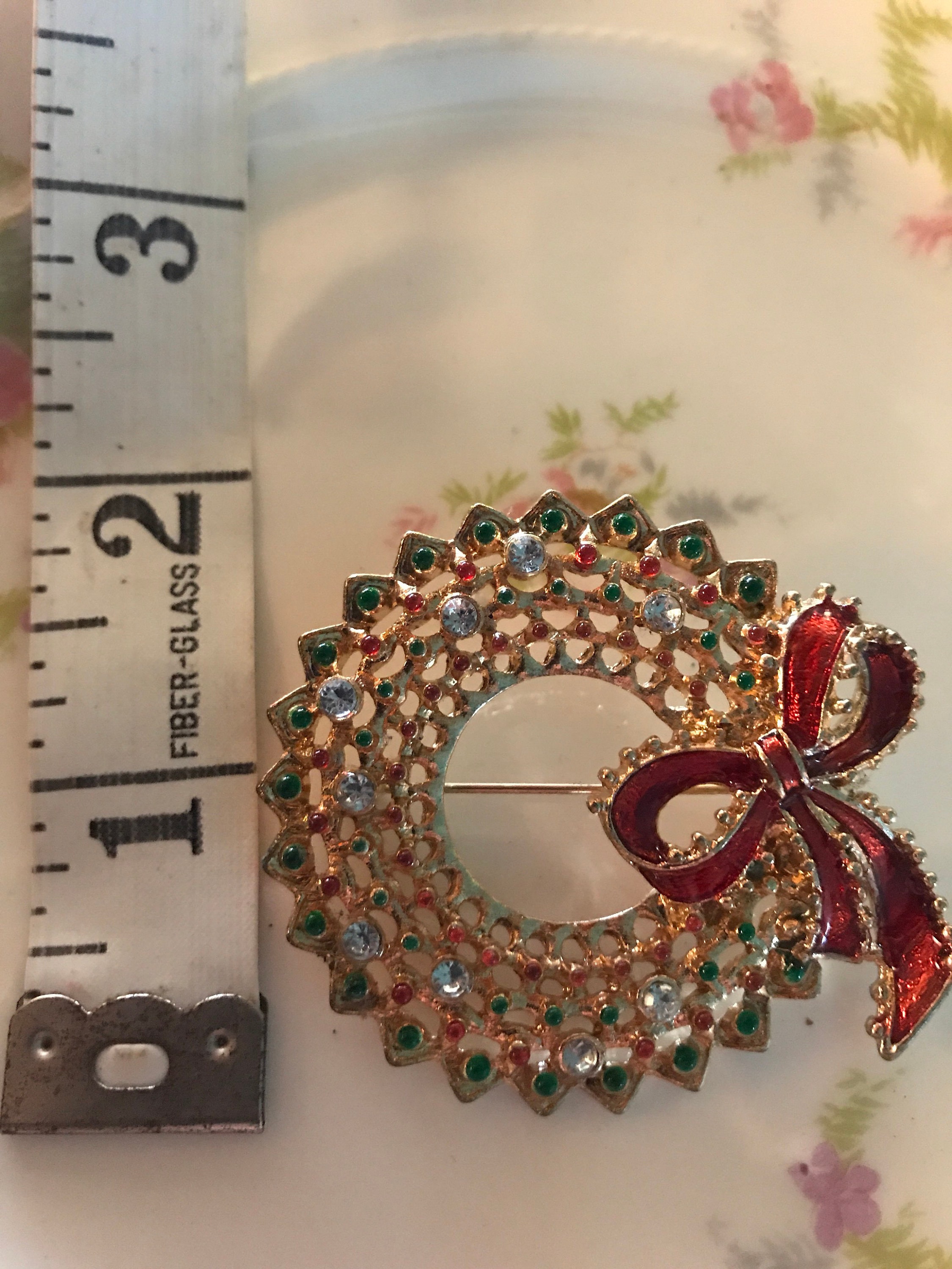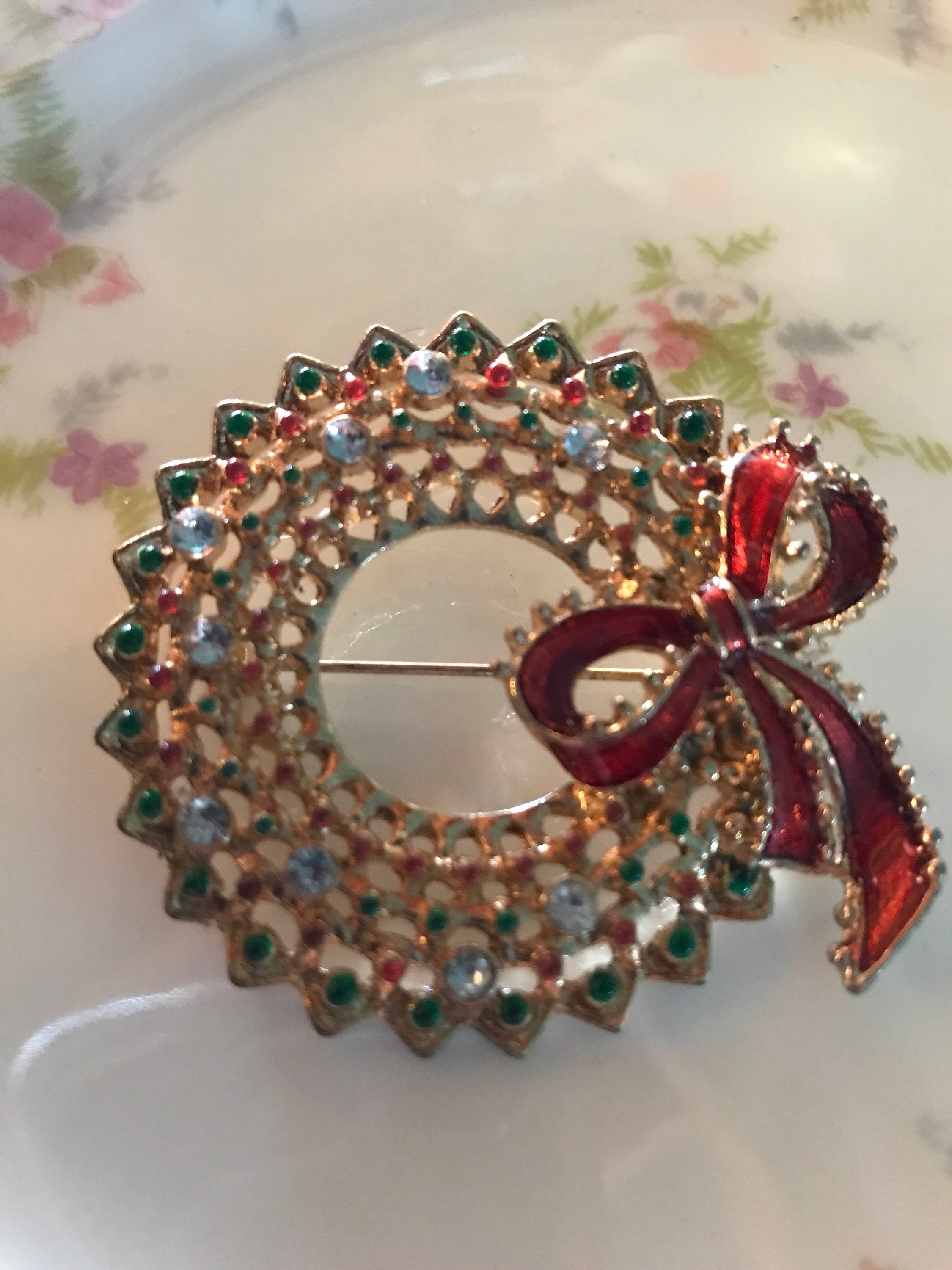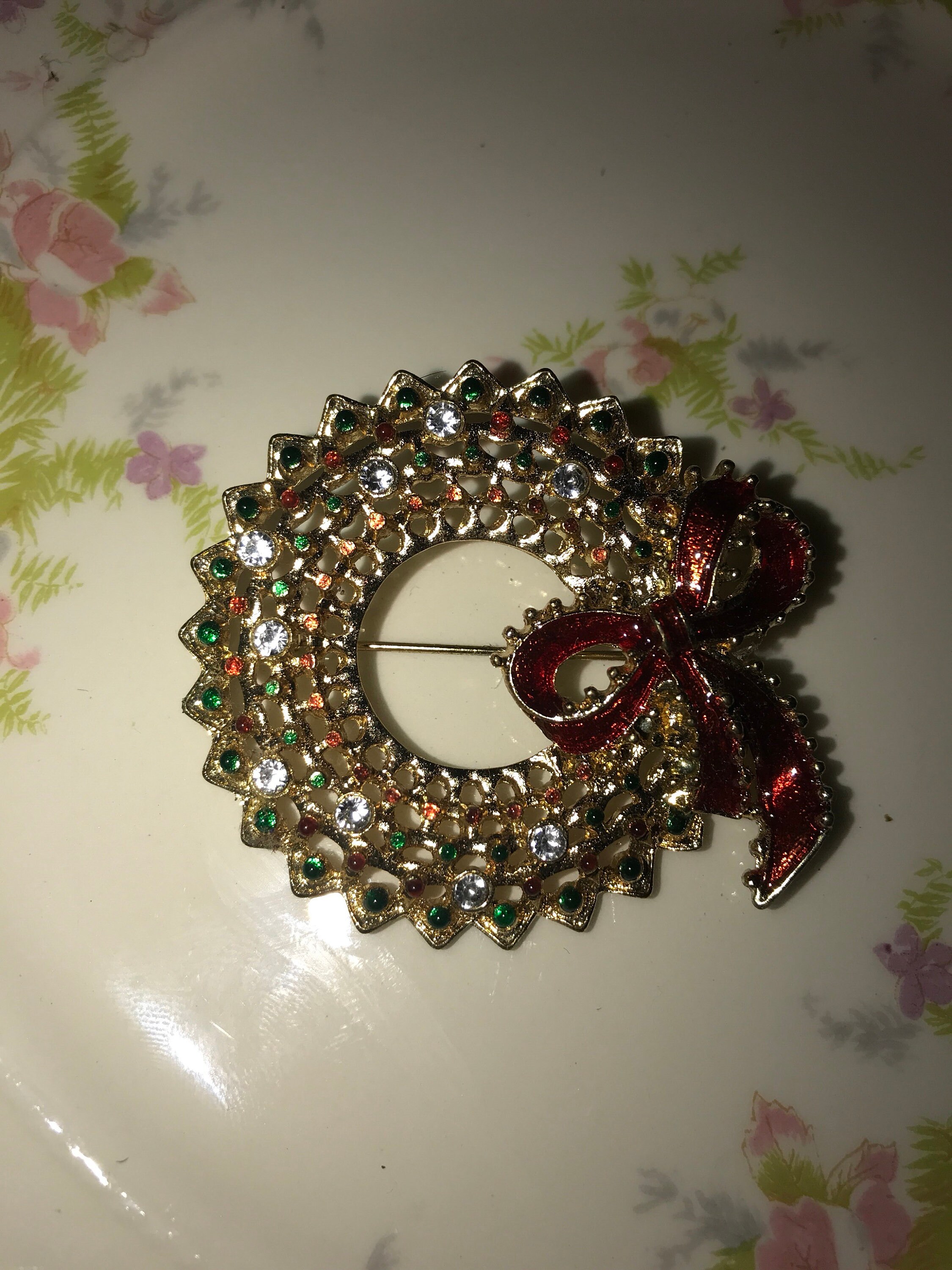 This is a really pretty unsigned gold, red and green rhinestone wreath brooch. It’s in good vintage condition.