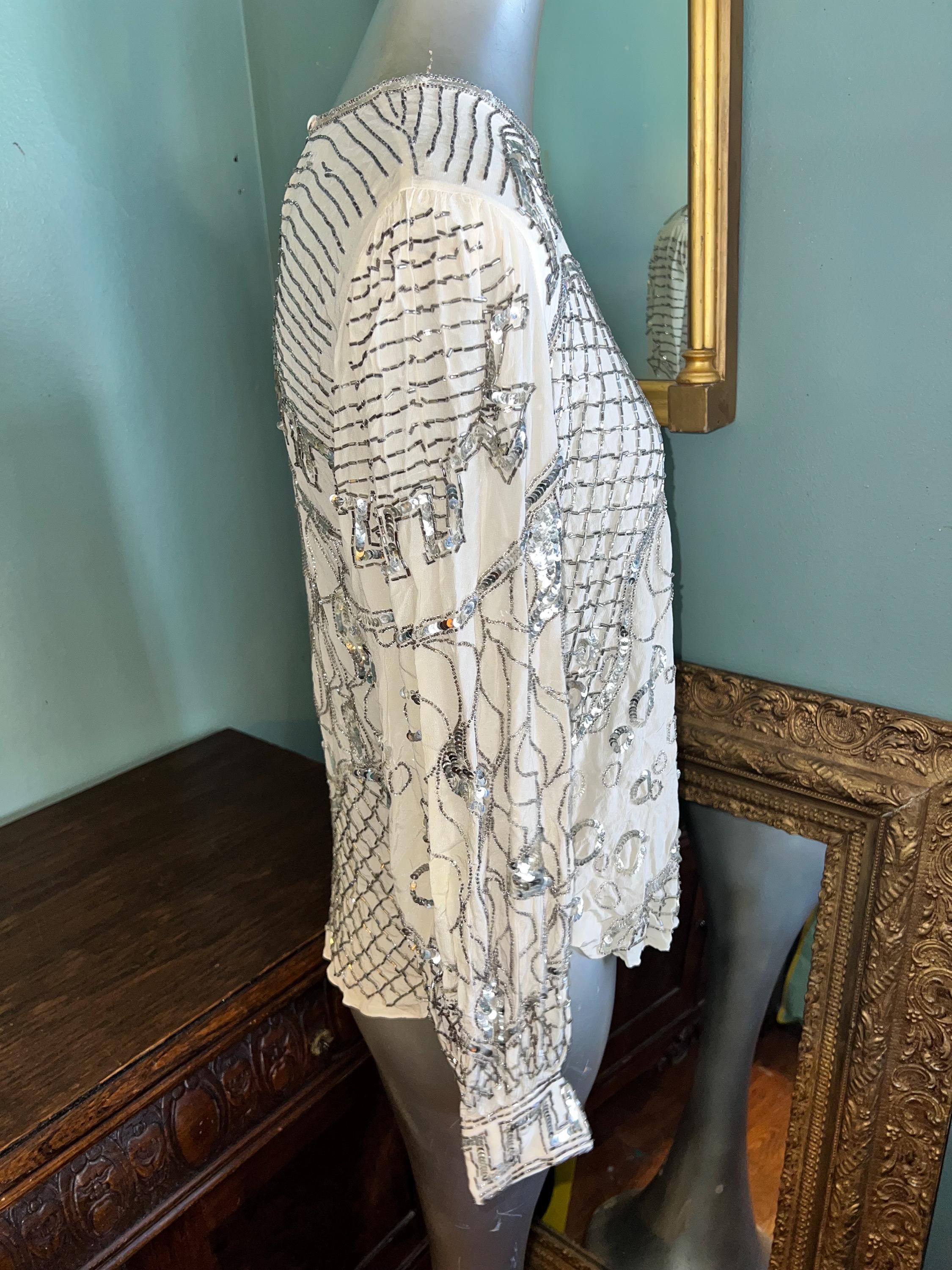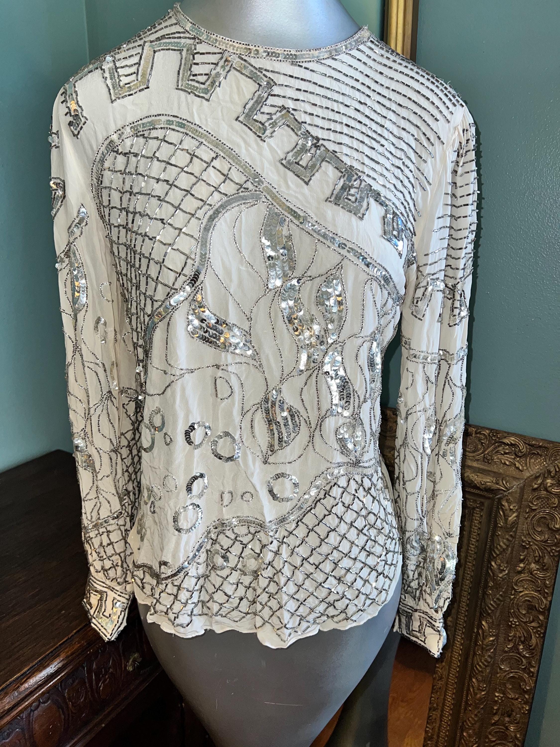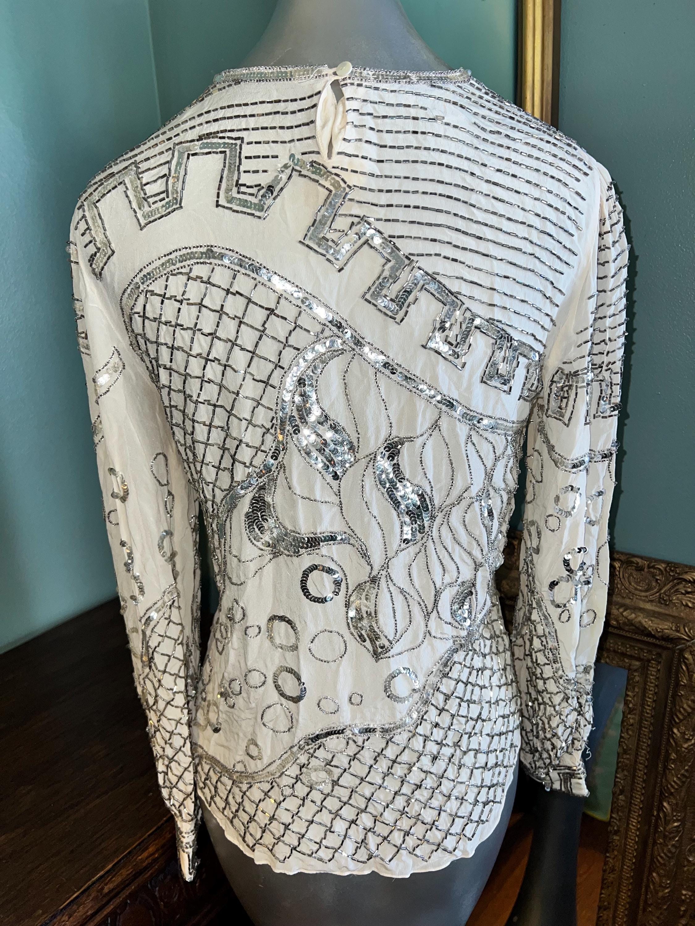 I love sequins and bling! This is a gorgeous 100% silk sequined and beaded white long sleeved Argenti shirt. It is white with a gorgeous design of silver beads and sequins, the patterns are great. It’s in good vintage condition, there are two spots that I found with missing or almost missing sequins, I took photos of them but one is on back of the neck and the other is on the back of the left arm.