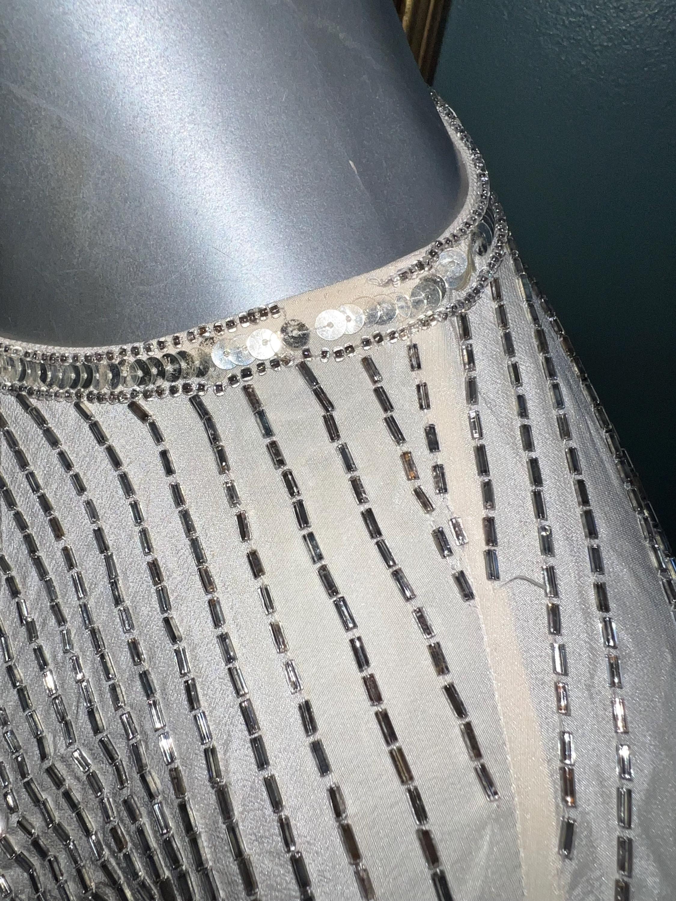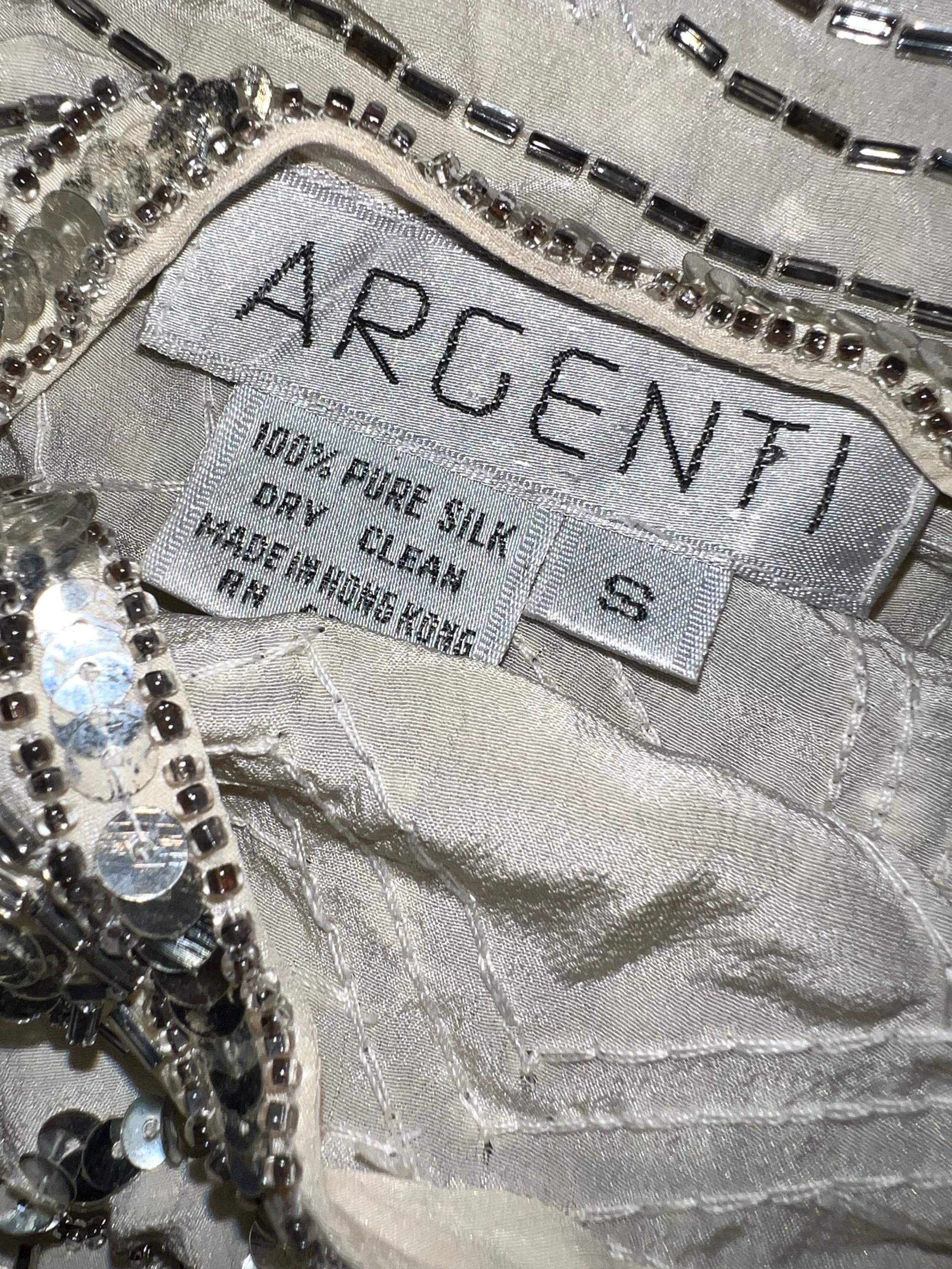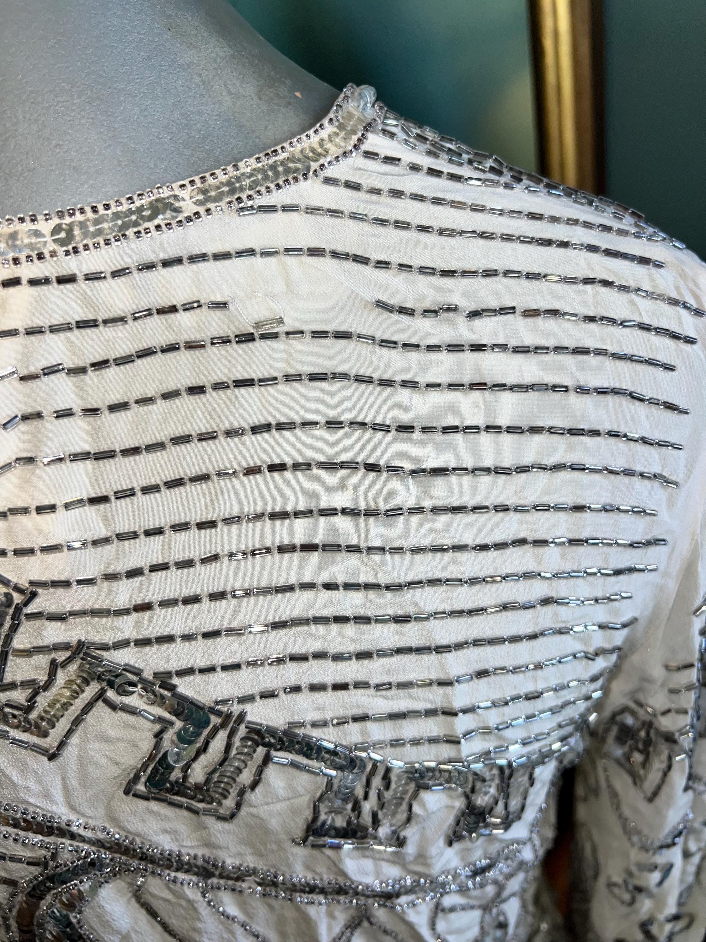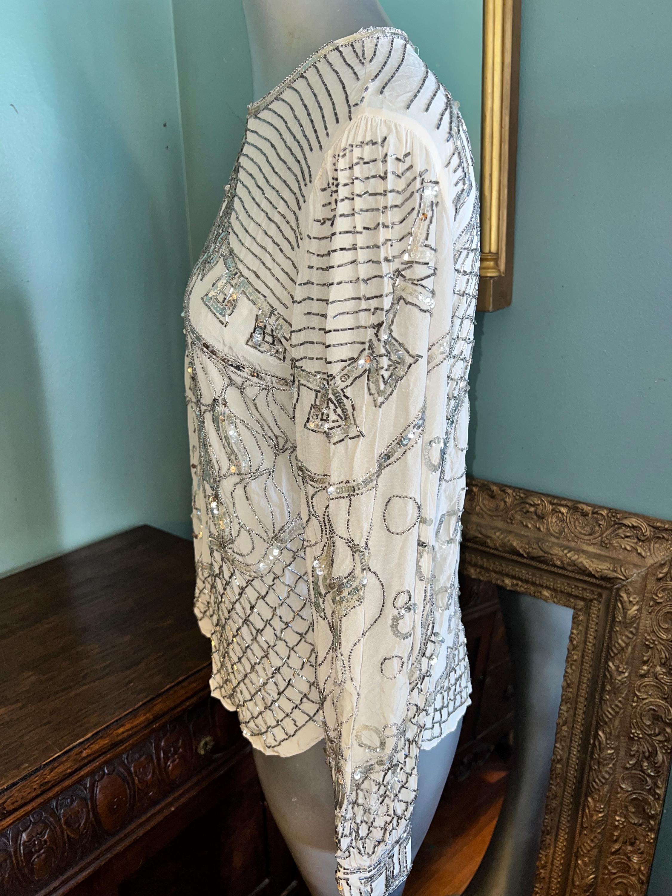 I love sequins and bling! This is a gorgeous 100% silk sequined and beaded white long sleeved Argenti shirt. It is white with a gorgeous design of silver beads and sequins, the patterns are great. It’s in good vintage condition, there are two spots that I found with missing or almost missing sequins, I took photos of them but one is on back of the neck and the other is on the back of the left arm.