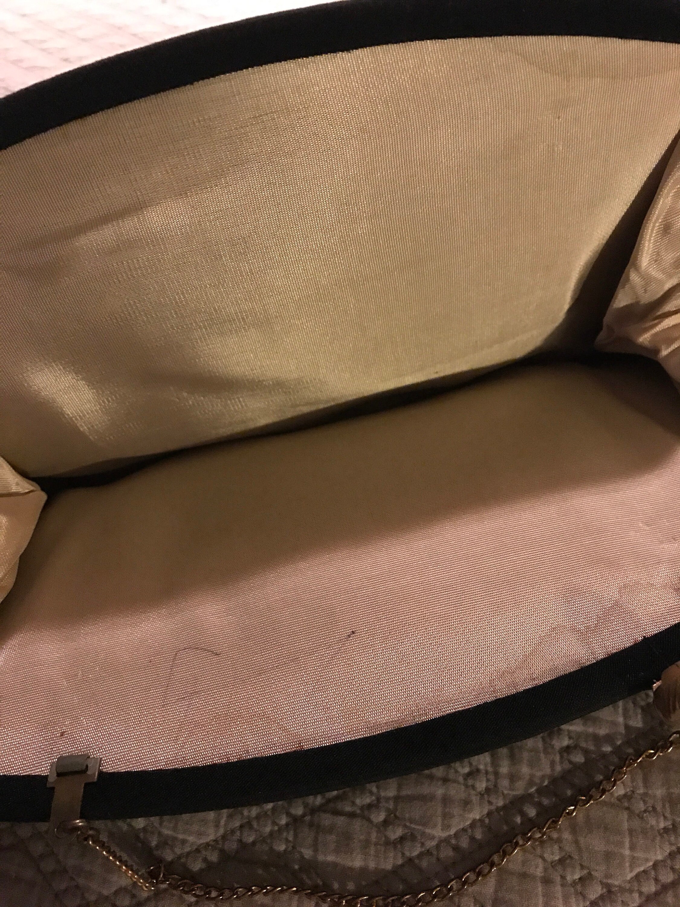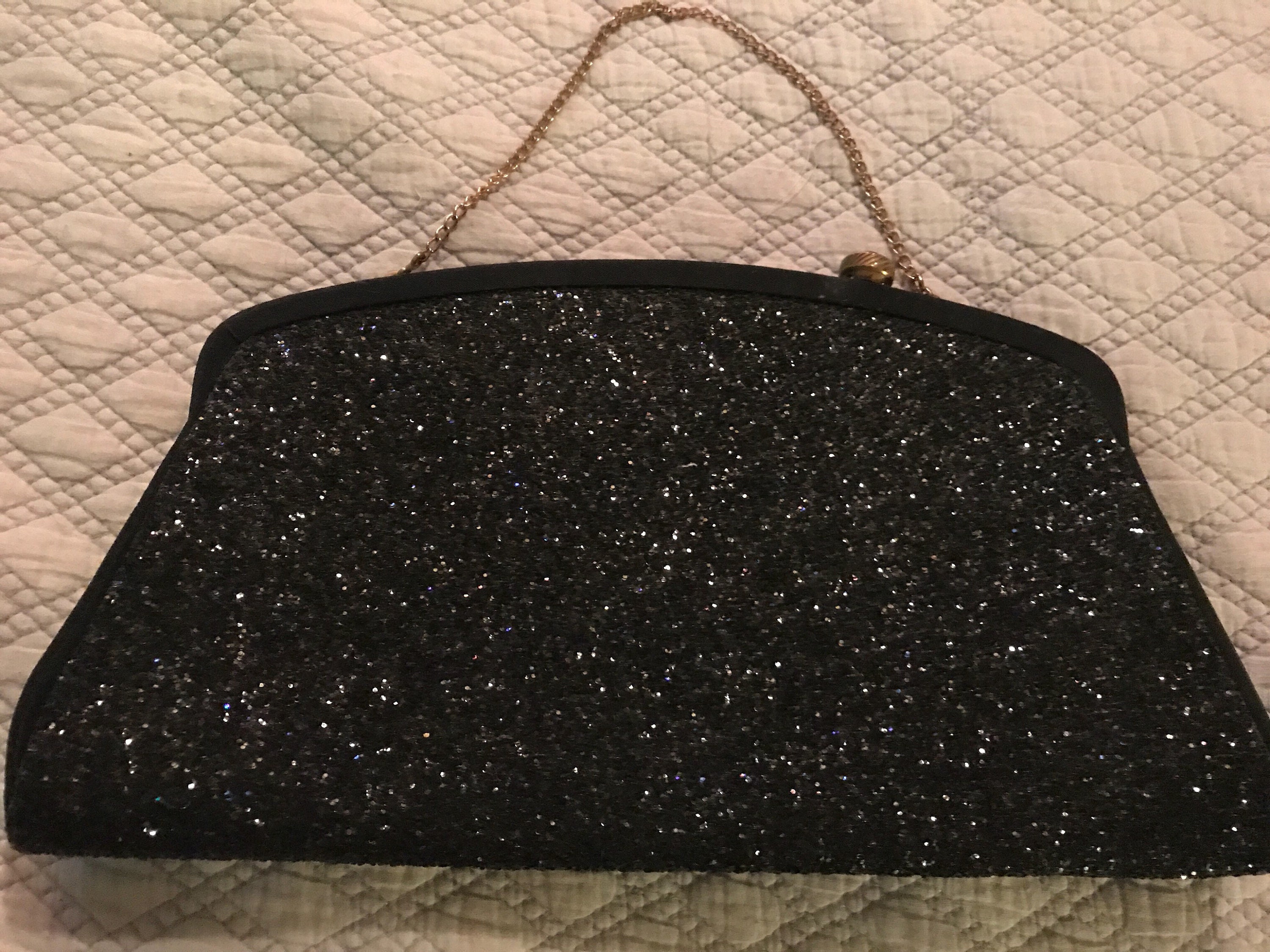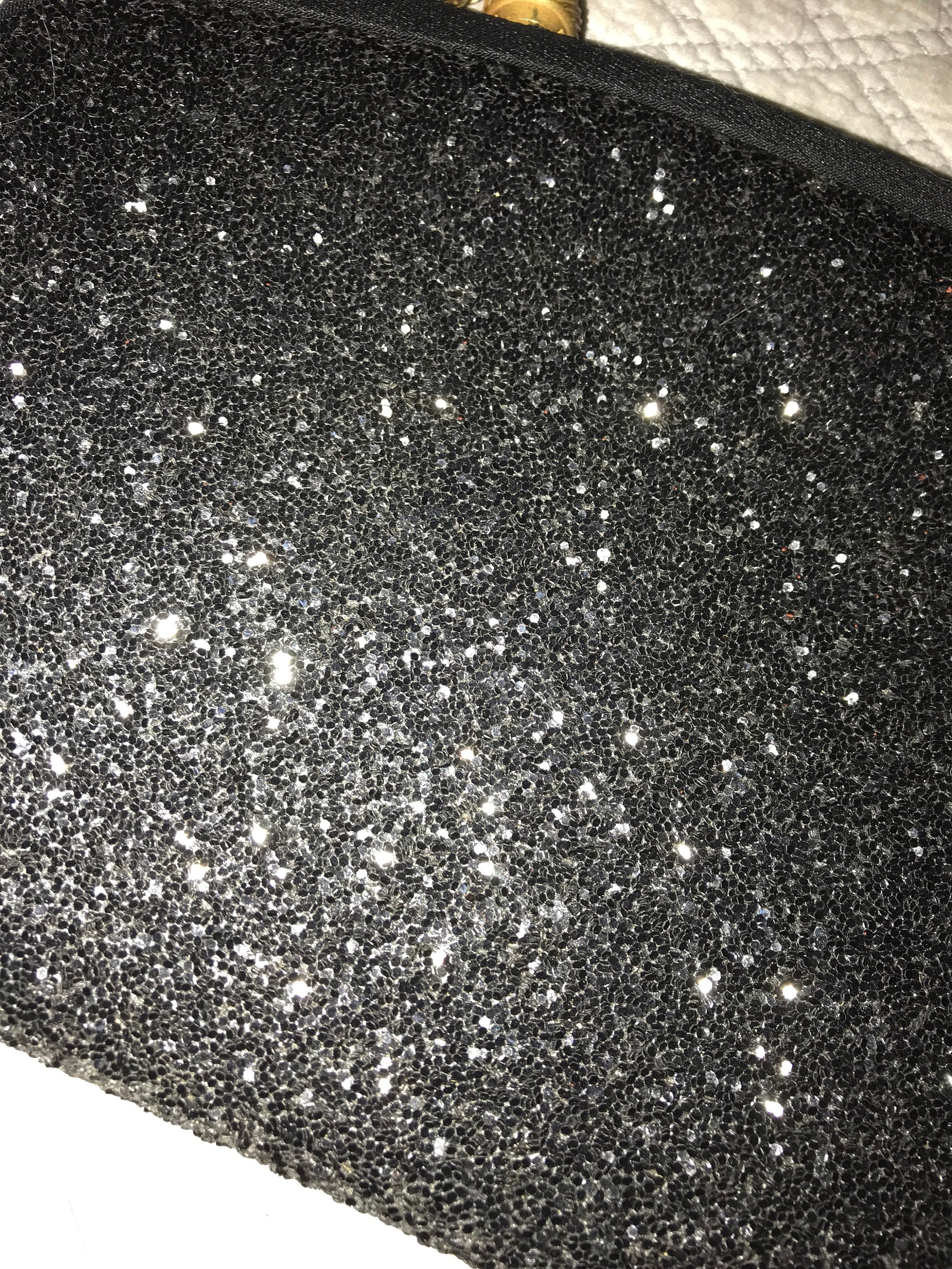 Beautiful black glittered evening bag. It has a chain handle (could be tucked inside to make it a clutch). The bag is so blingy and glittery! The inside has a bit of a water stain towards the top (see photos)it’s in good vintage condition.