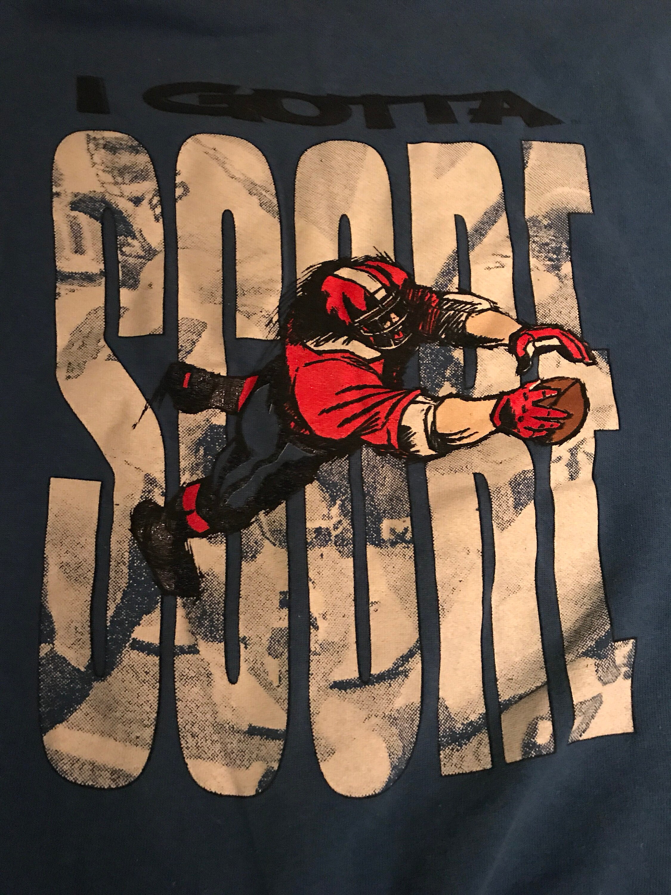 Nice vintage 90’s blue football sweatshirt. It says “I gotta SCORE” and then has a football player in mid air. It is in good vintage condition.