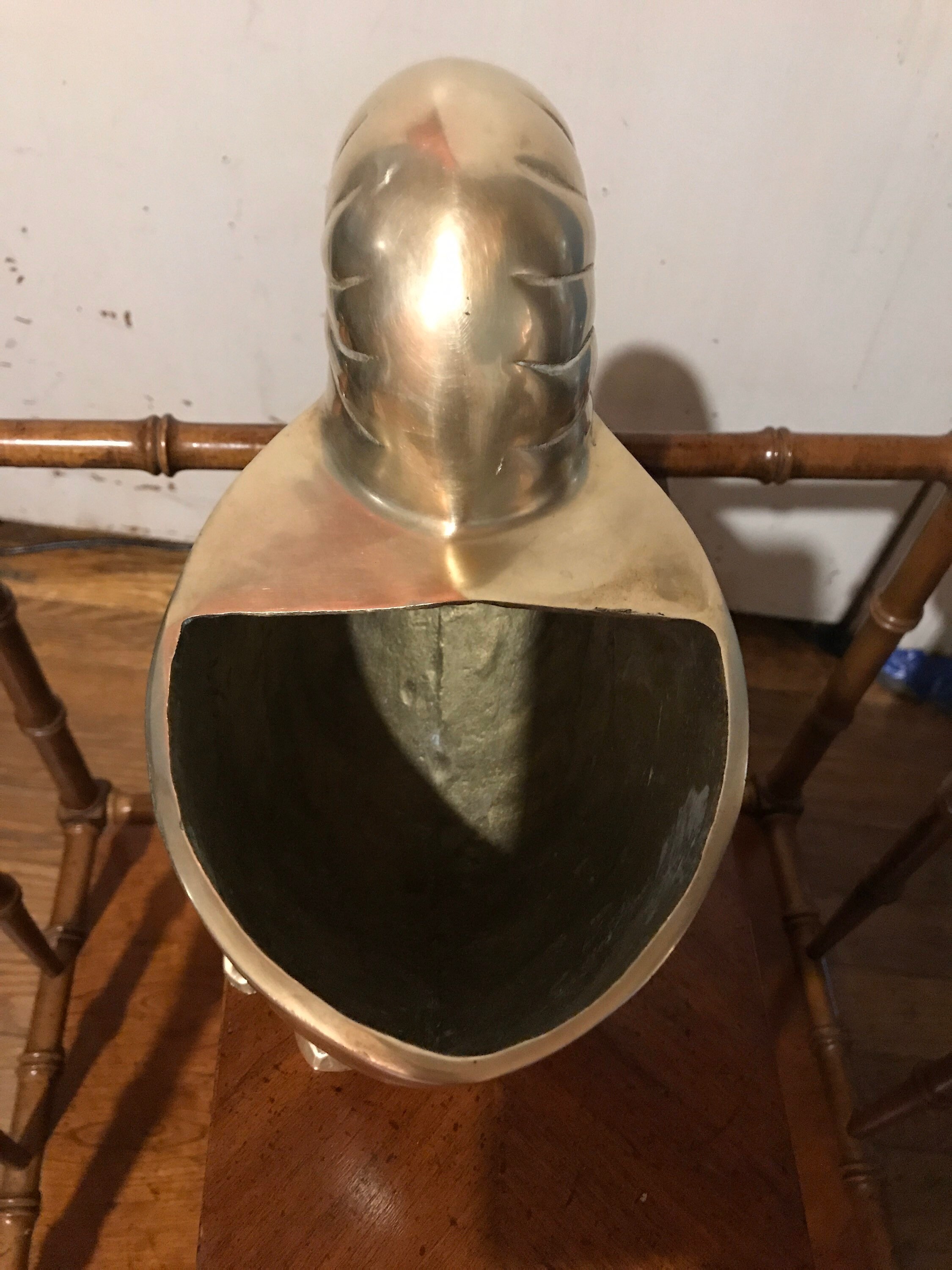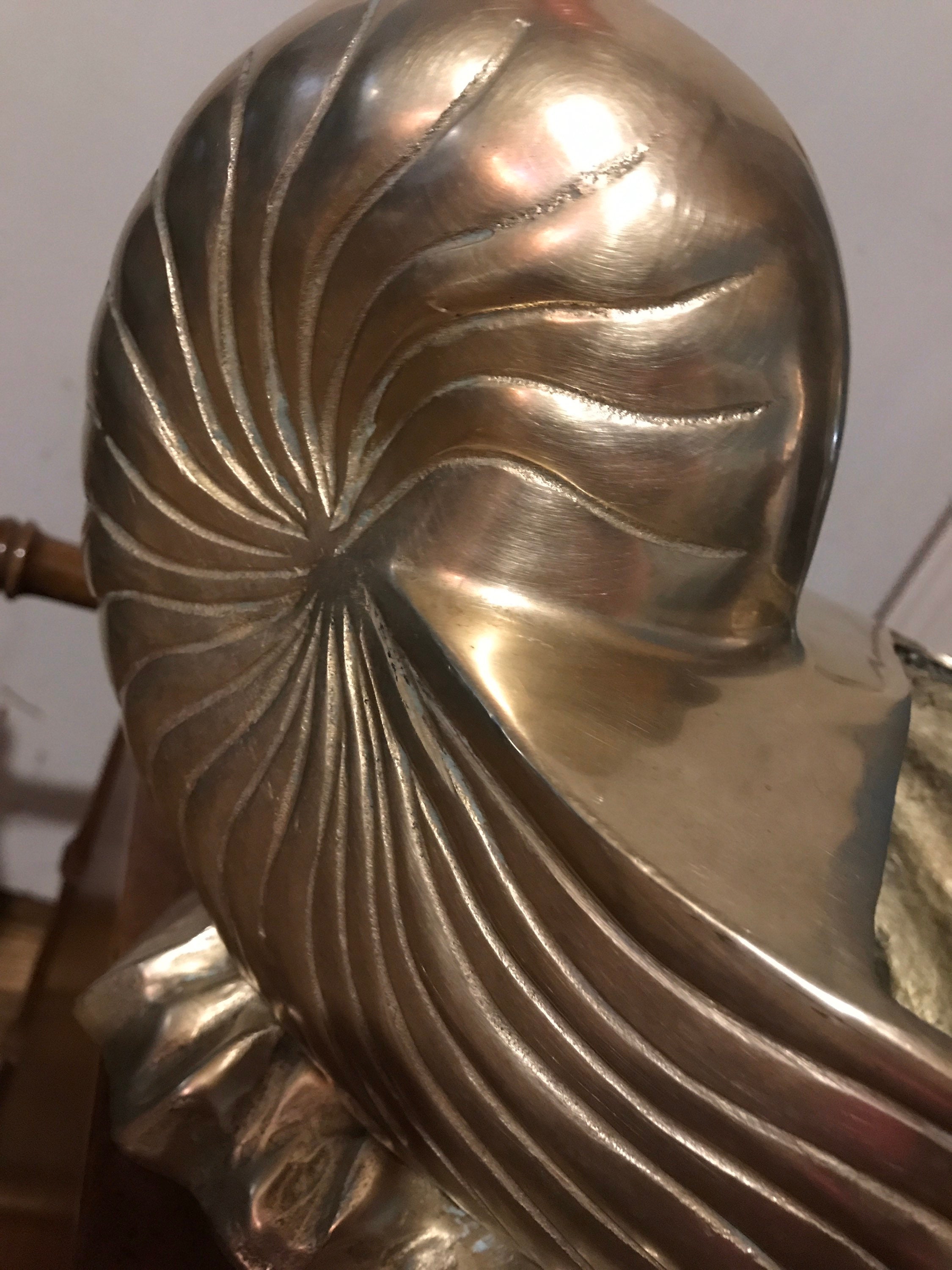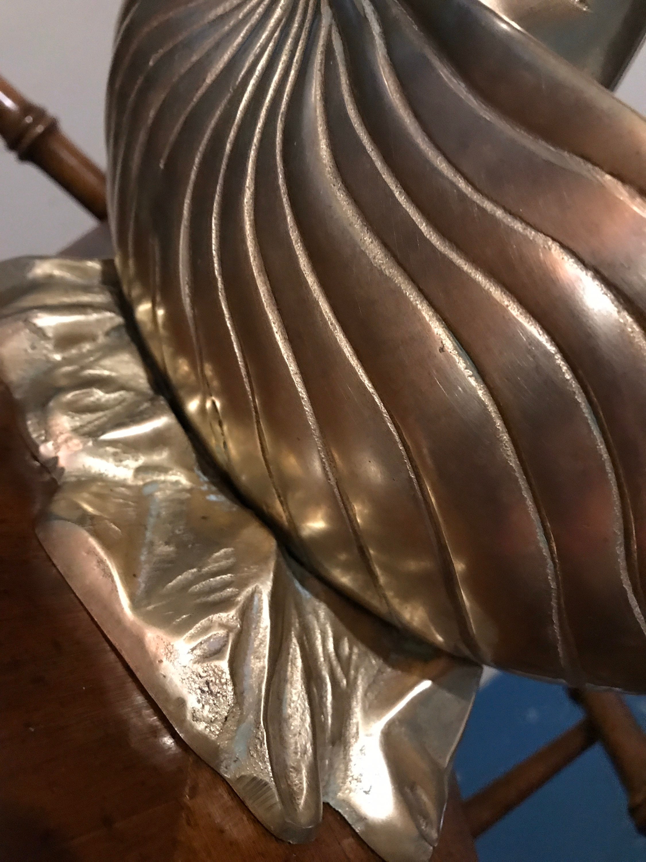 This is an awesome huge brass nautilus shell (planter) maybe it’s a planter but it could be used for many things. I would put it in my bathroom with little guest hand towels rolled up inside of it. It is shined to a gorgeous gold and It’s in great vintage condition.
