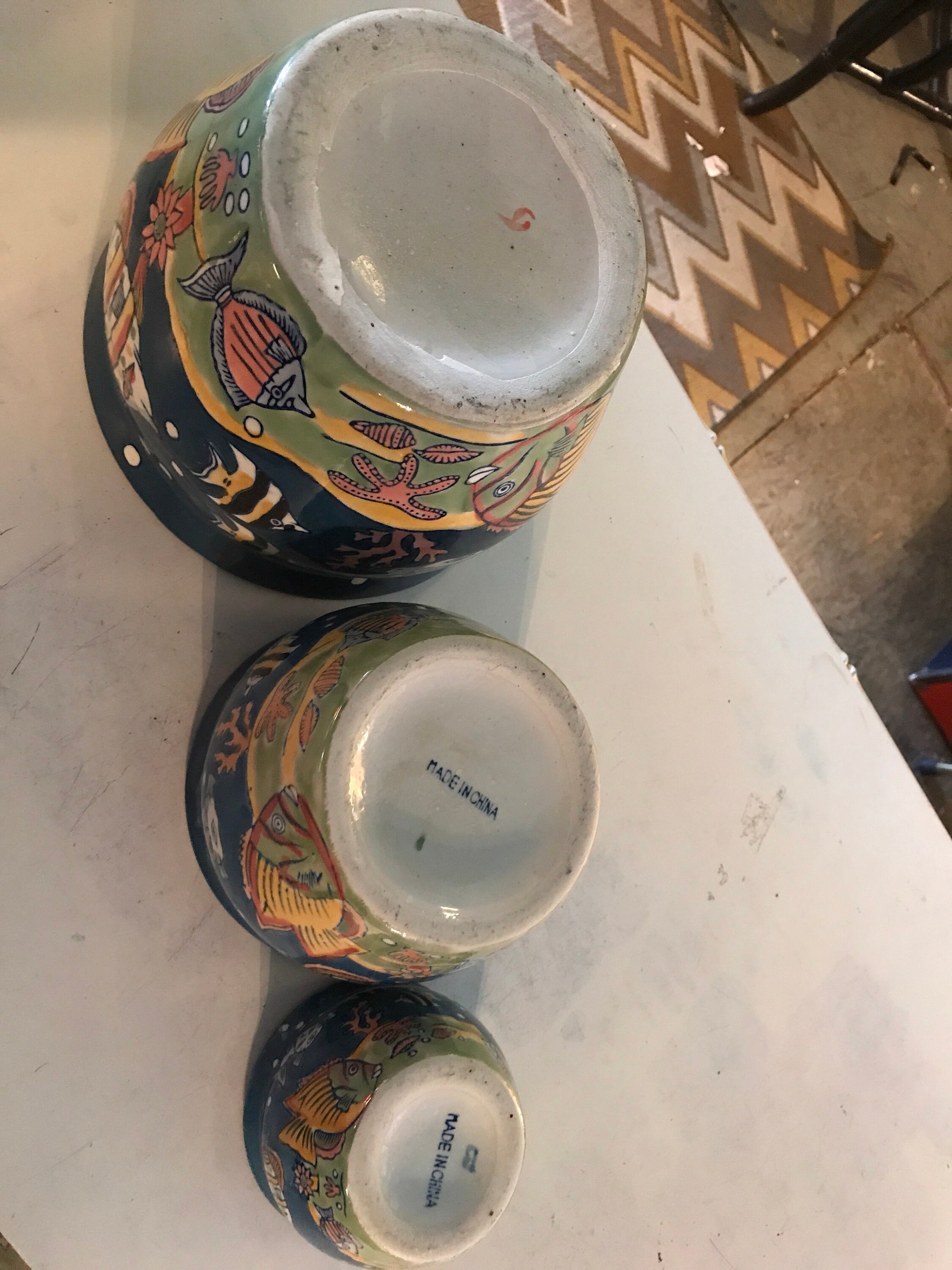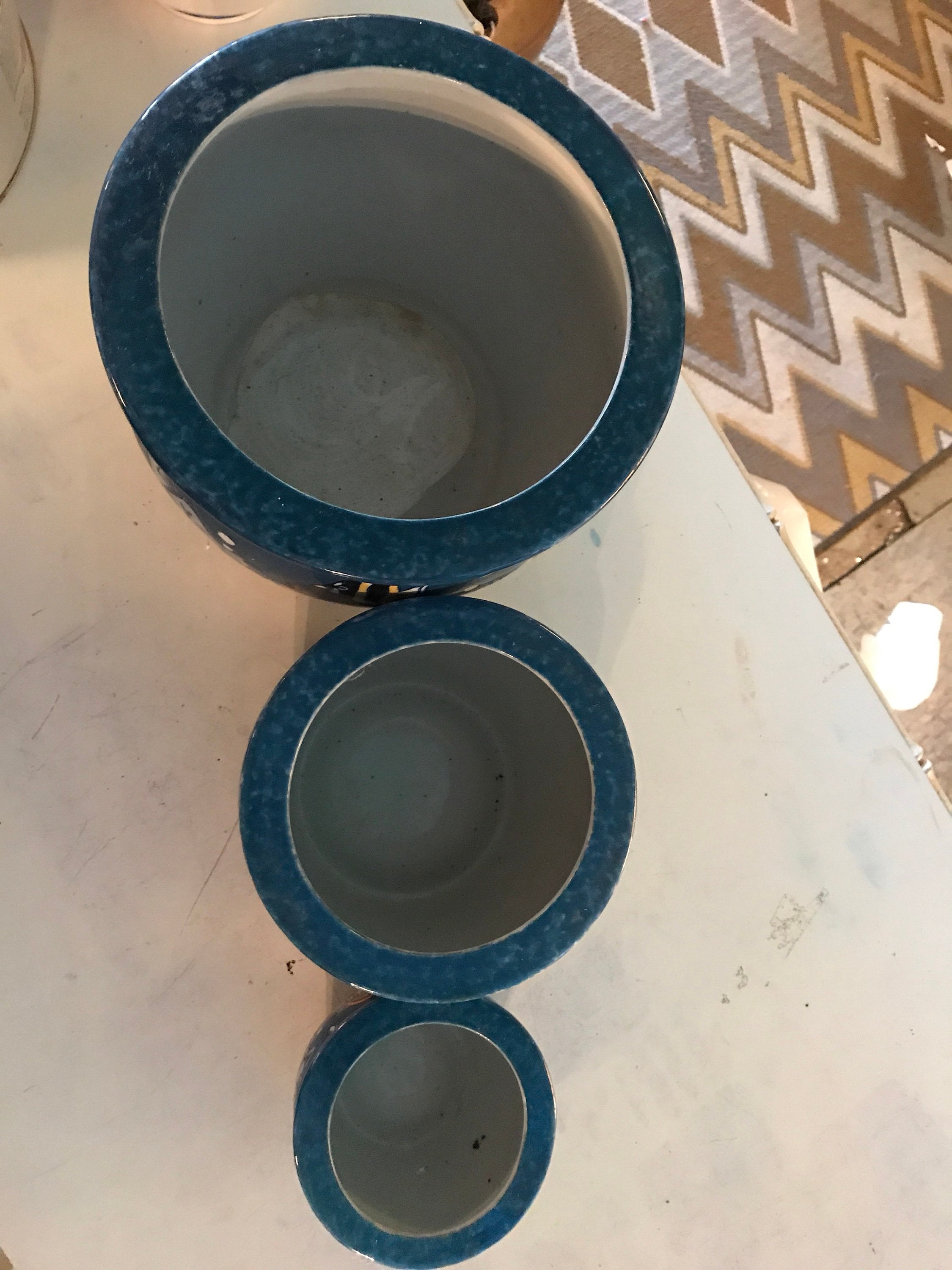 These porcelain fish design flower pots are really cute! Three different sizes, made in China. I’m not sure if age, probably the 90’s. The ocean scene is the same on all three pots and they are all in good vintage condition.