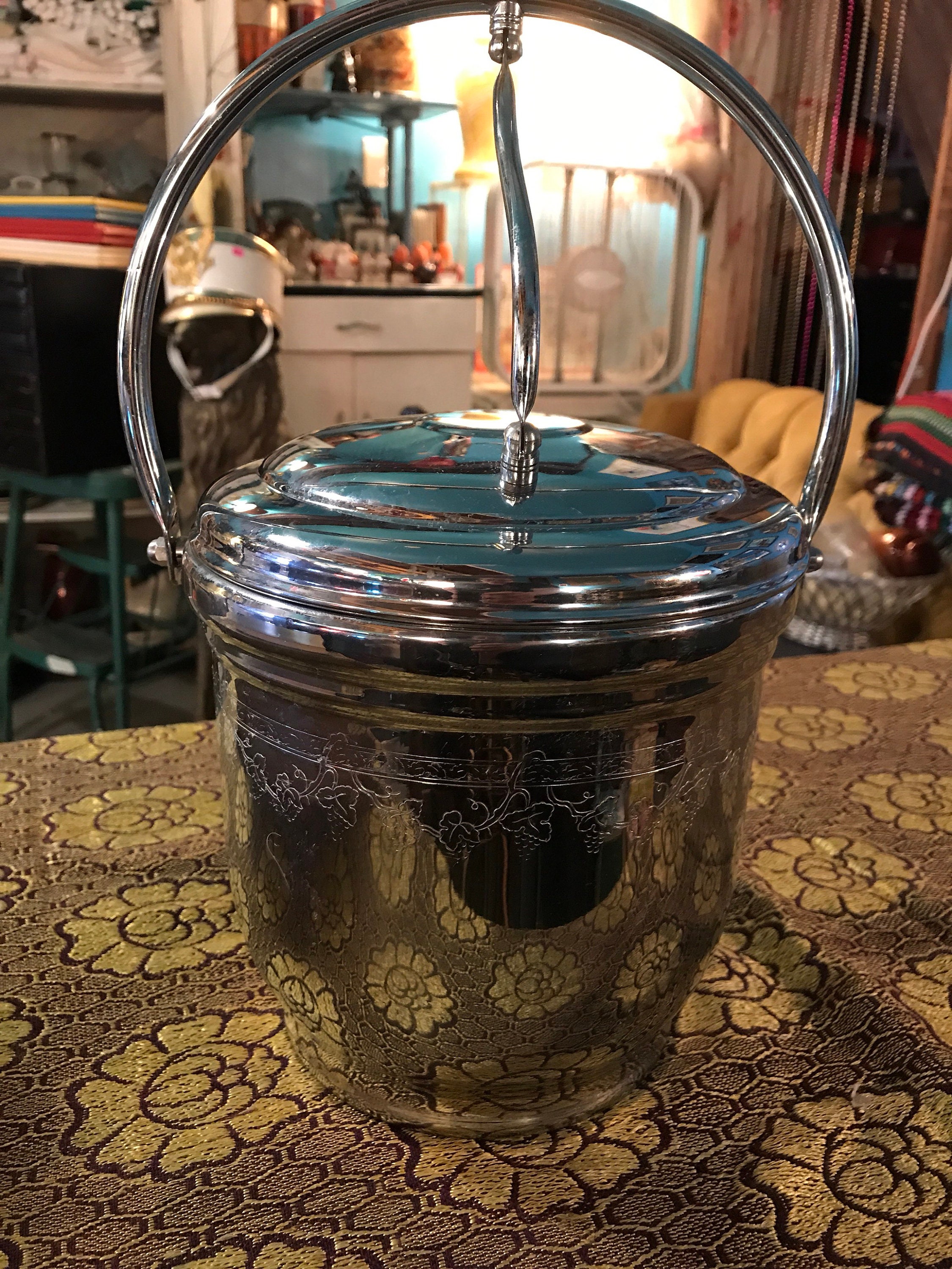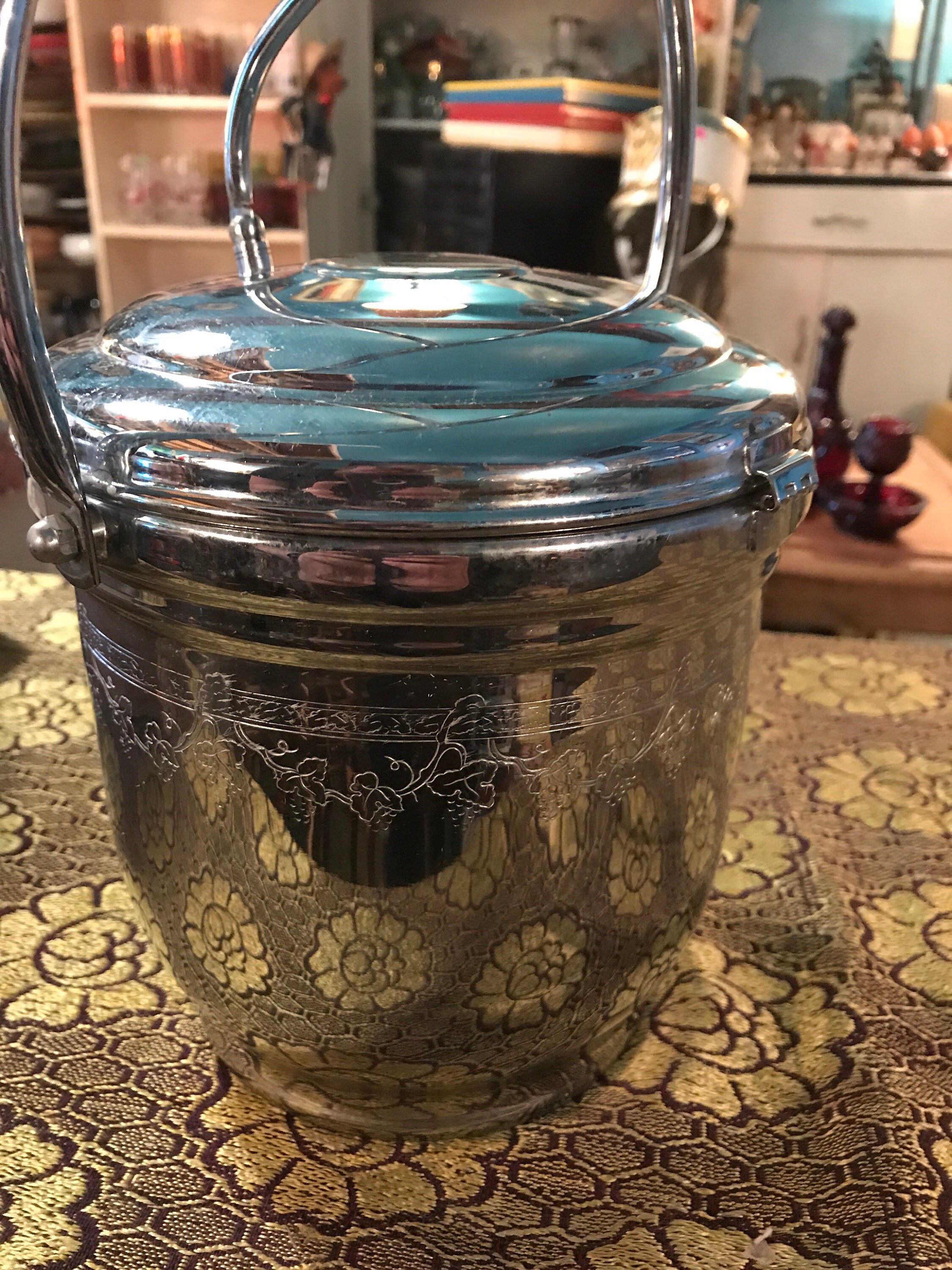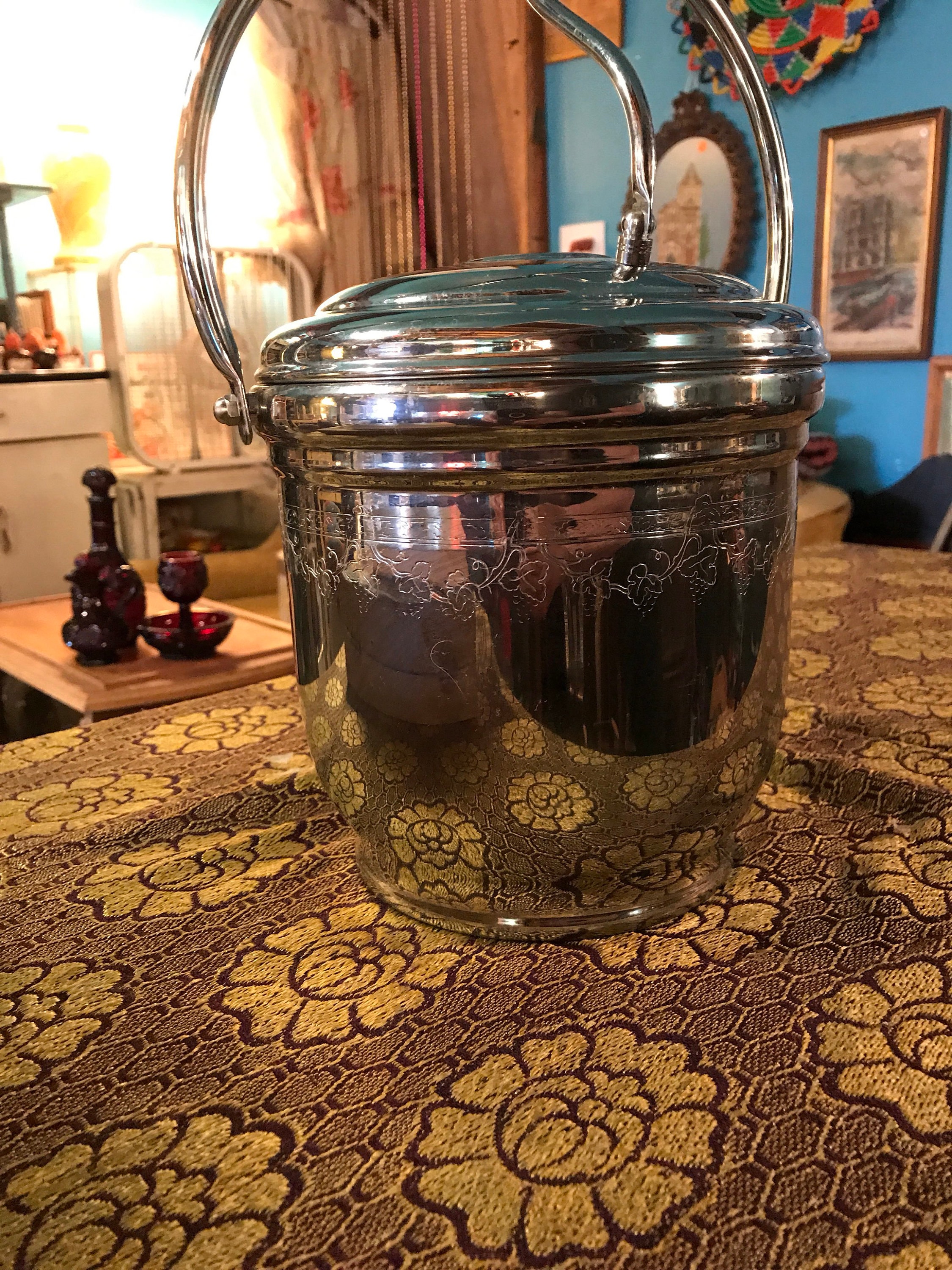 This is a super nice United ice bucket. It’s chromium over solid brass with a thick glass insert. It has a tilted hinge lid. It’s in good vintage condition, No dents or dings but of course some surface wear and tear. This beauty shines and has a grape vine design etched around it.