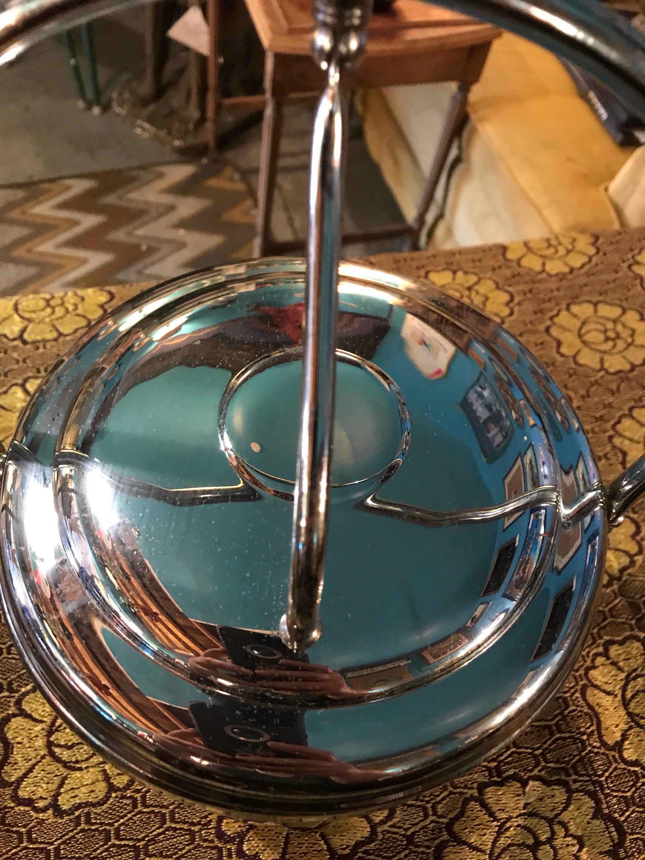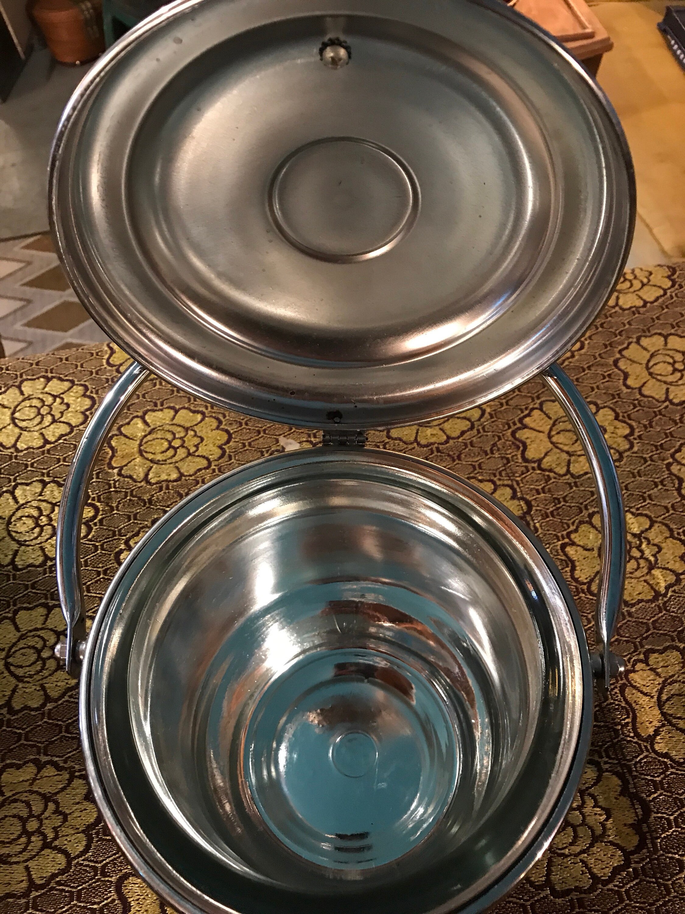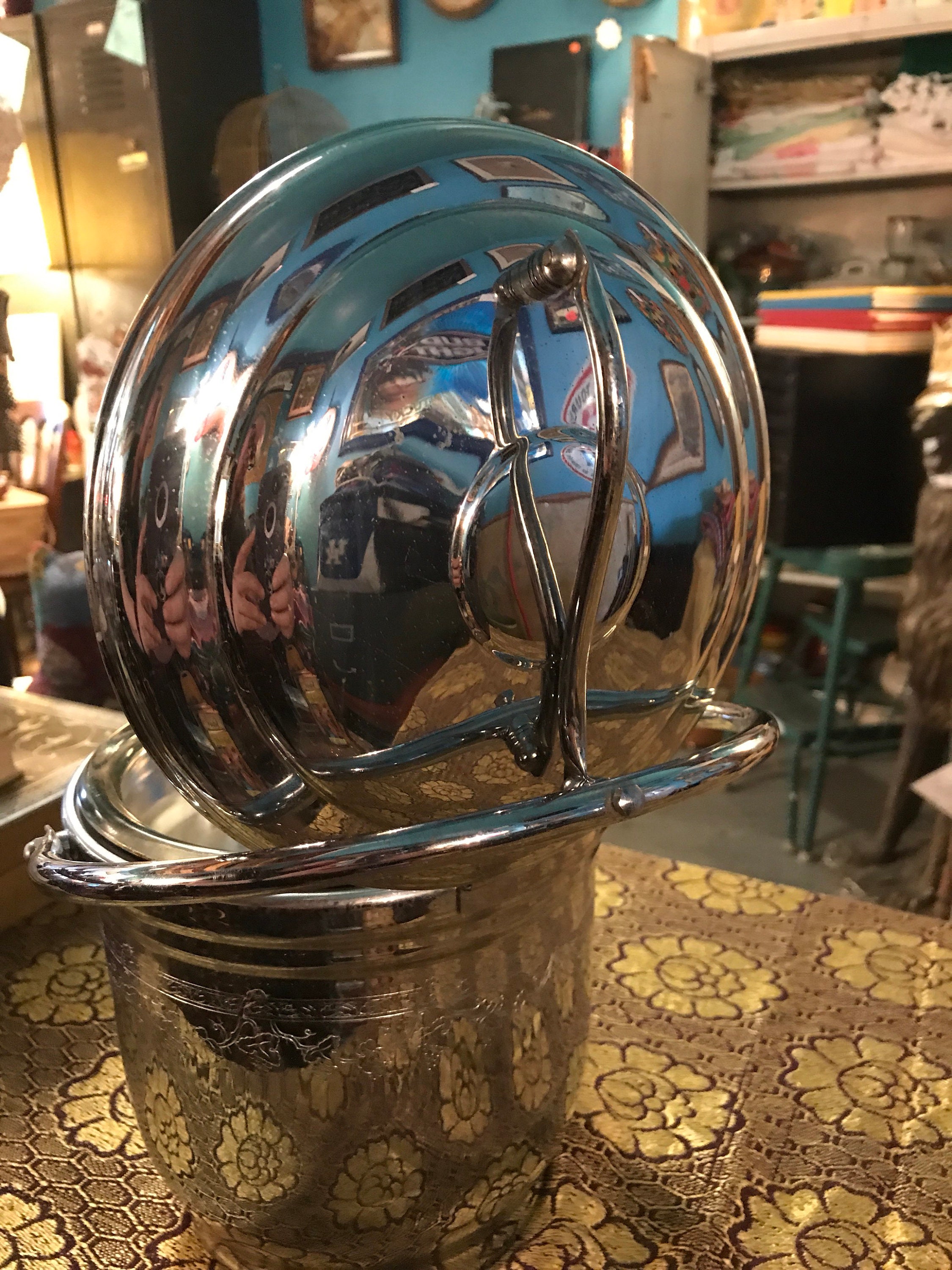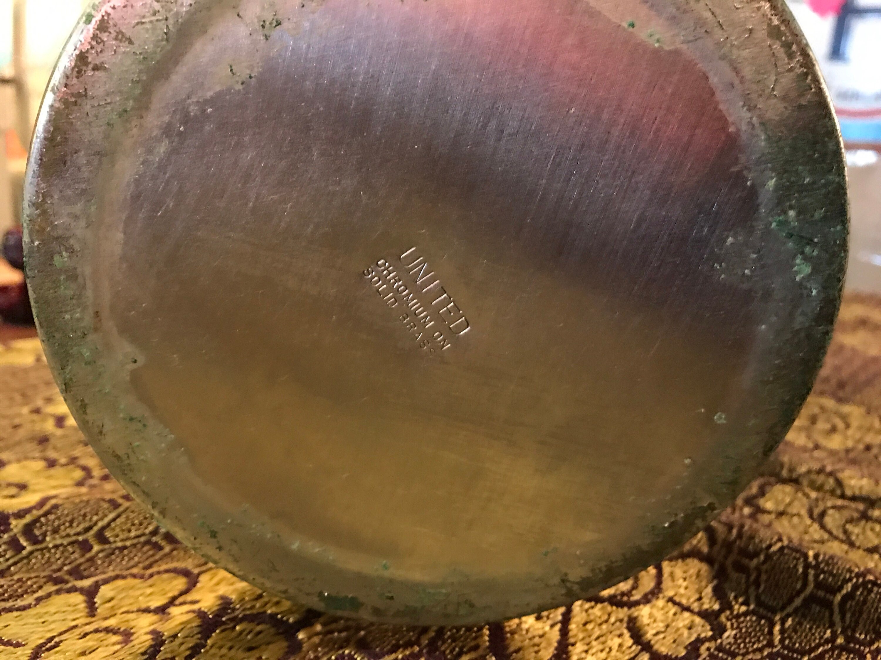 This is a super nice United ice bucket. It’s chromium over solid brass with a thick glass insert. It has a tilted hinge lid. It’s in good vintage condition, No dents or dings but of course some surface wear and tear. This beauty shines and has a grape vine design etched around it.