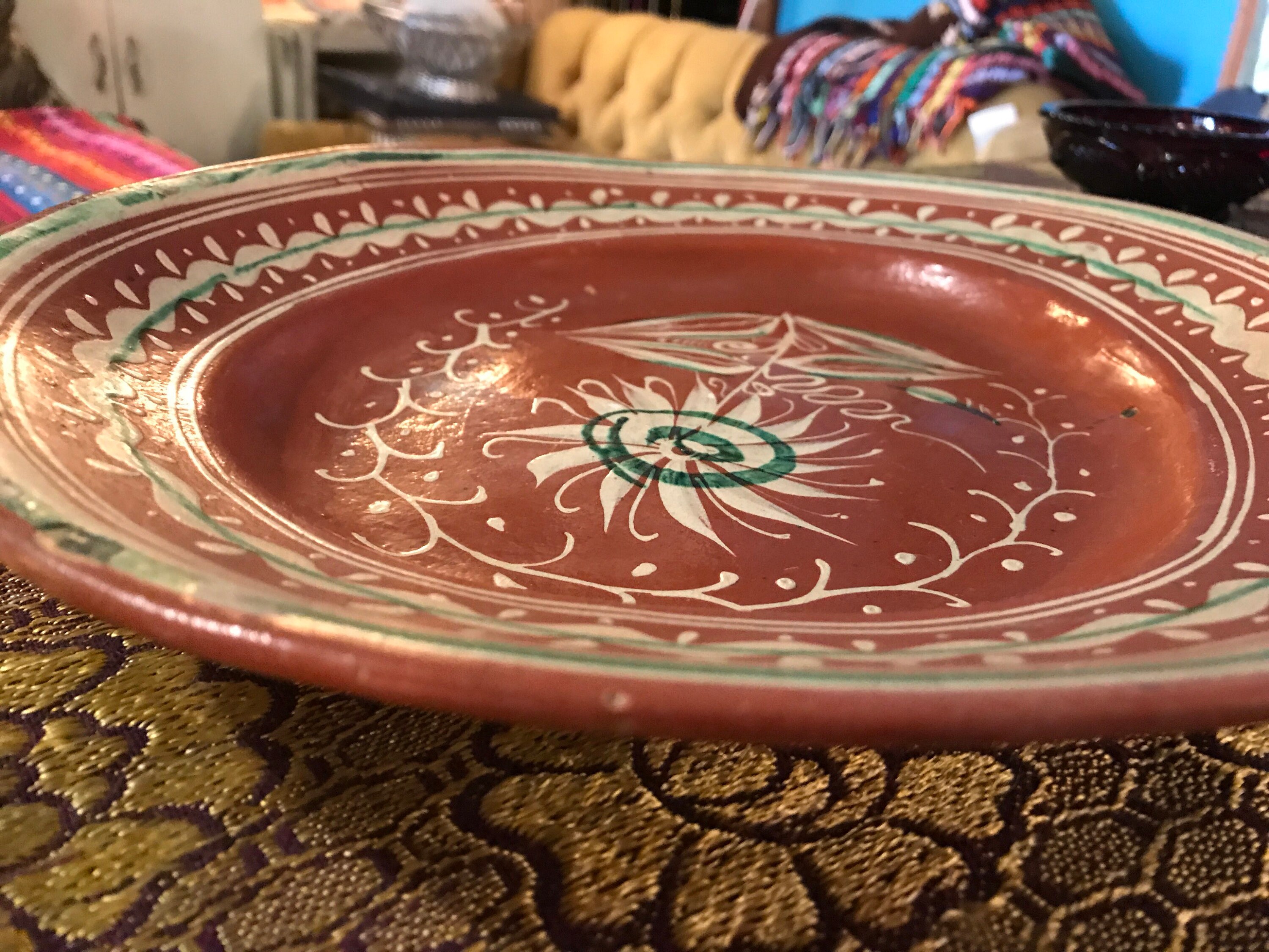 This is an old redware bandera oval pottery plate with hand painted flower and designs. This type of pottery is very delicate, but surprisingly for its age it’s in pretty good shape, there is one chip at the top of it and a few bucks to the paint on the sides. Please review ALL photos as I provide a lot of photos to go with my descriptions.