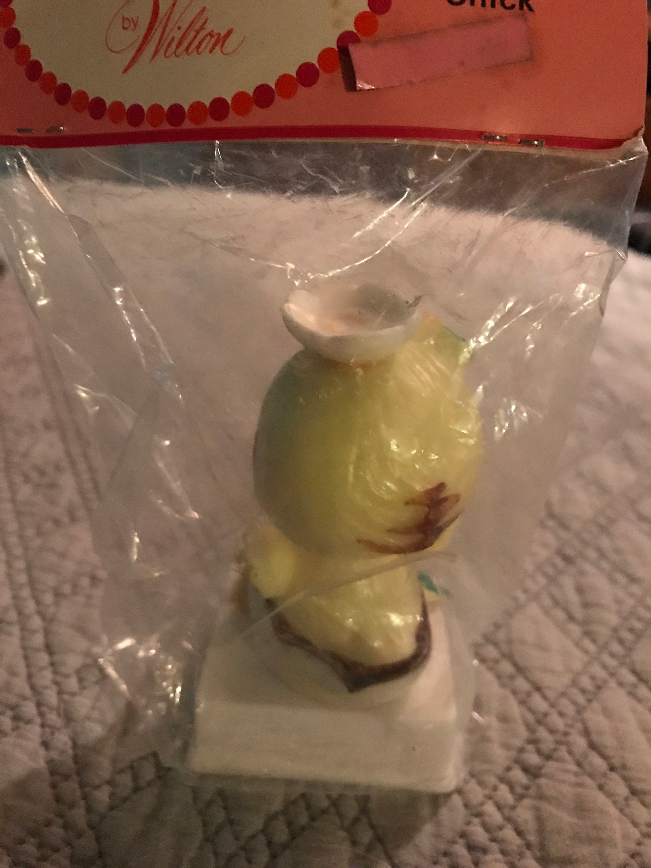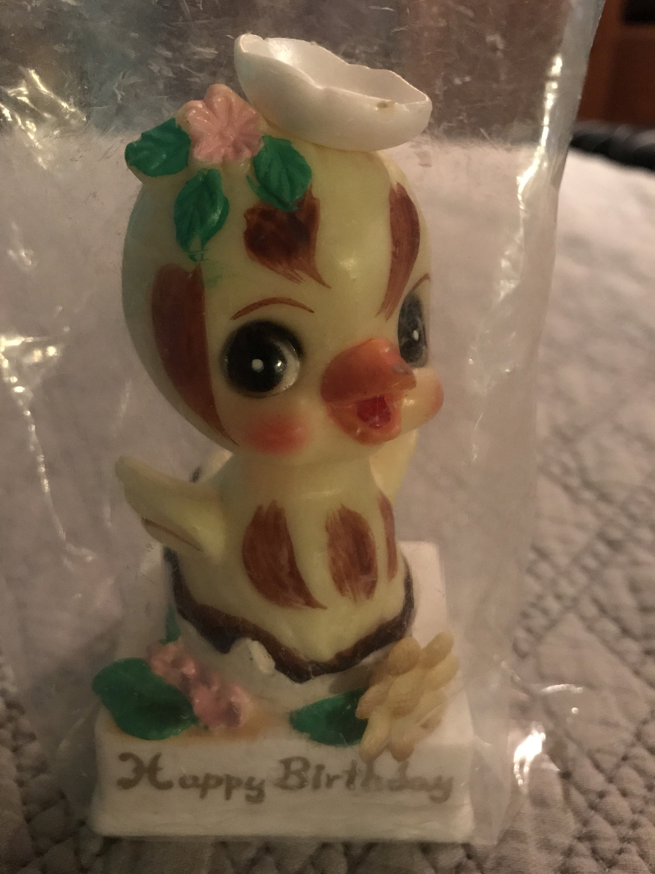 This is a cute cute little birthday cake topper! It’s a little yellow chick with flower around her and she’s being born from an egg and it’s all standing on podium that says “Happy Birthday” in gold. It’s so cute and brand new still in original package.