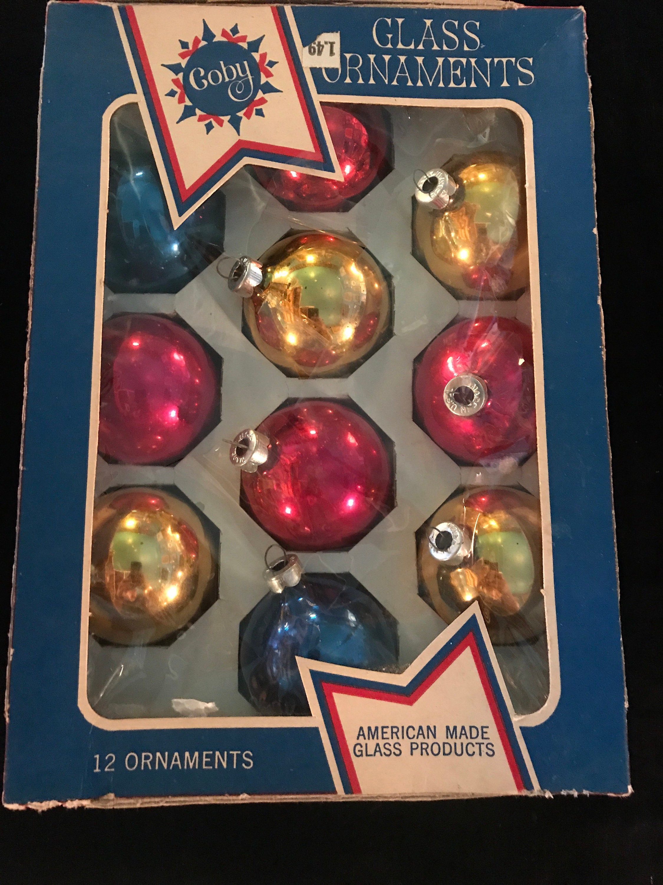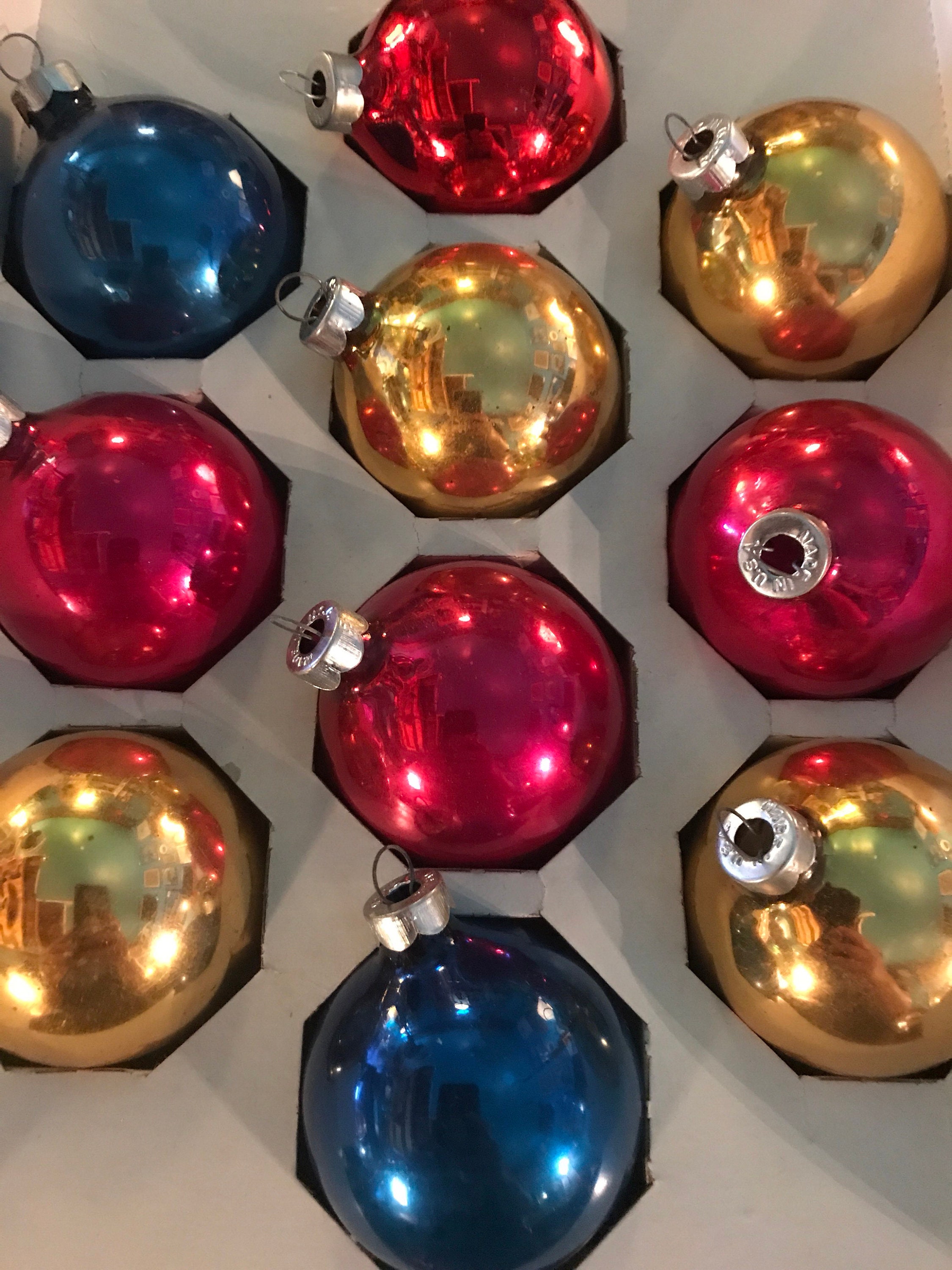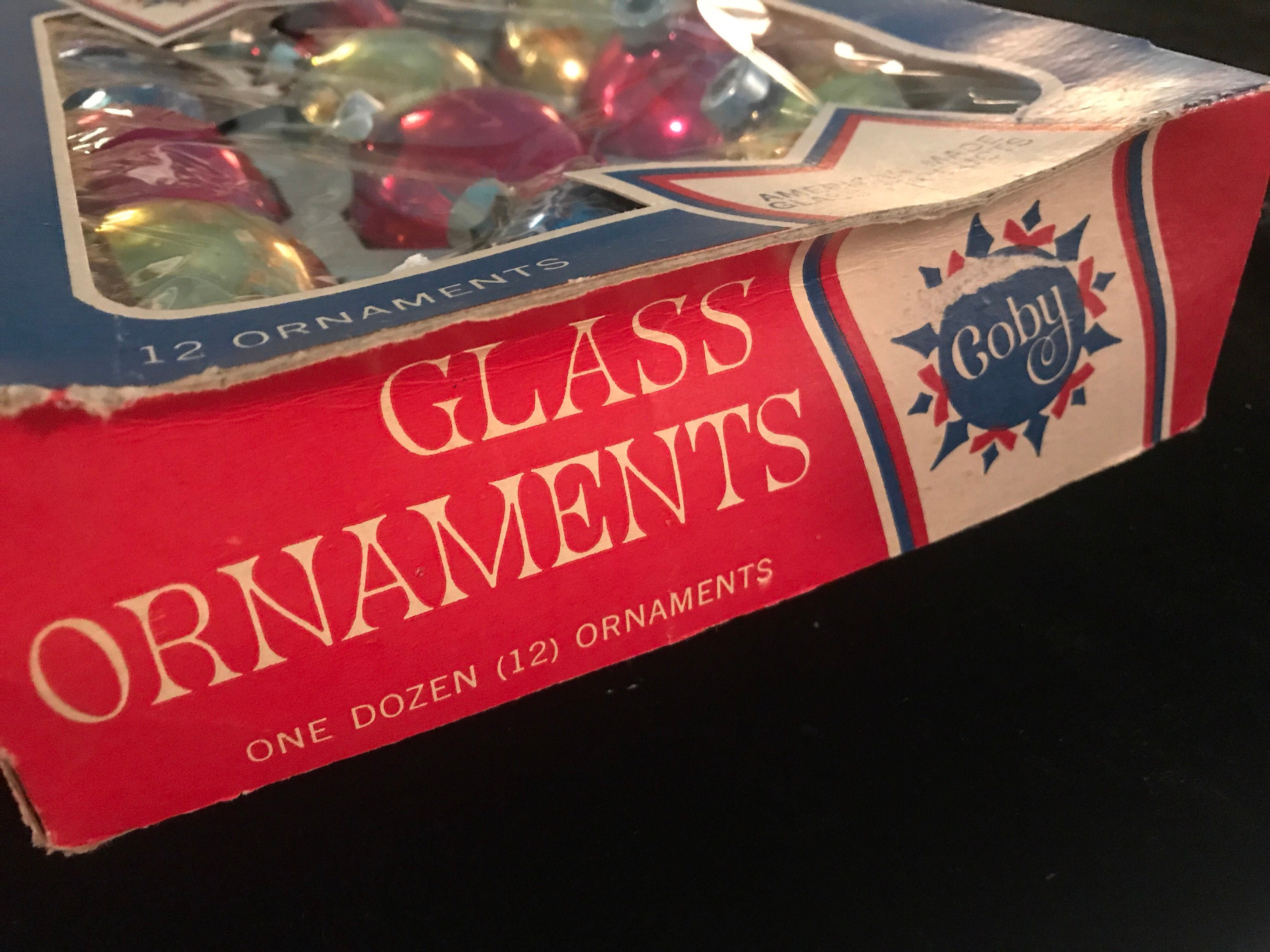 This is a lovely set of 10 medium Made in USA, Coby brand ornaments. They are vintage so they've picked up a natural patina over the years but most of these are pretty shiny and bright. They are only marked with “Made in USA” but they are in original Coby box.