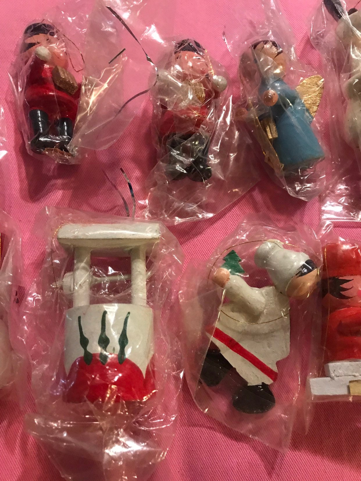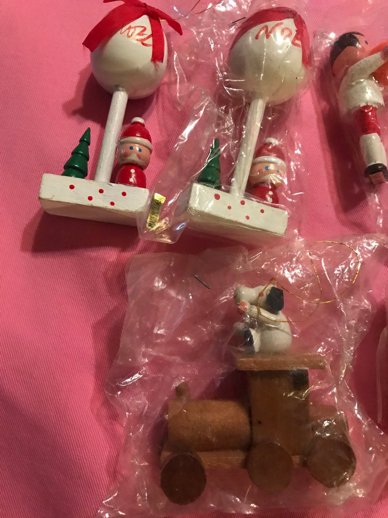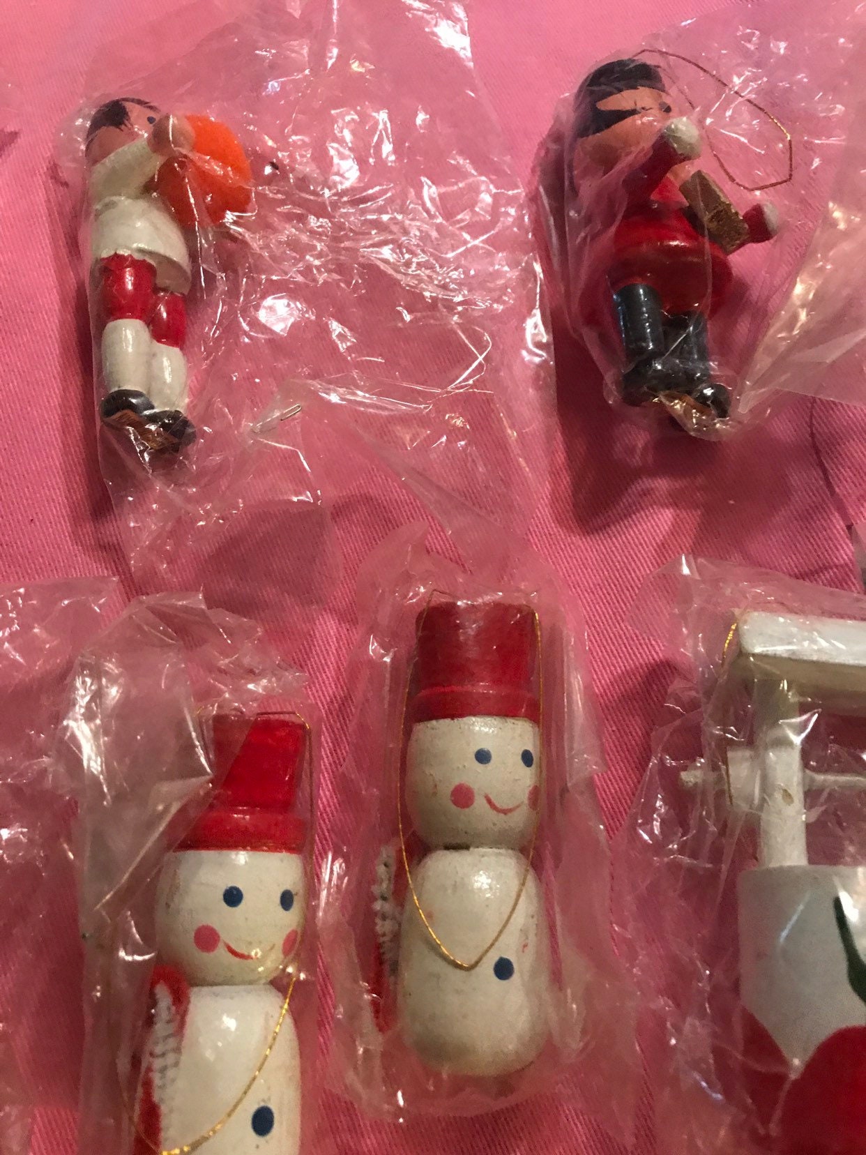 These are so cute! Made in Taiwan most of them never opened, Set of 15 wooden 1970’s ornaments for your Christmas tree! These are too cute and in great vintage condition!