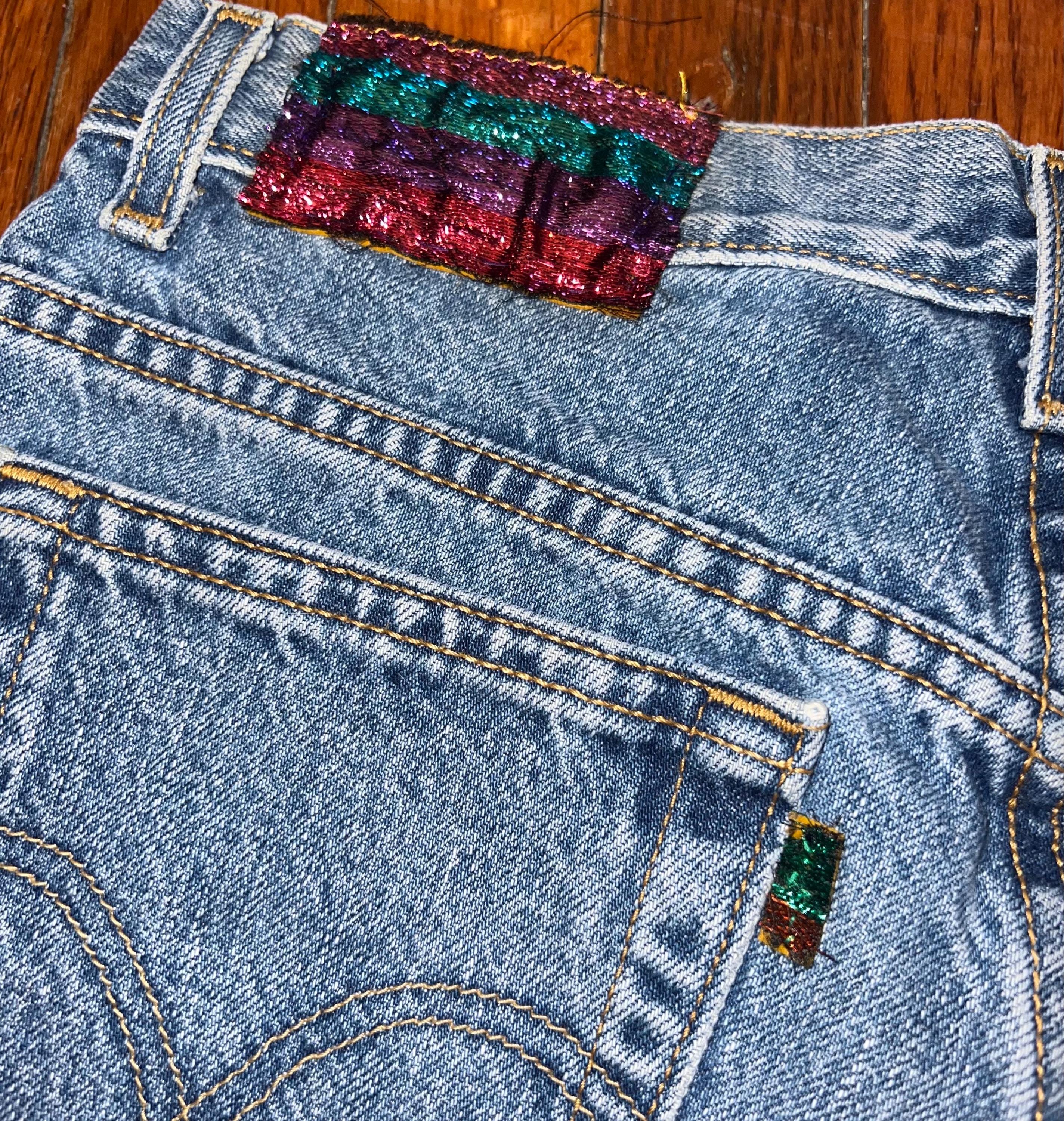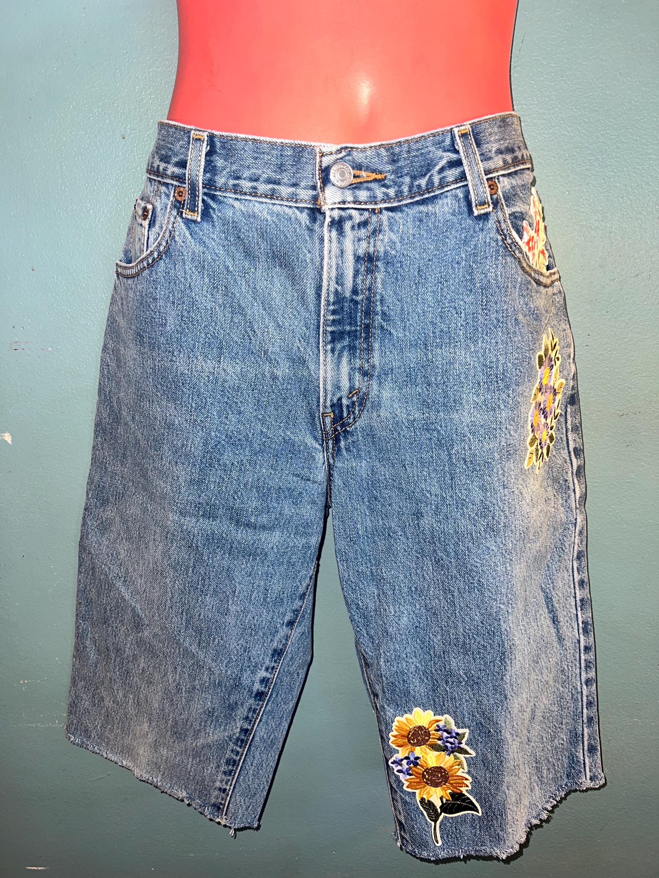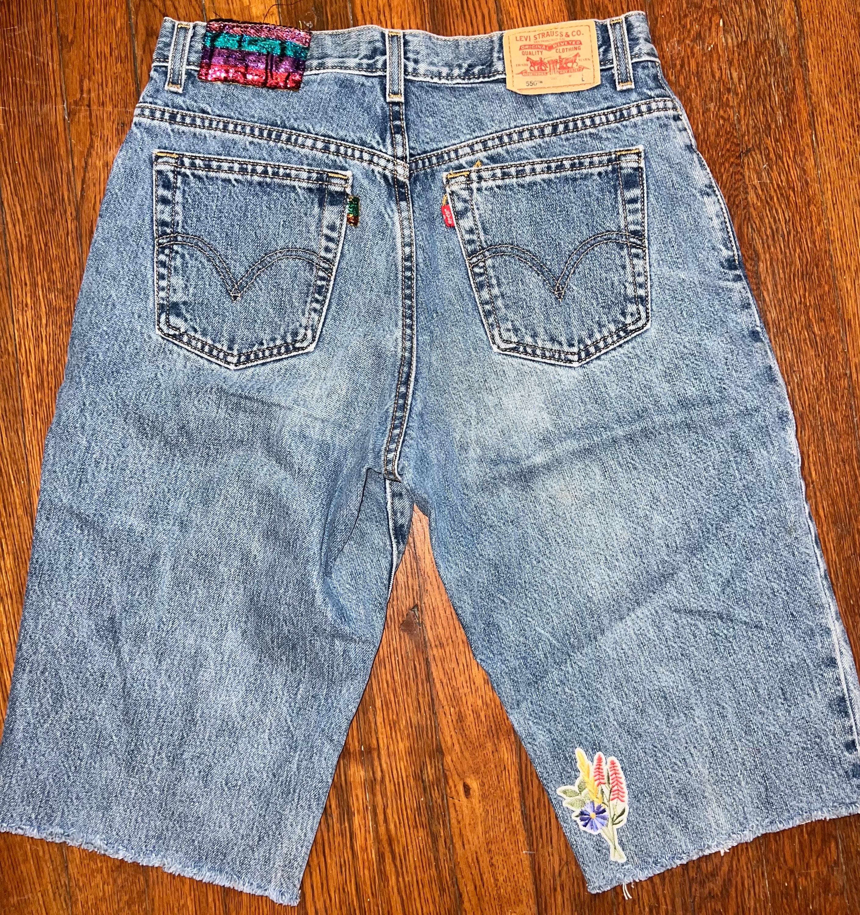 This is a super nice pair Levi’s jeans that I cut off into very long shorts! I used floral patches on them and a blingy patch of material on the back. The patches are iron-on but I’ve also reinforced them with thread so they will NOT be coming off. However, I am not a professional seamstress so please note that when purchasing, zoom in if you want to get a good look at the threading. I think these are super cool and one of a kind! They are in very good vintage condition!