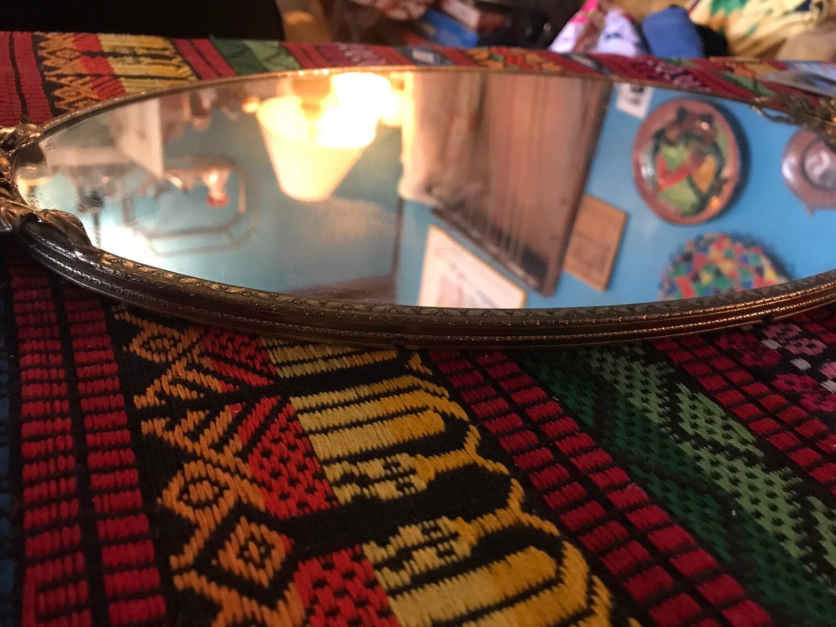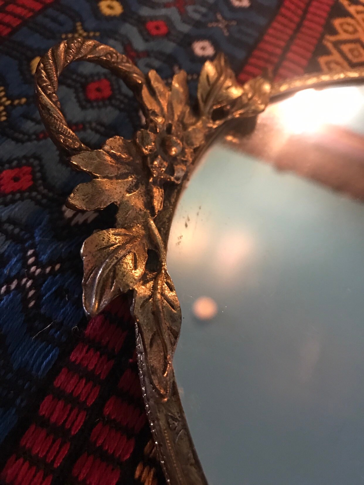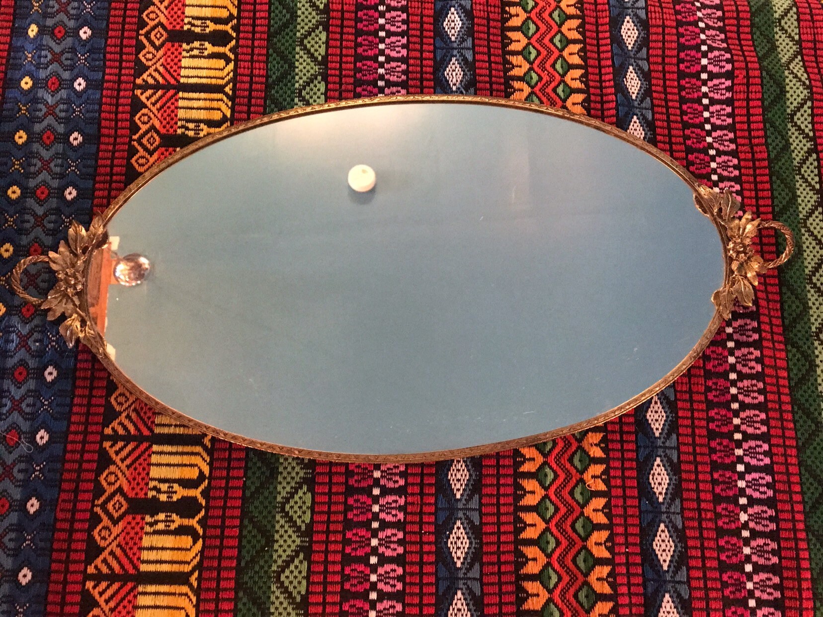 This is a nice oval shaped mirror tray, 24KT plated gold edges and handles. It has flowers and leaves. This could be used for jewelry or on a bar with a decanter and glasses on it. Very minimal scratching on the mirror. It’s in good vintage condition!