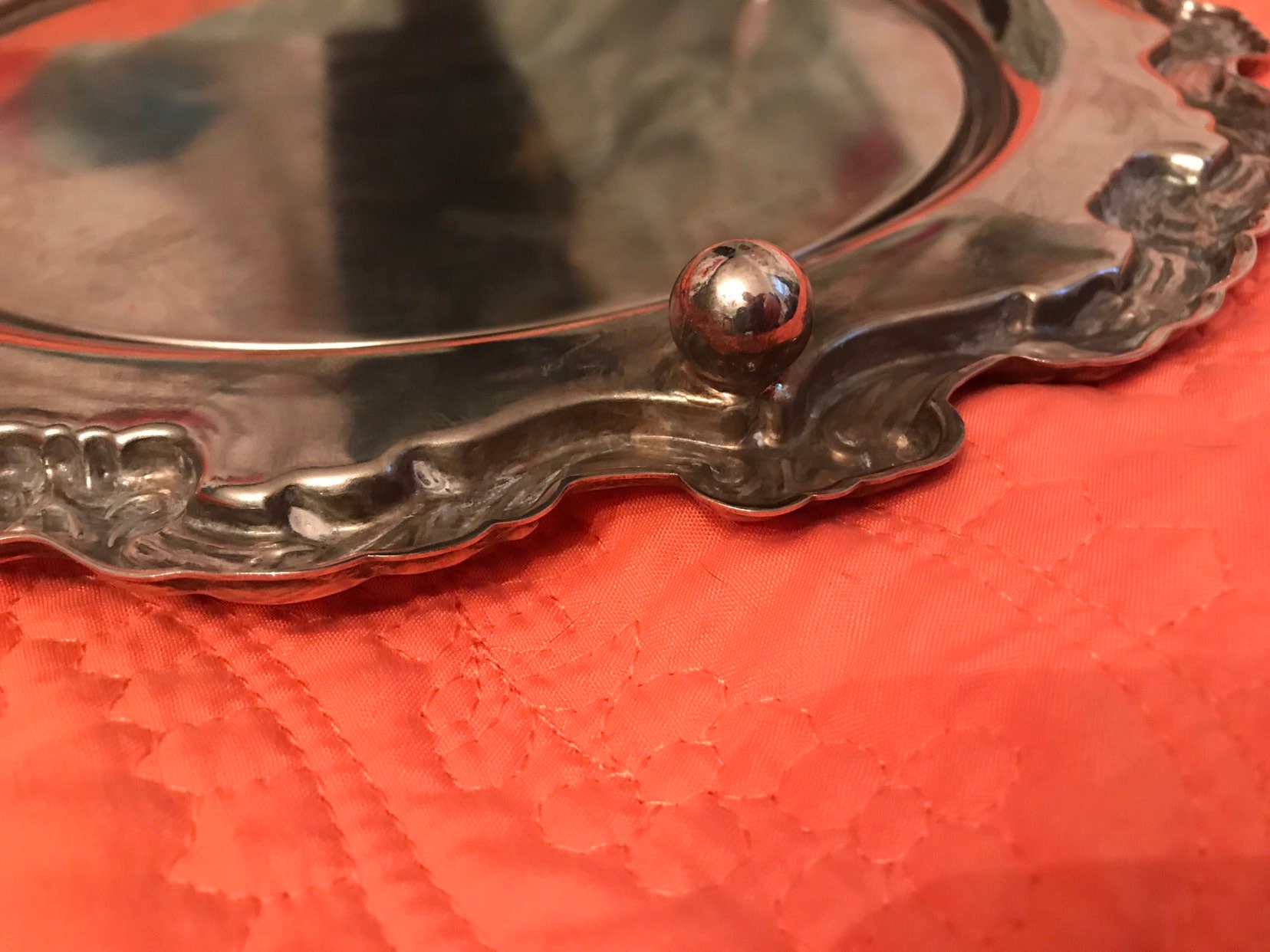 This is a nice round silver mirror tray, with a love pattern along its edge. This could be used for jewelry or on a bar with a decanter and glasses on it! The mirror as well as the silver metal around it seem to be in really good condition, very little surface wear and tear. I believe it is silver plate but I can’t prove it! It has three silver ball feet so that it looks very nice sitting on a vanity or table, and it’s very pretty!