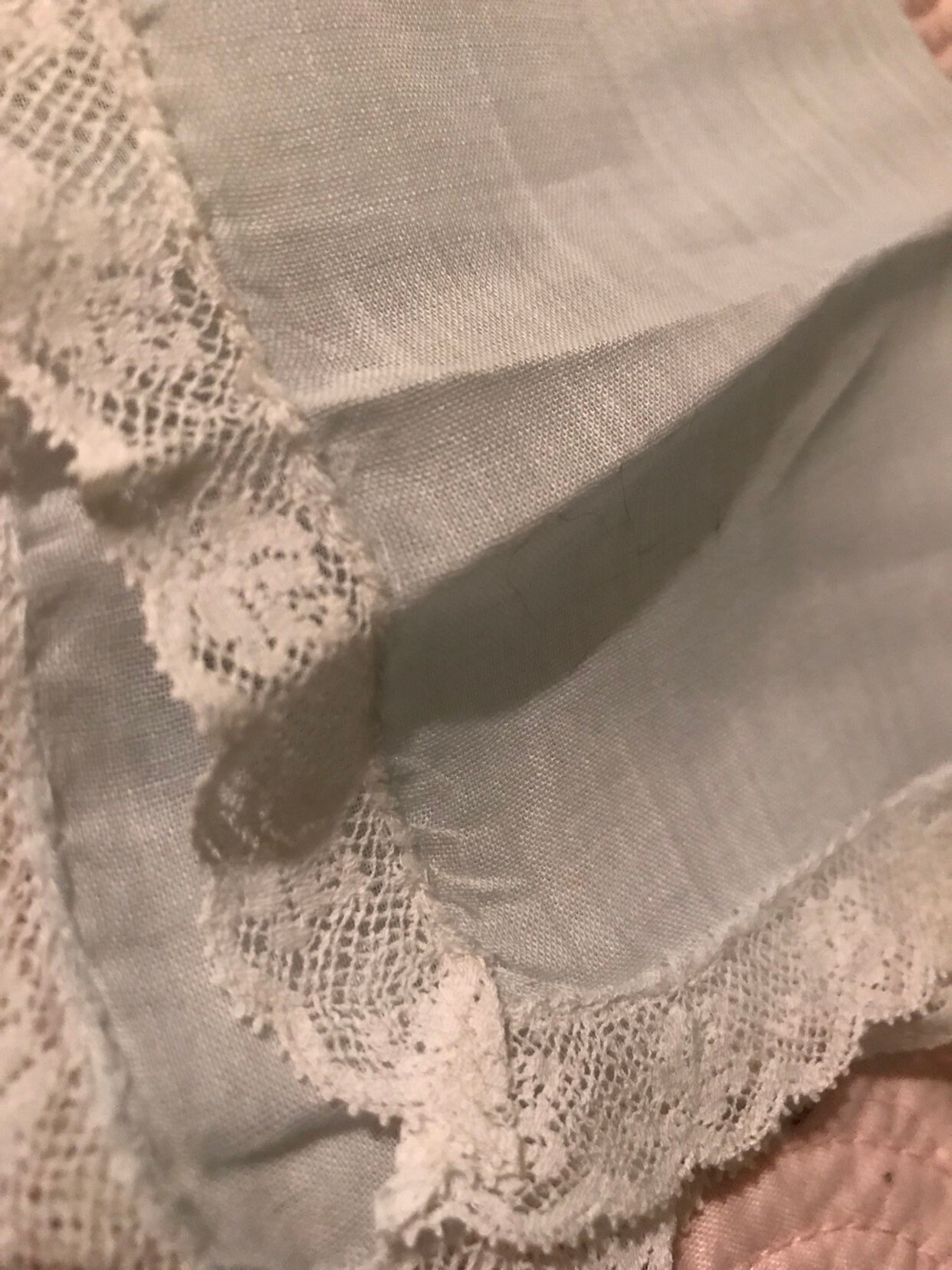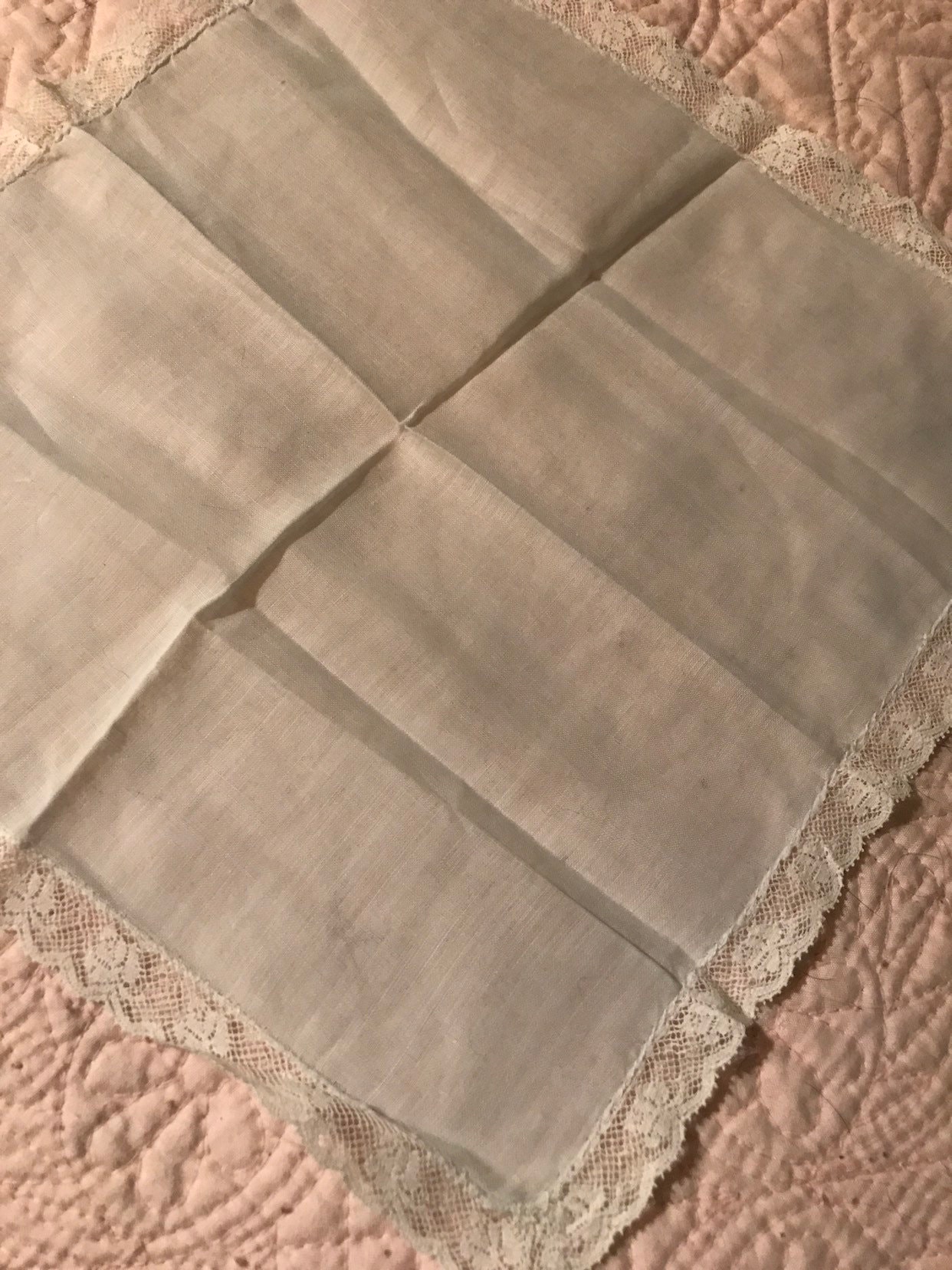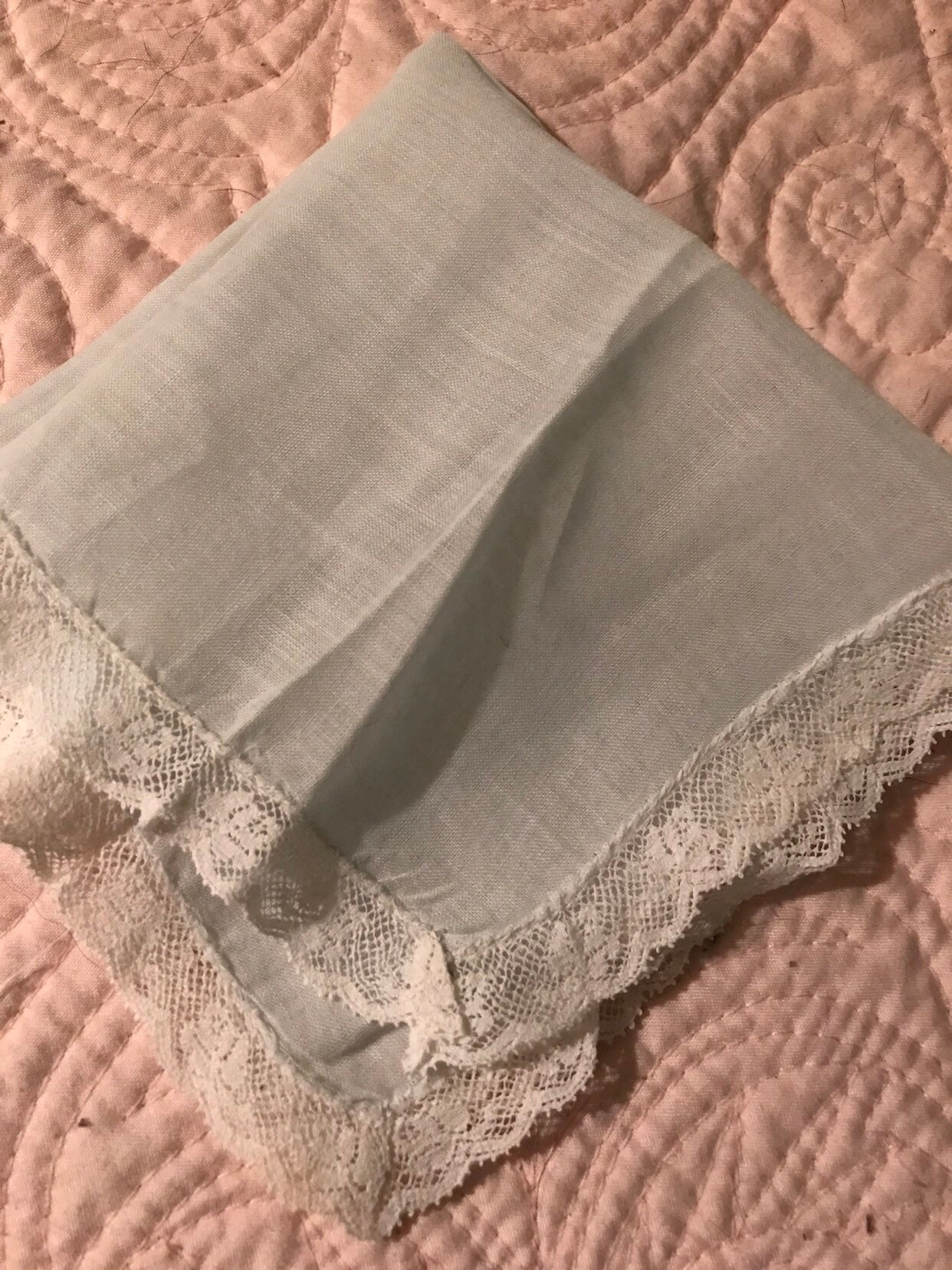 Simple but Gorgeous 1950's handkerchief! With white lace all around it, and a blue so light that it shows up the most when it’s folded (see photos). This is perfect for brides “something blue”. There are no stains, and it's in good vintage condition!