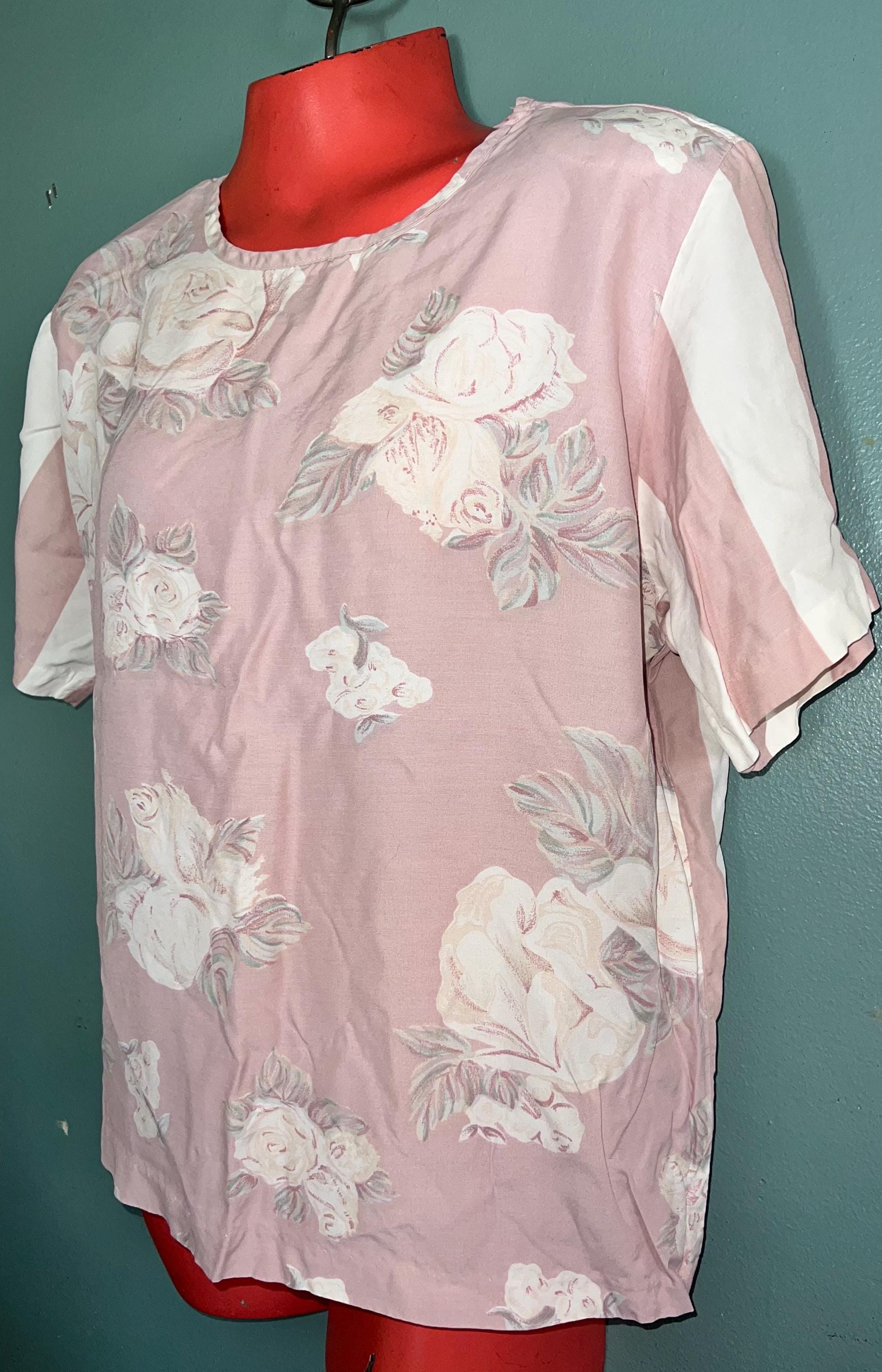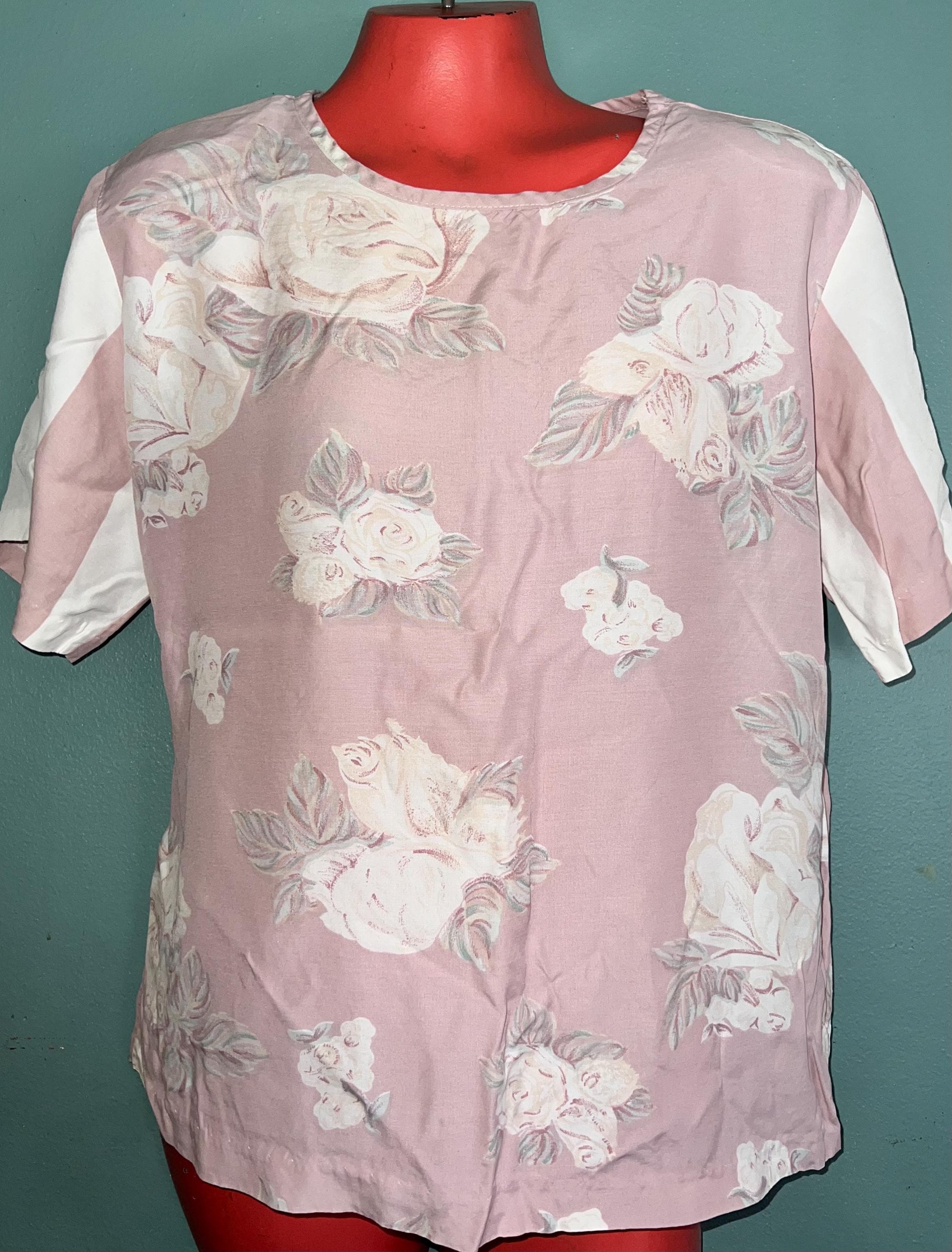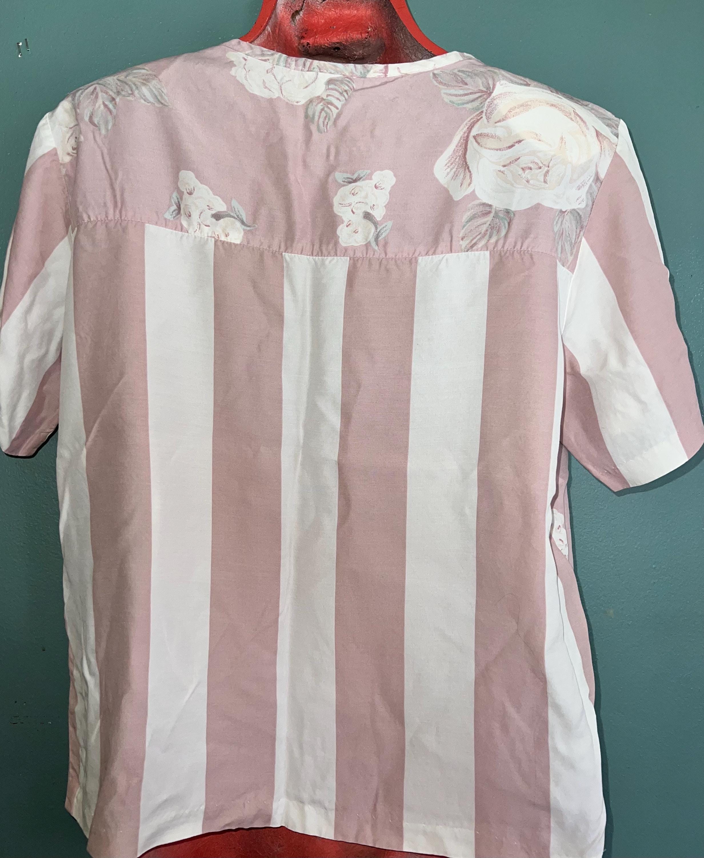 This is a really pretty light pink or almost a rose color, it has white roses all over the front, a pink and white striped back. It does have shoulder pads that could be easily removed and it’s in good vintage condition!