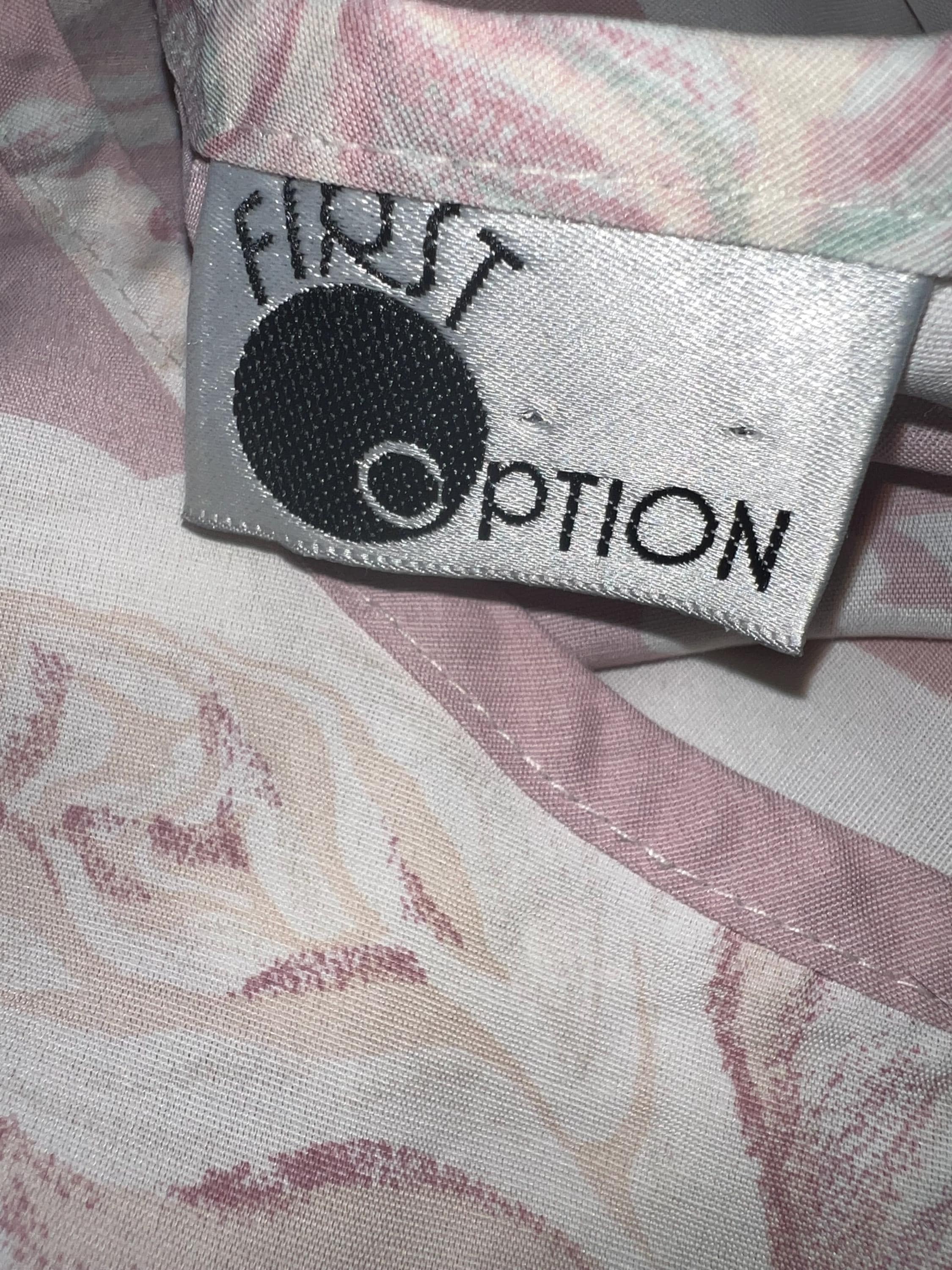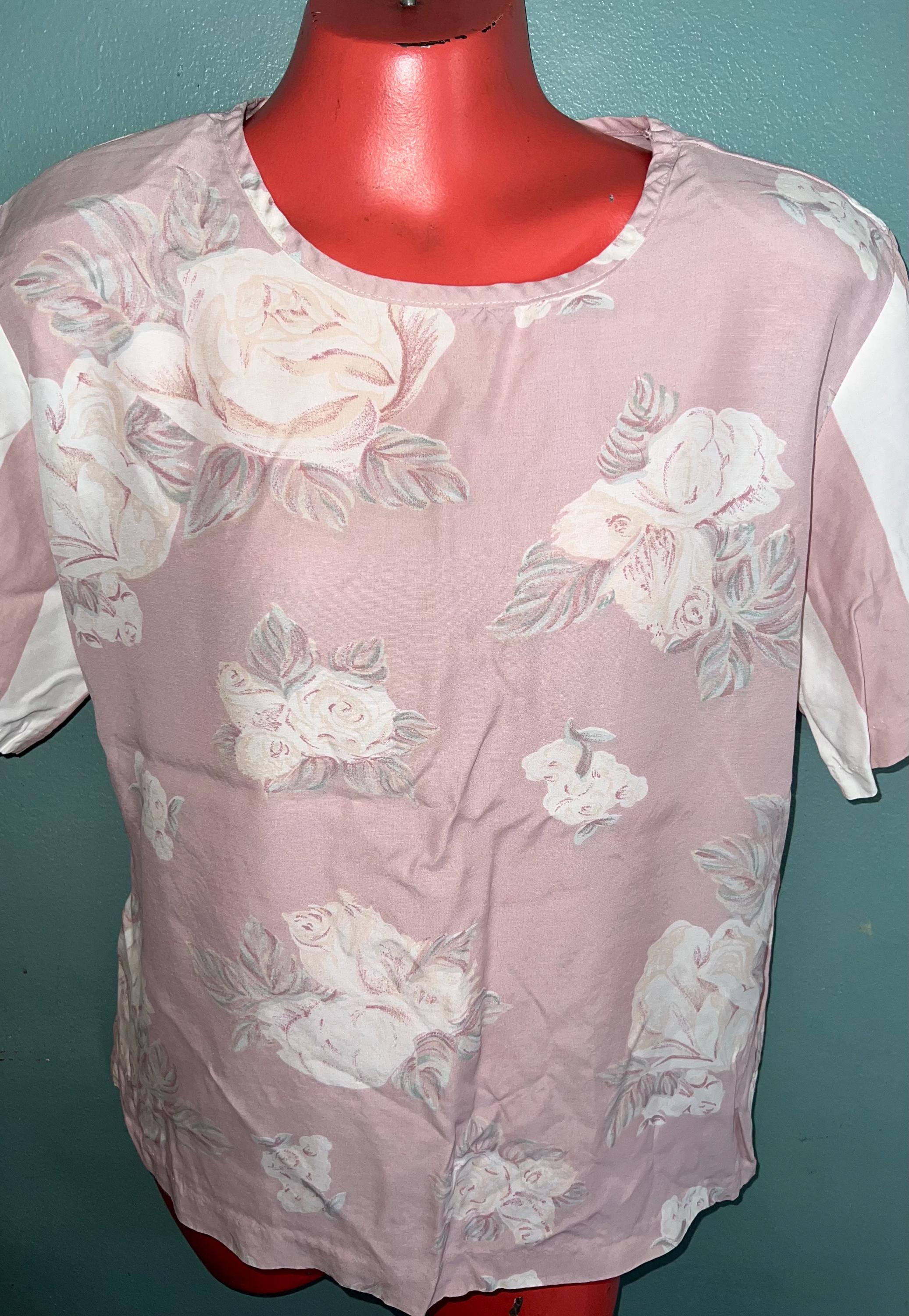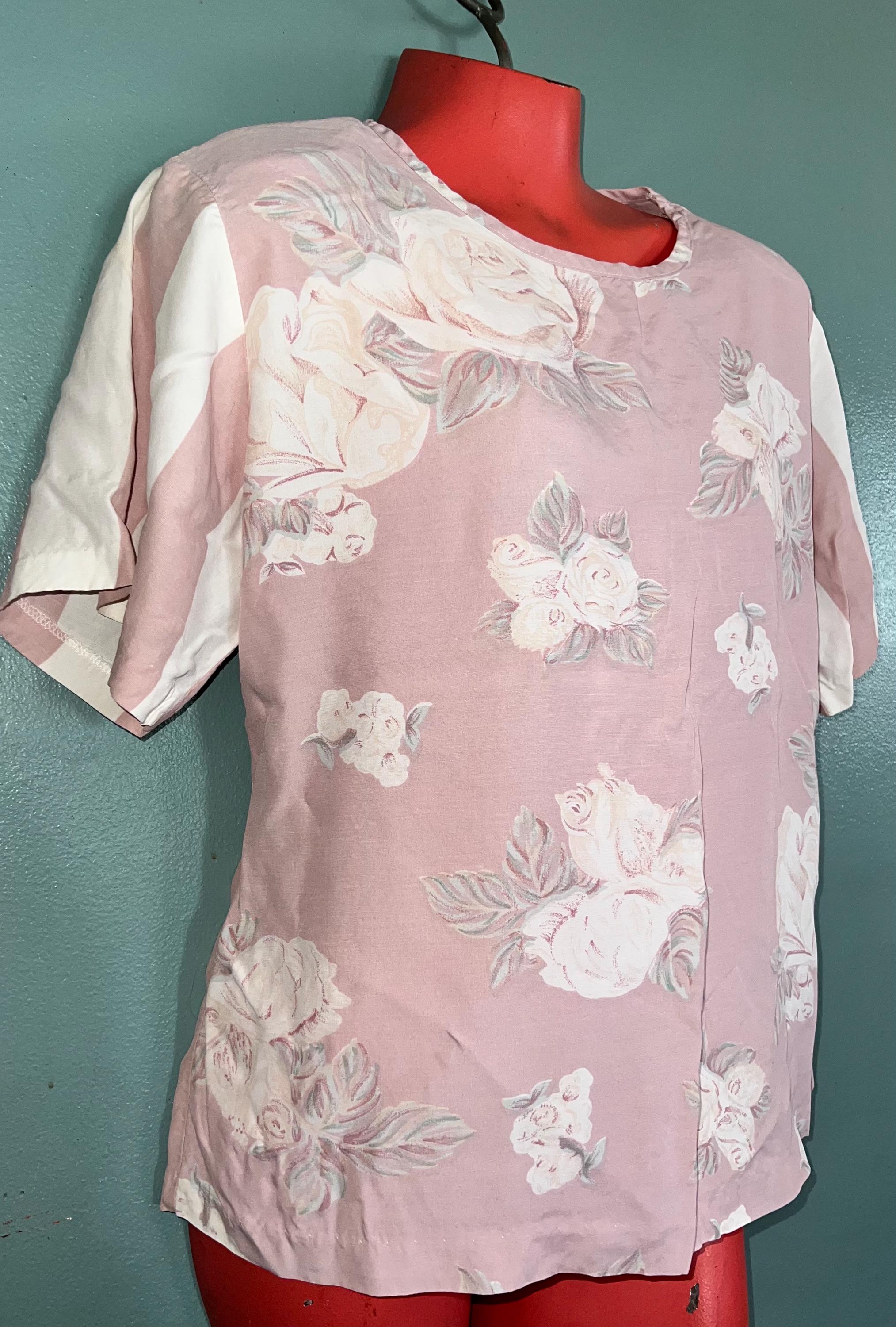 This is a really pretty light pink or almost a rose color, it has white roses all over the front, a pink and white striped back. It does have shoulder pads that could be easily removed and it’s in good vintage condition!