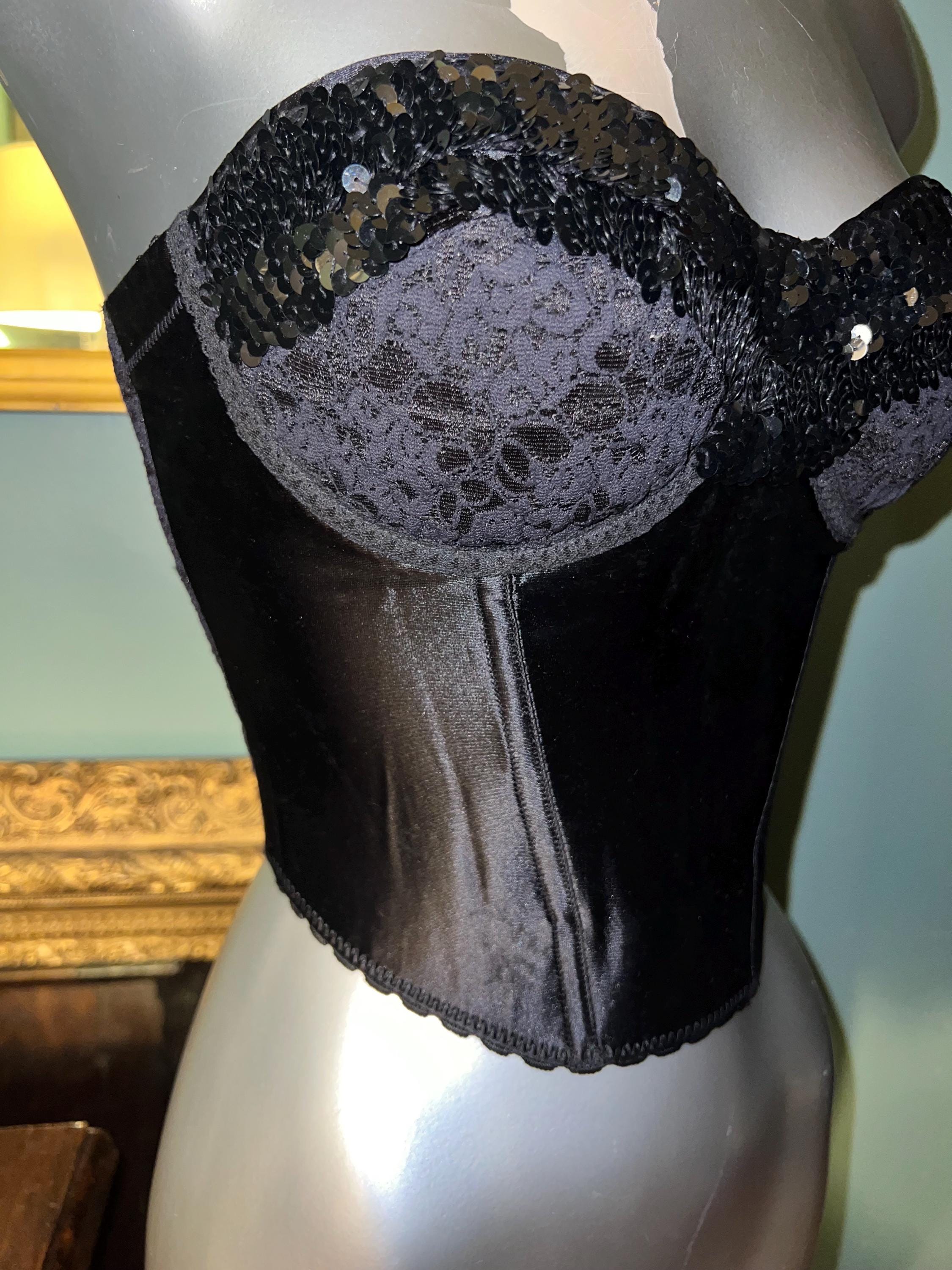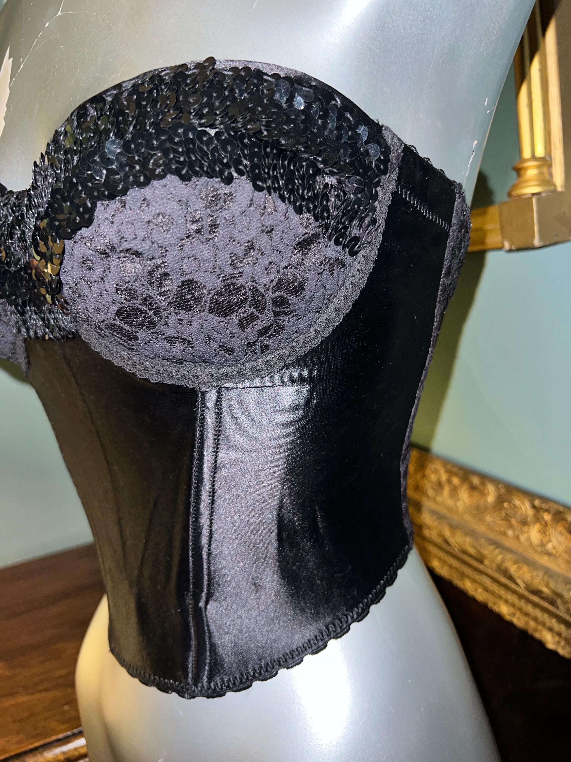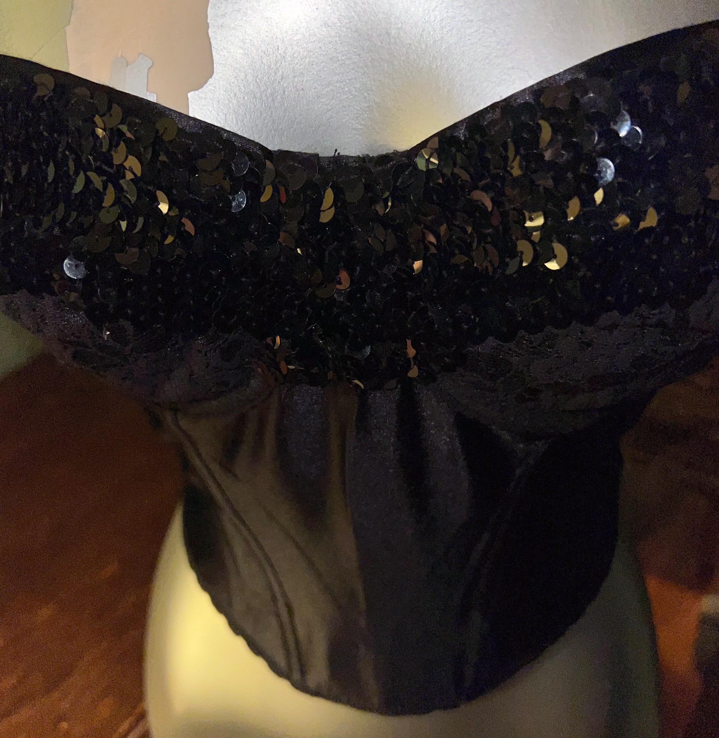 This is a gorgeous corset bra by MaidenForm in the 90’s. It is black with lace and sequins. I love the line of black sequins! It's in good vintage condition.