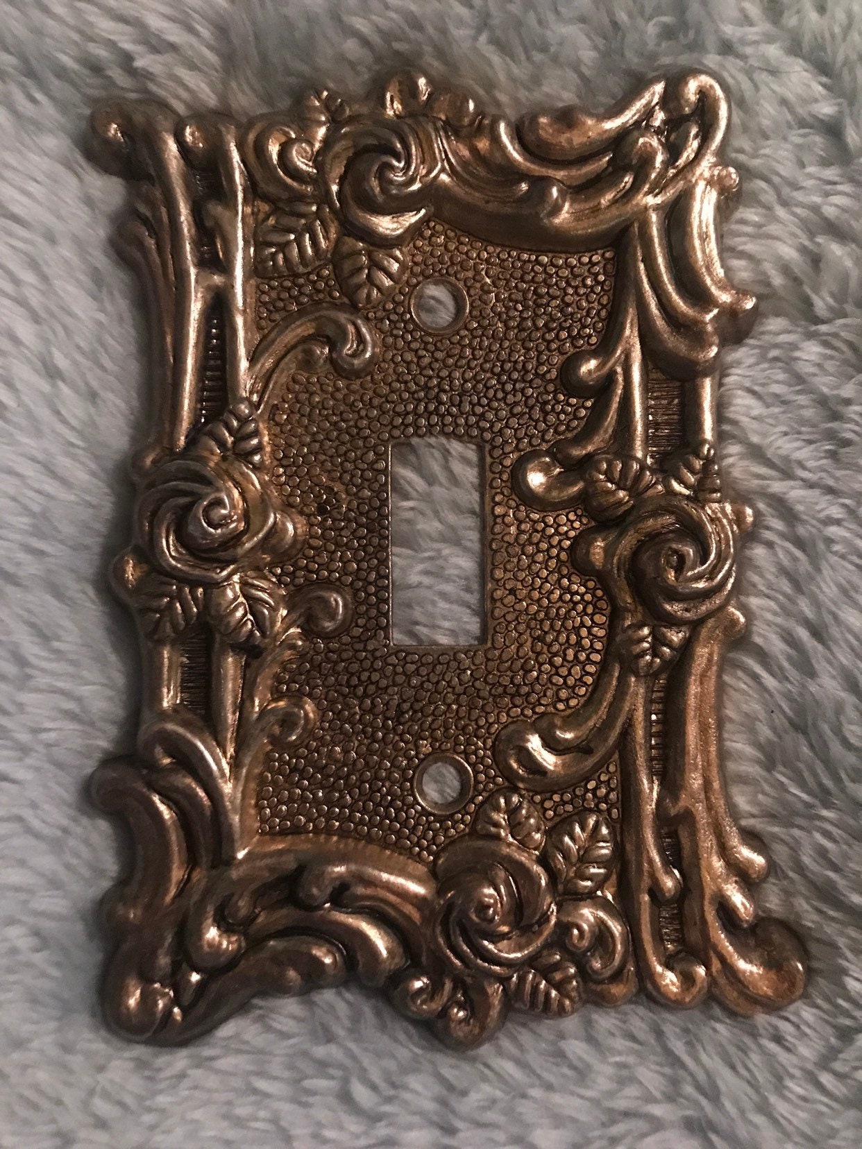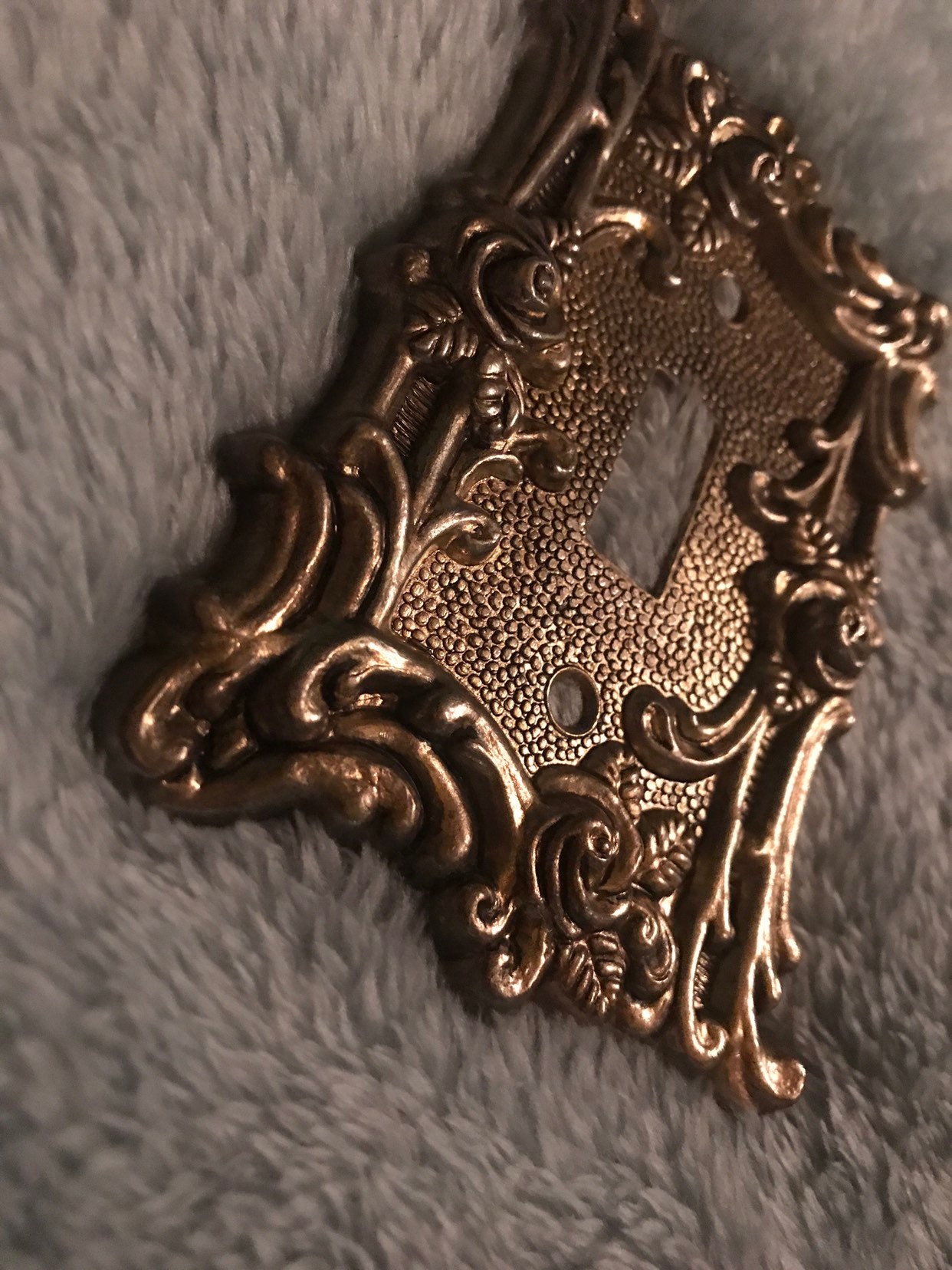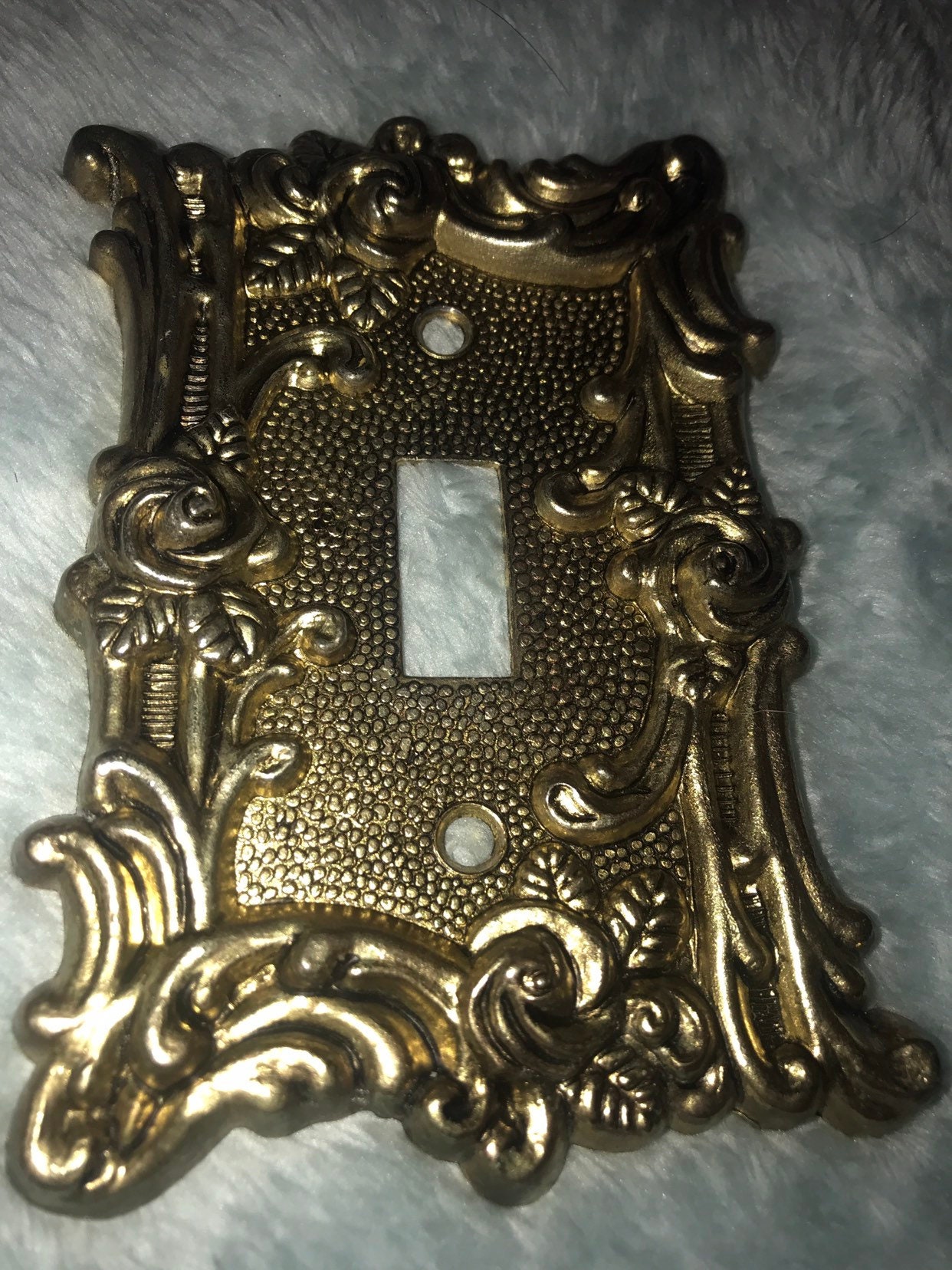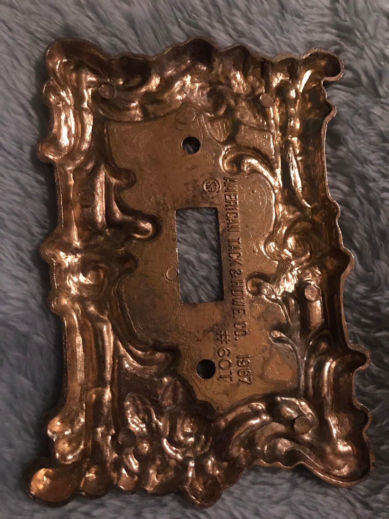 So pretty! Gold (the lighting in the photos at times makes it look silver, but it’s gold) Ornamental Metal light switch cover with markings on the back, made in 1967.