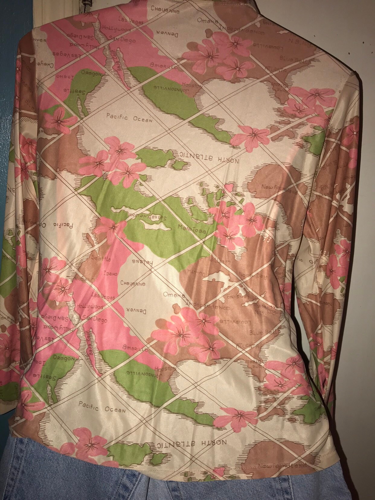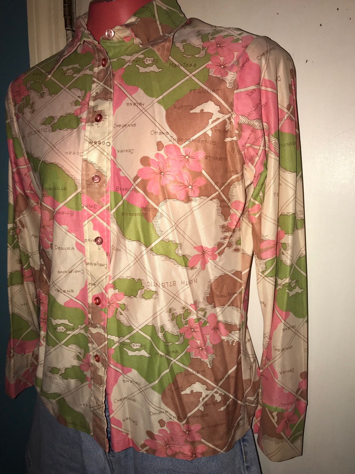 This is a nice 70’s colorful map designed spring blouse! It’s super cute, but it is old and it has definitely been well worn. The color needs to be ironed. It’s really cool how it has places all over it, like a map. Shirt is in good vintage condition, but does show wear.