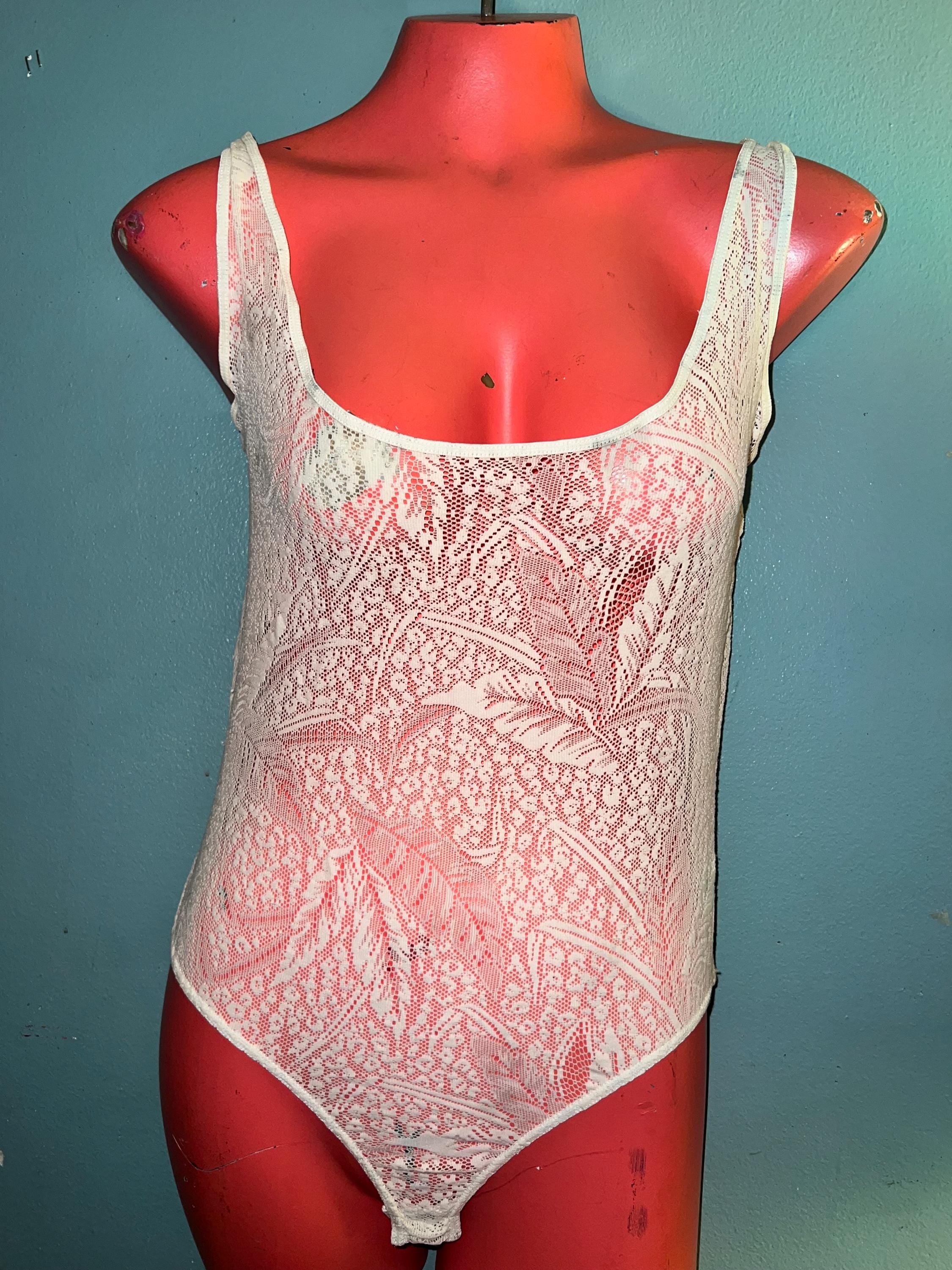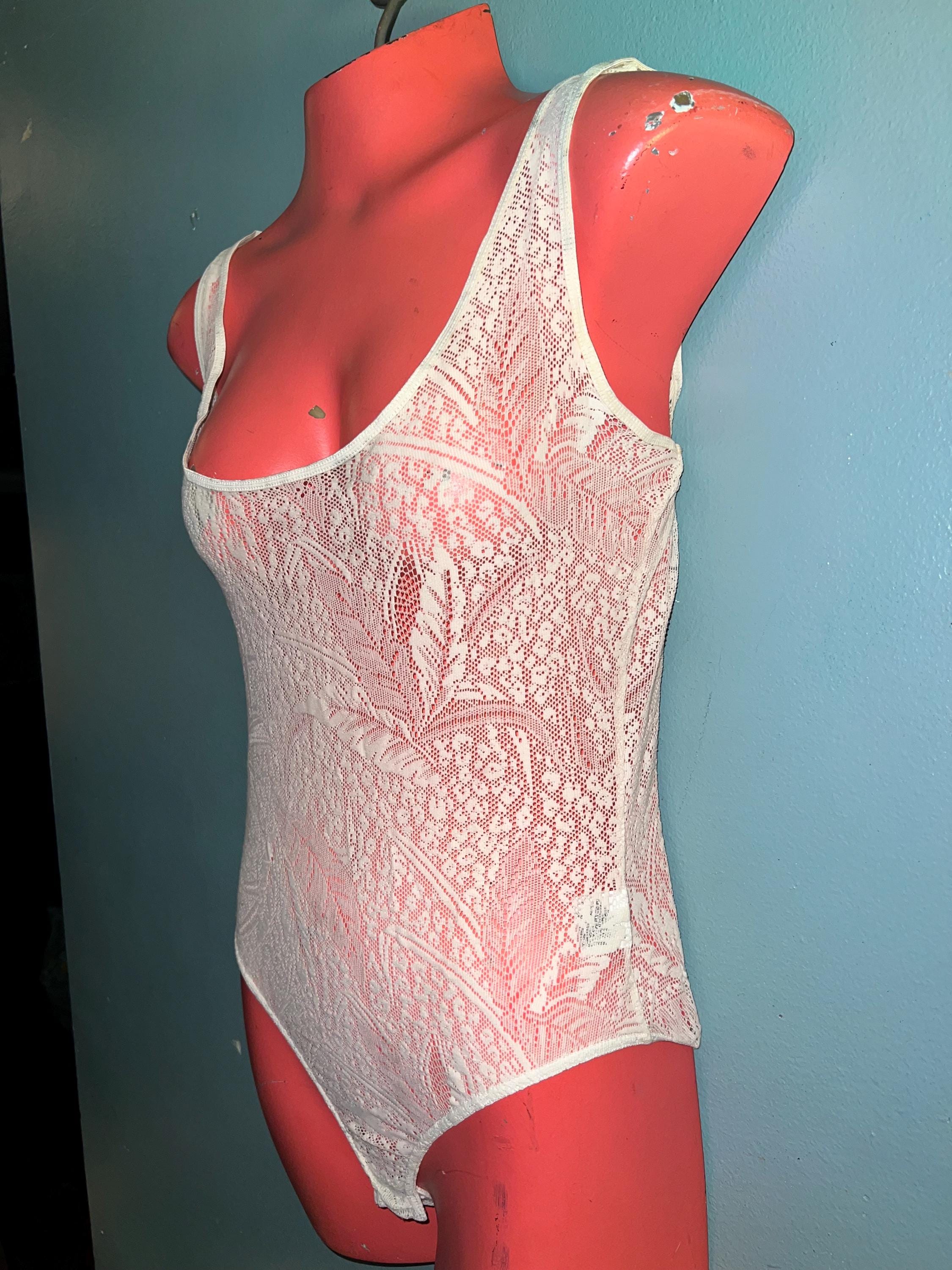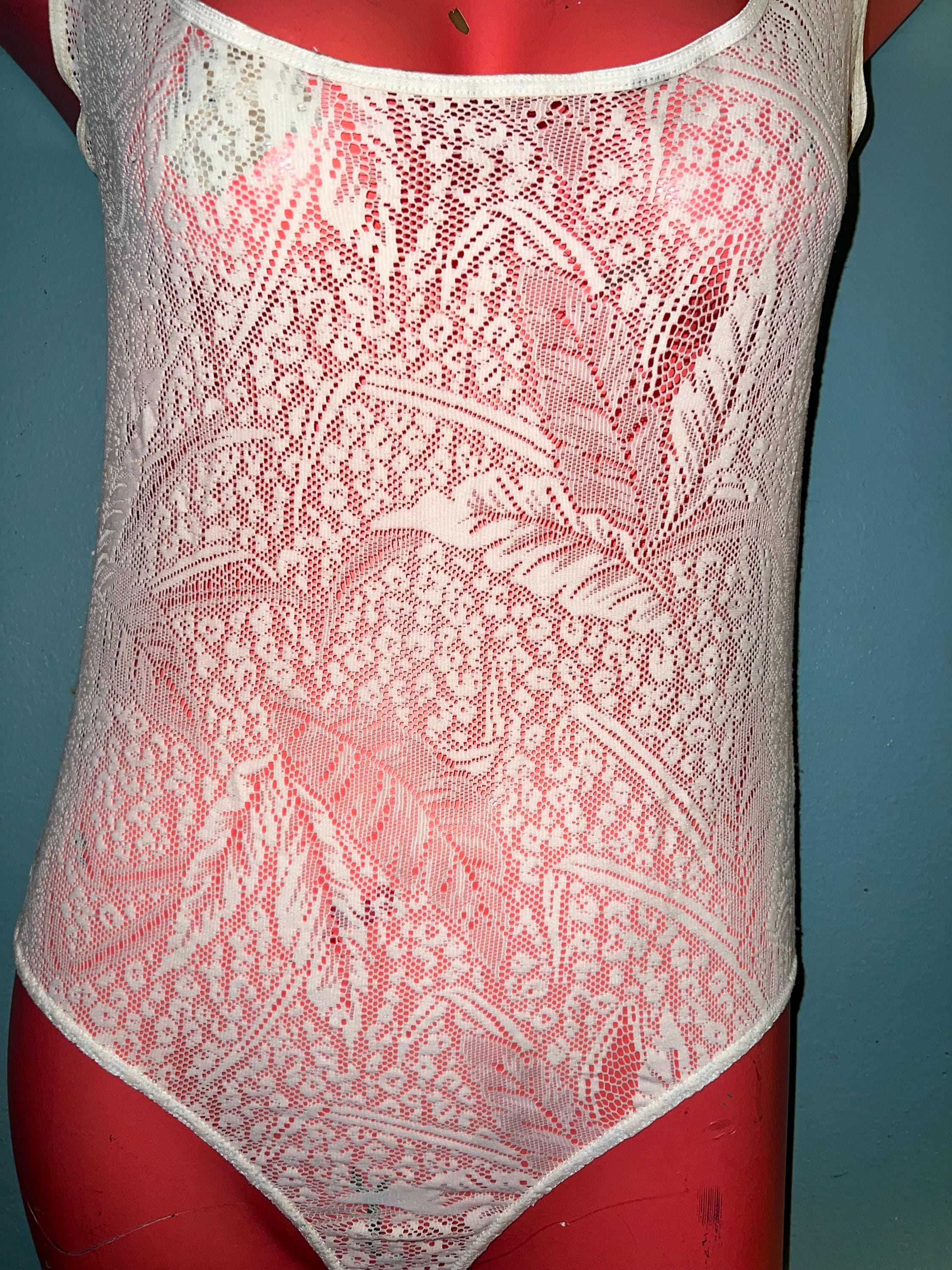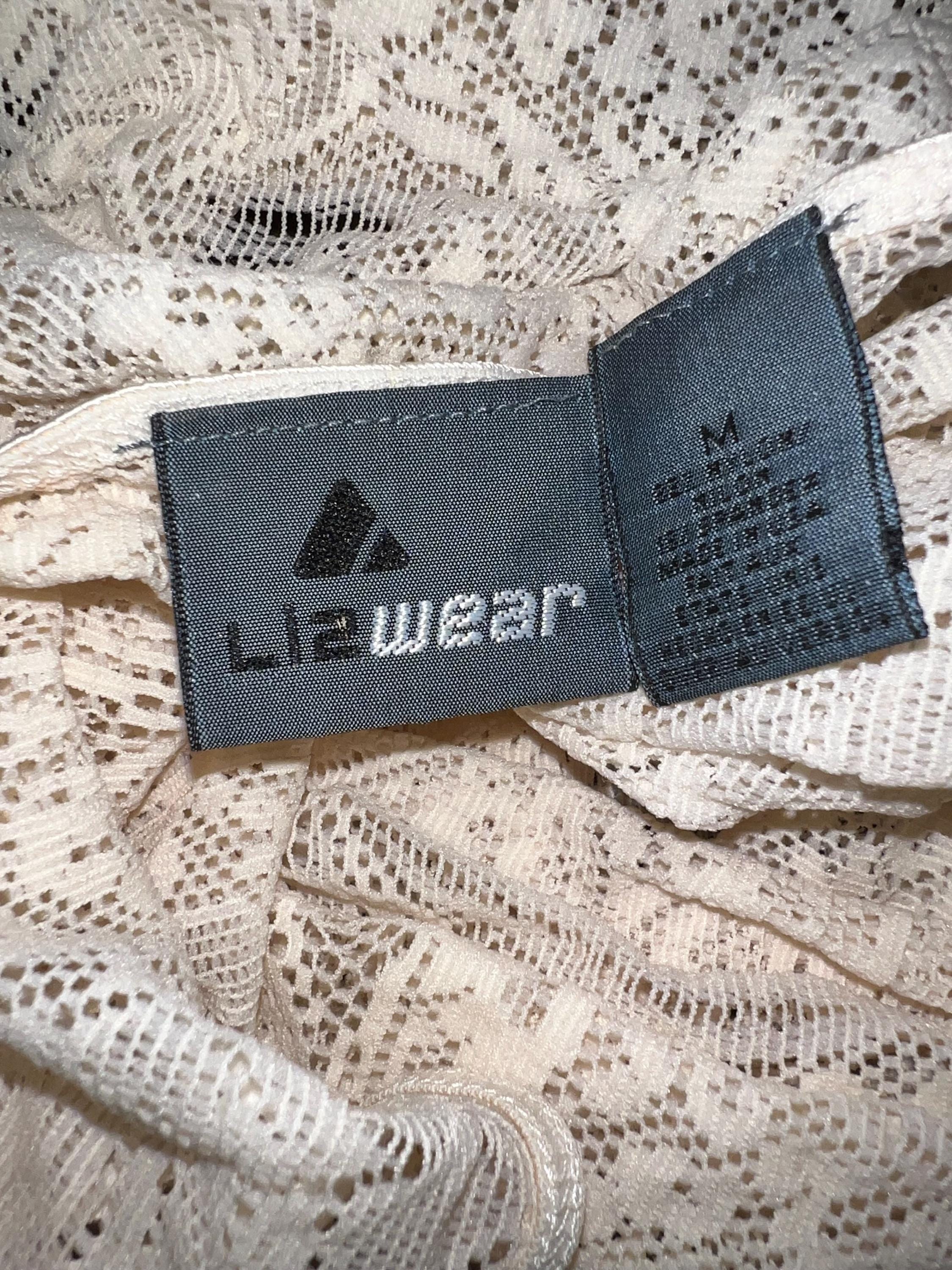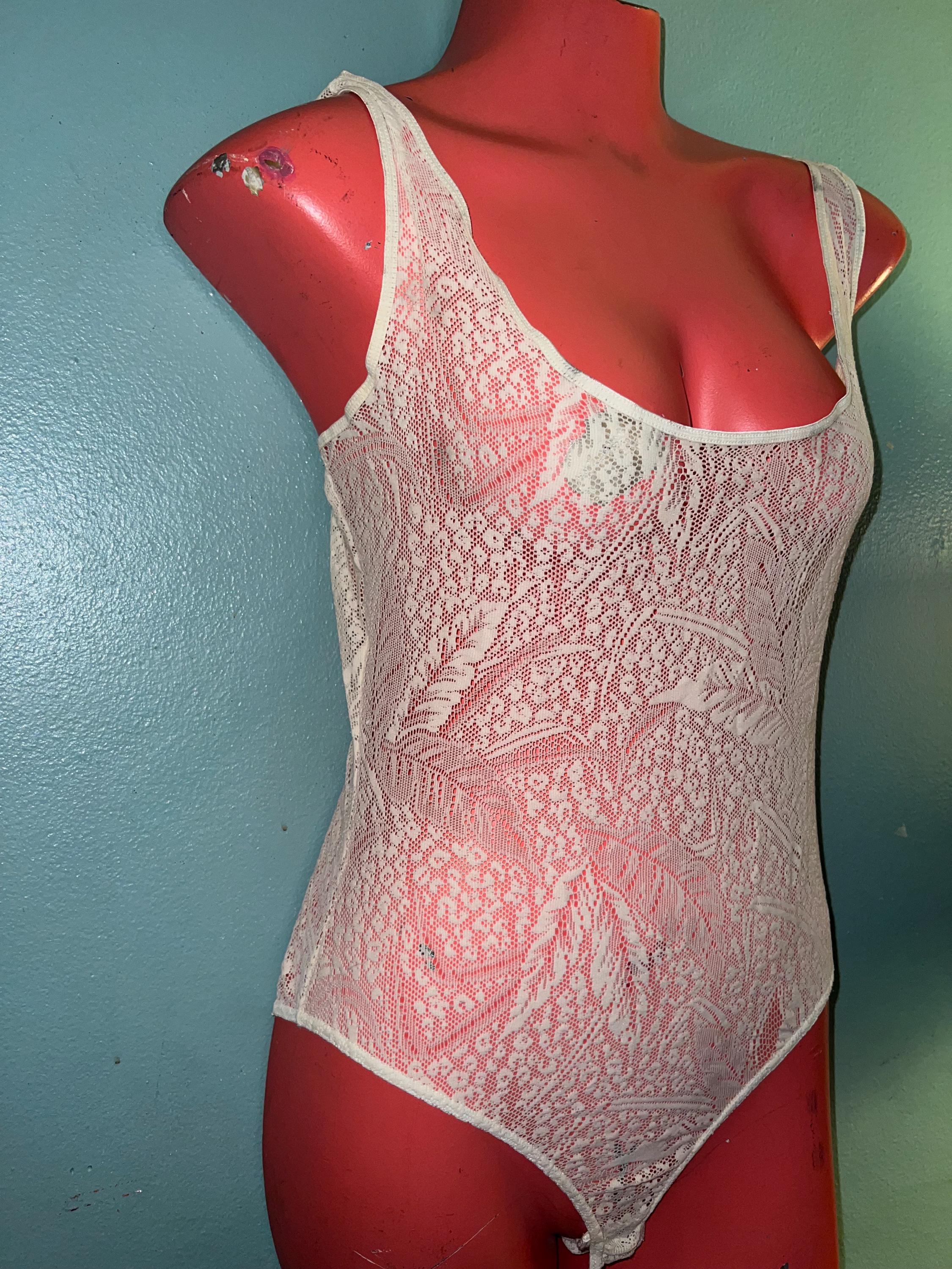 This is a gorgeous cream colored all lace bodysuit by Liz Claiborne (Liz Wear). It’s got a little stretching at the top as you can see in photos. It’s still super cute and goes with so many things!