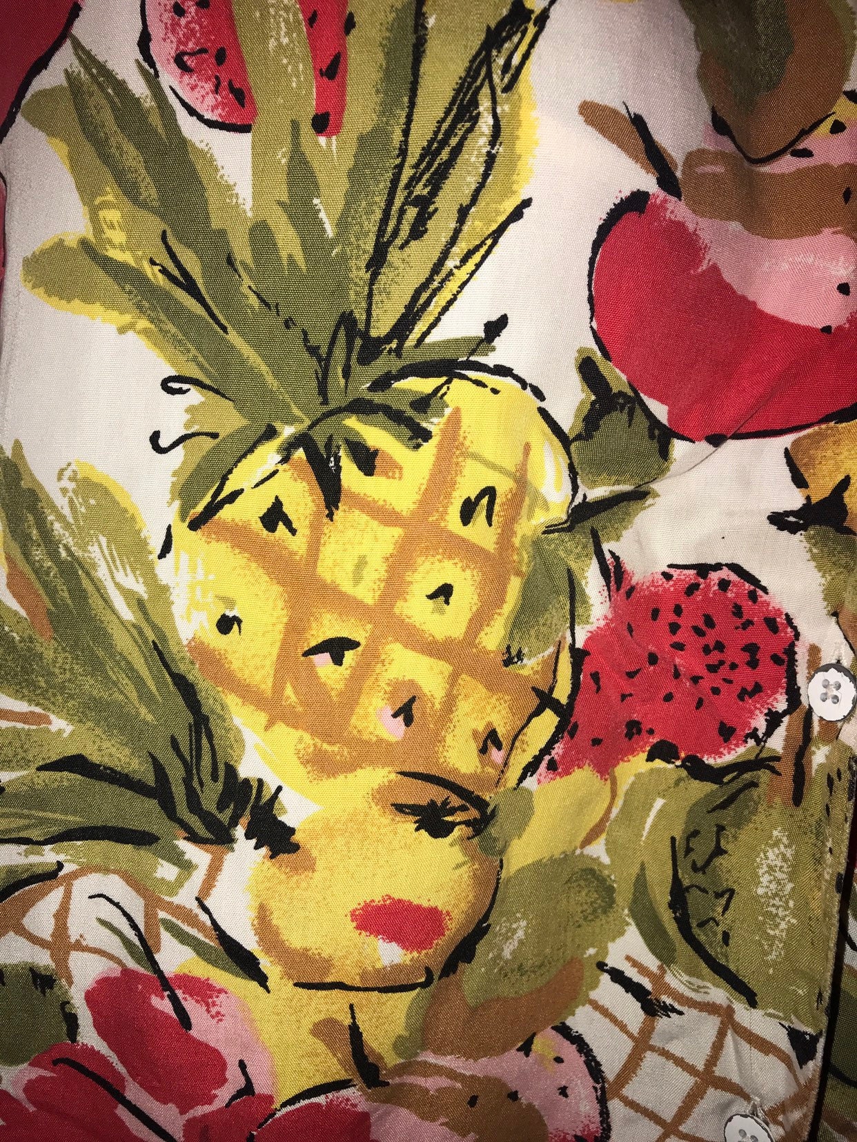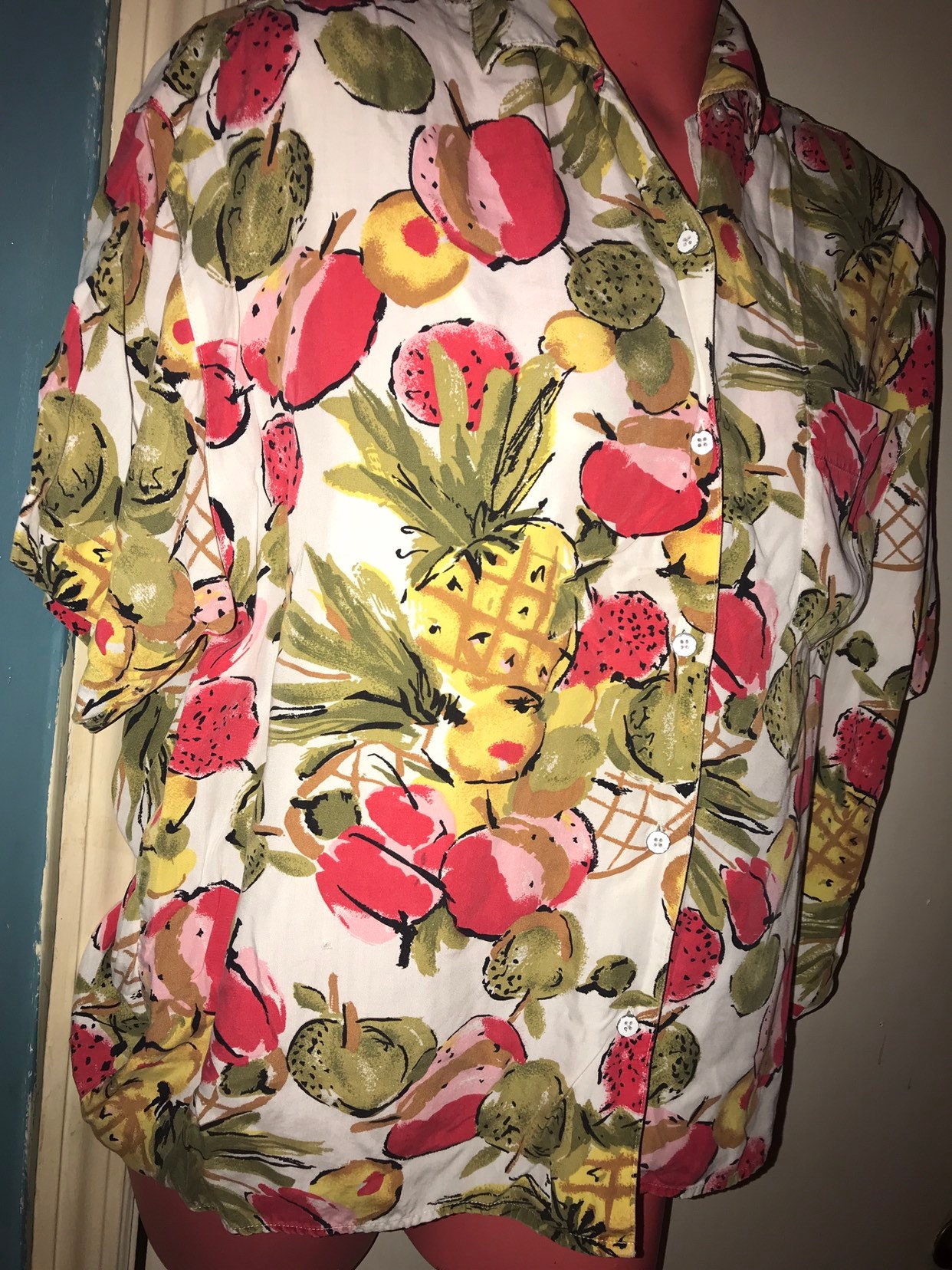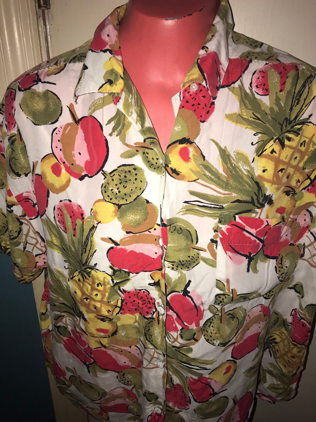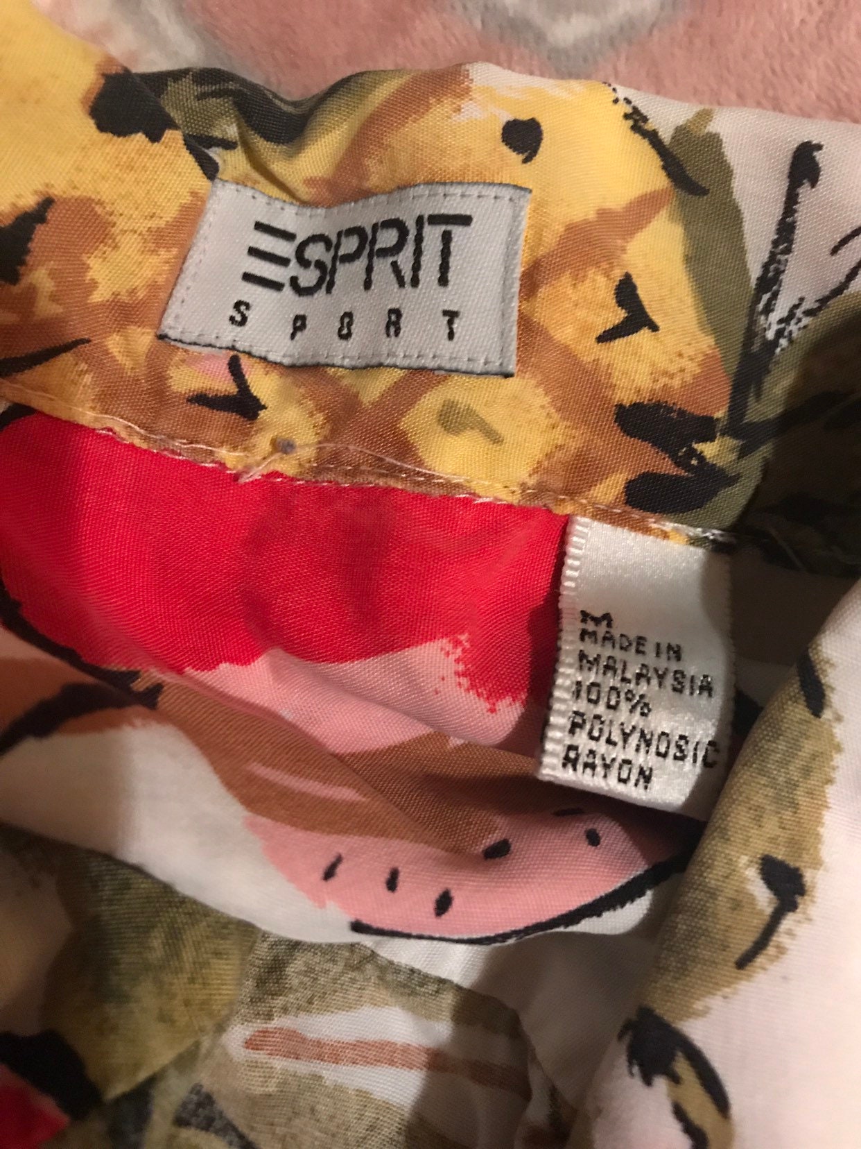 I love this great 80’s shirt! It is an Esprit Sport! I didn’t know they made cool Hawaiian shirts too. It has a great design and a wonderful feel to it. The only thing wrong as you can see in the photos, is all of the buttons are chippy. Like they are white but paint has chipped off over the years. If you don’t like it, the buttons could easily be replaced. It is really great!