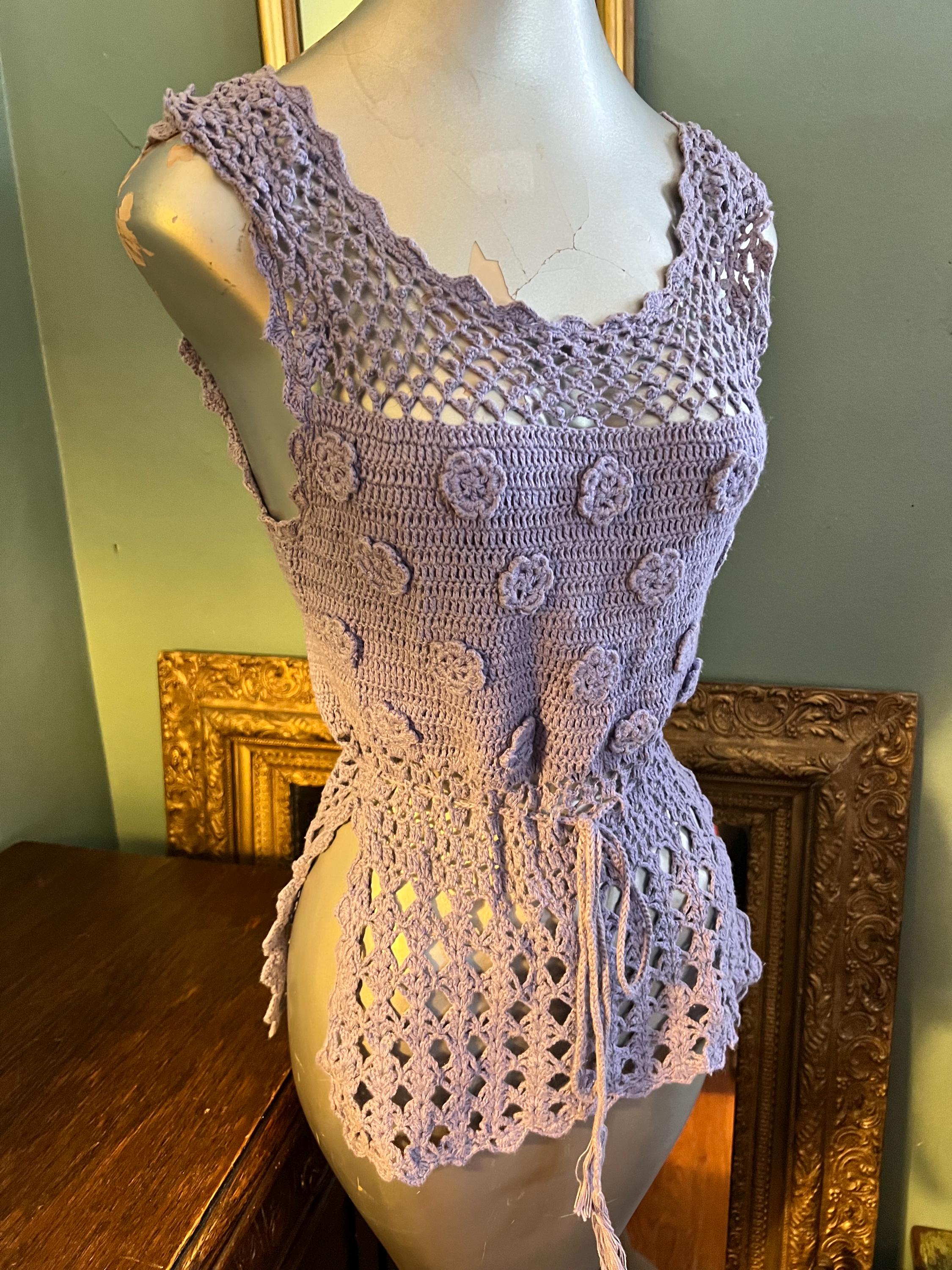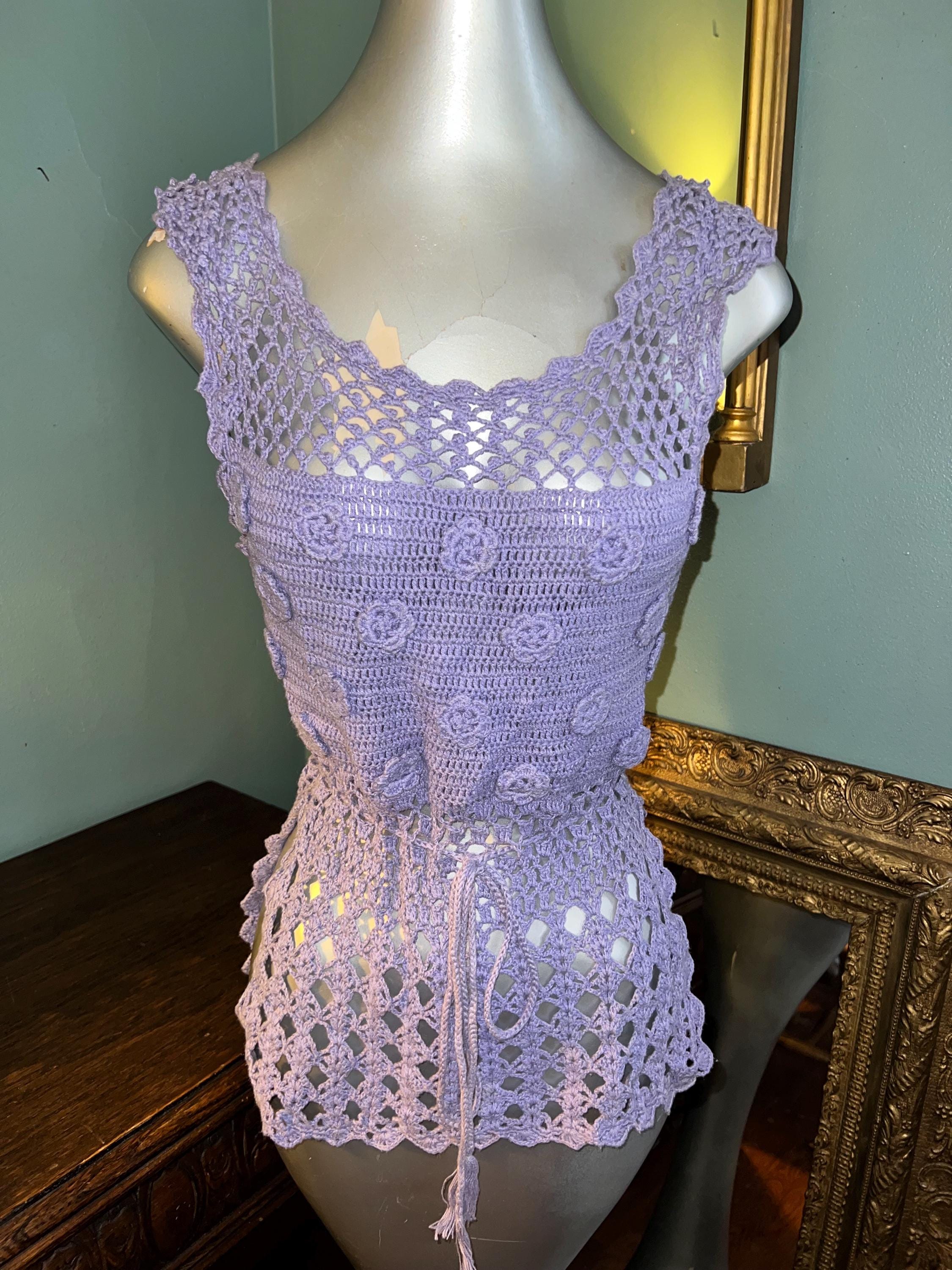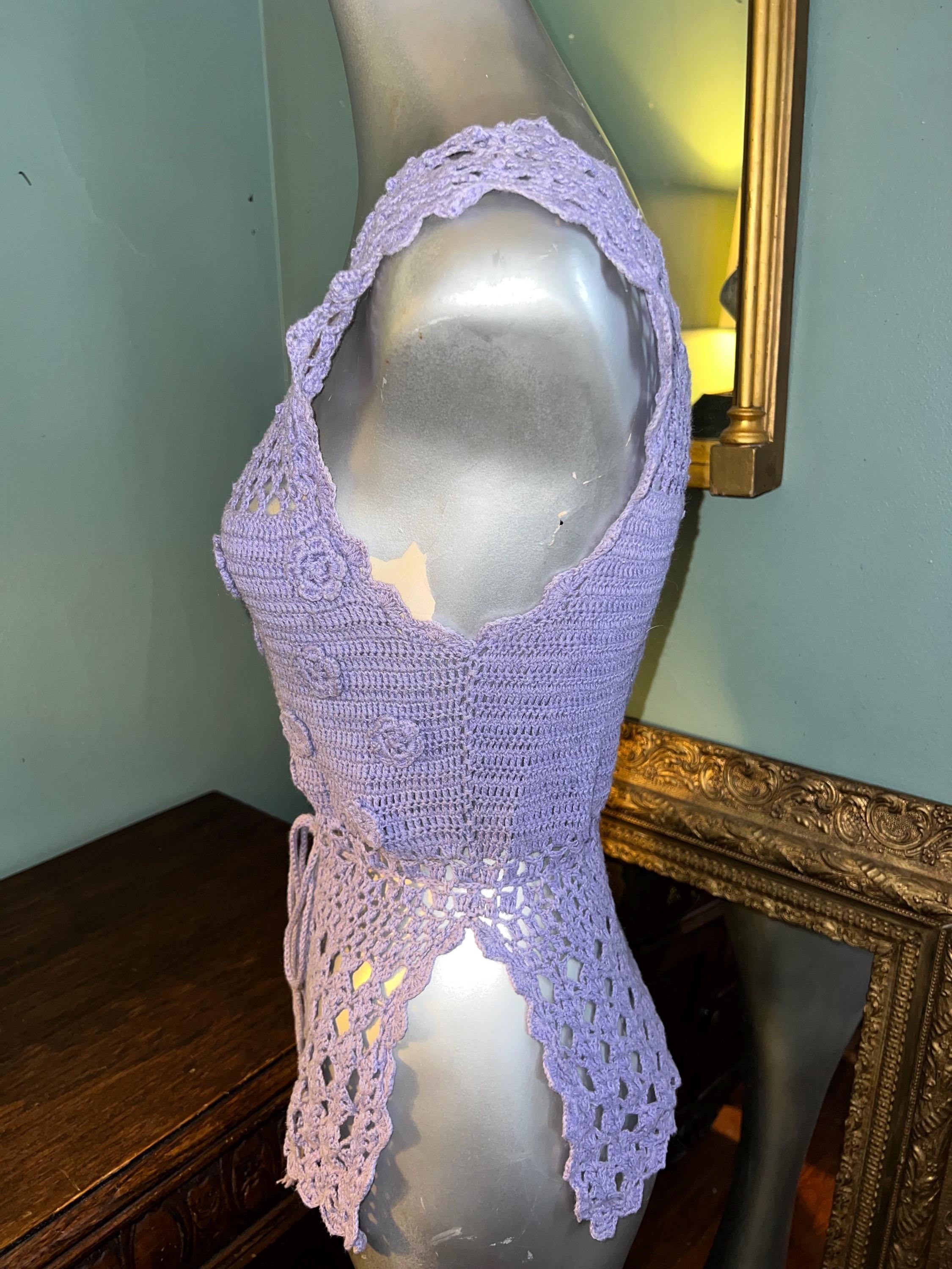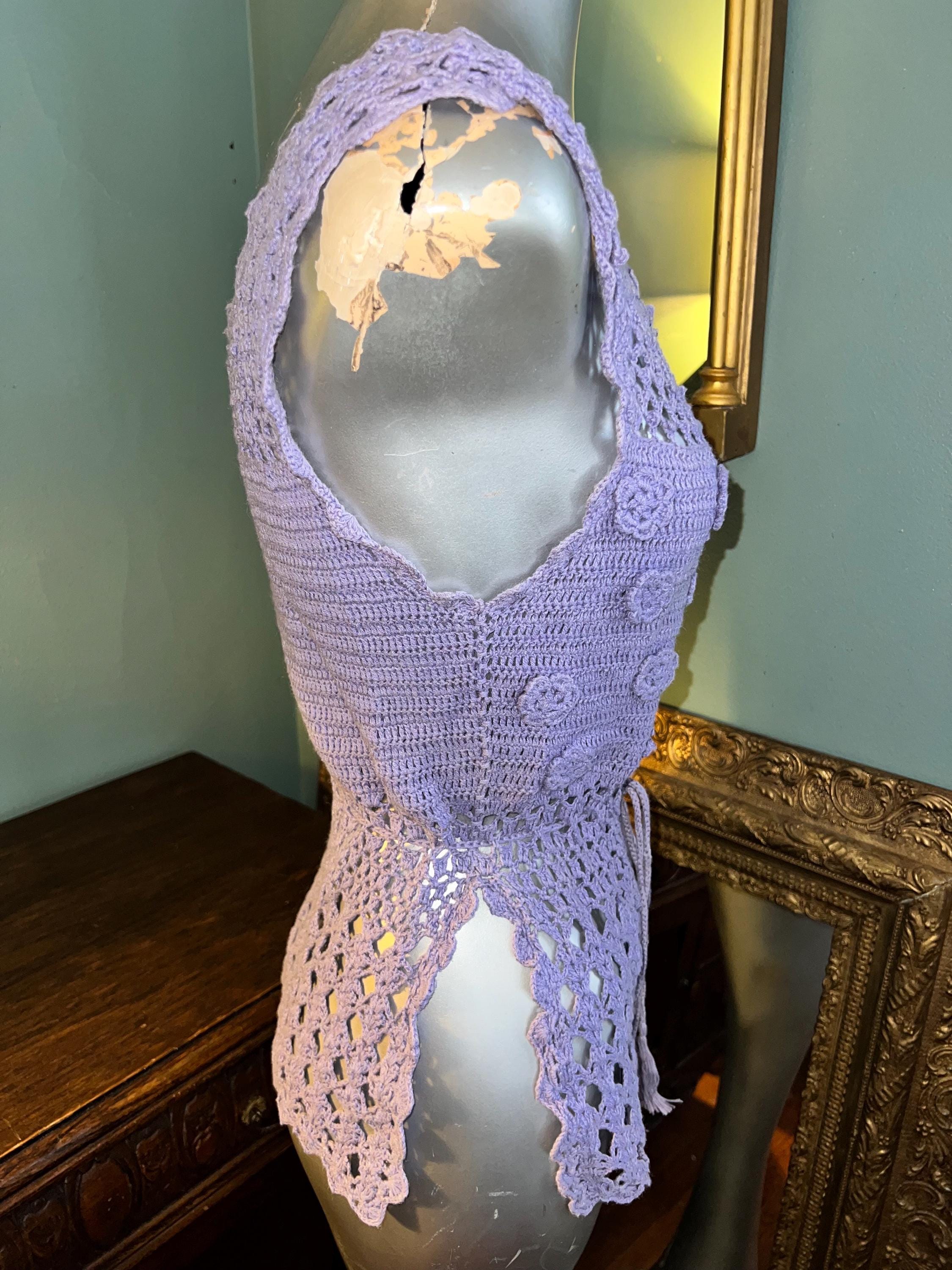 This is just too cute! I’m positive it’s from the early 90’s. It’s a really nice periwinkle purple and it has a drawstring at its center. Definitely made for a pretty thin person! It’s in good vintage condition.