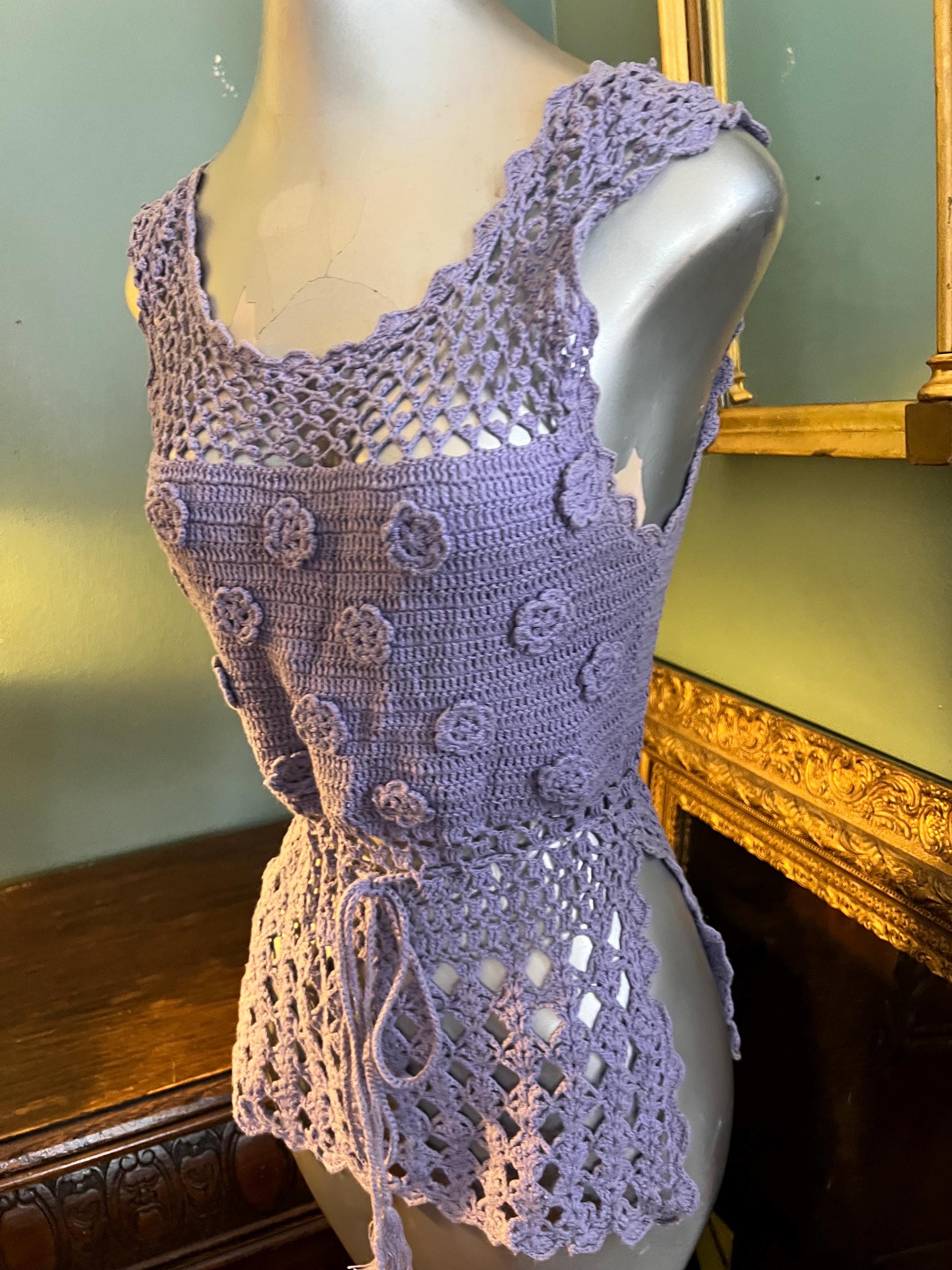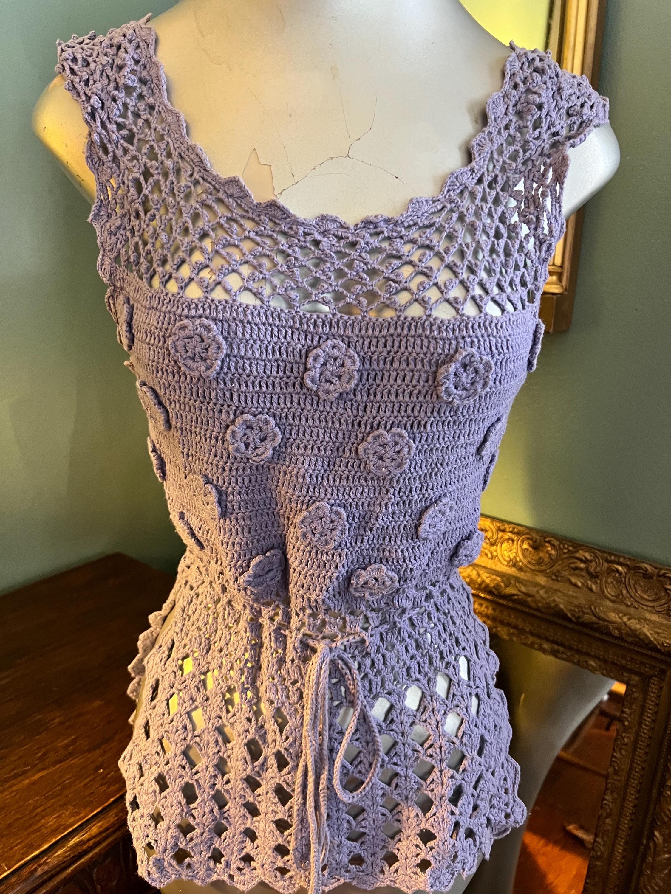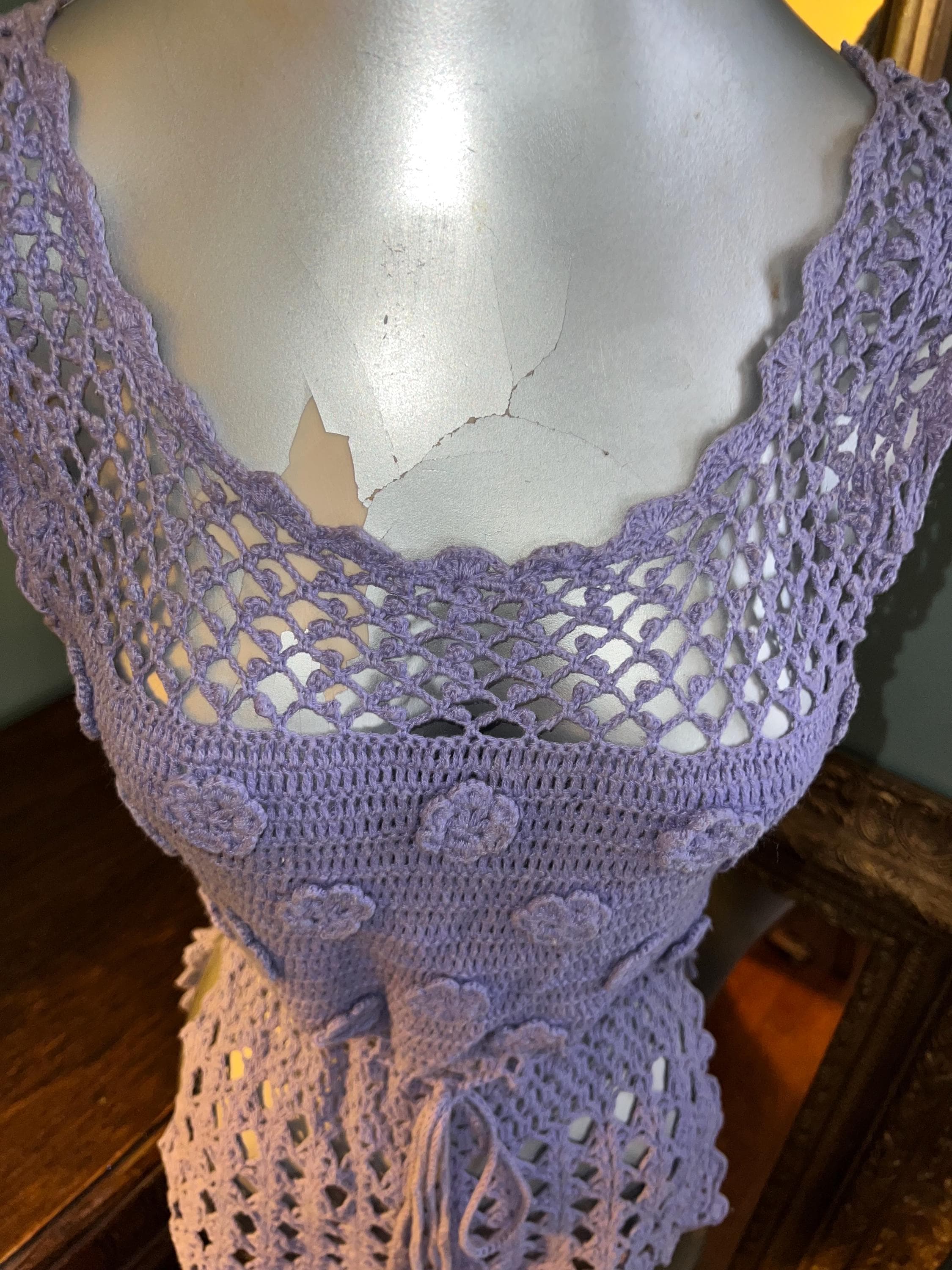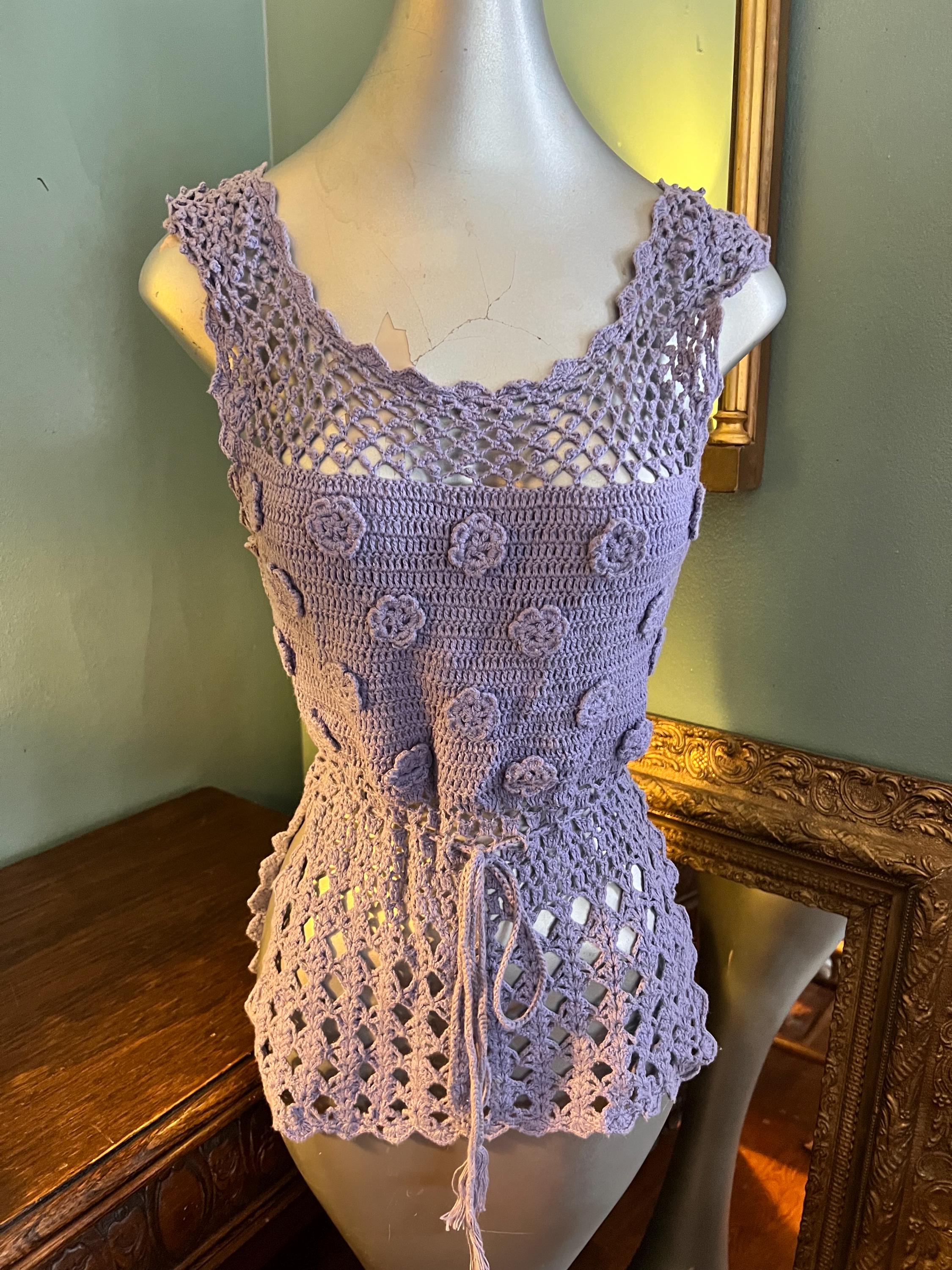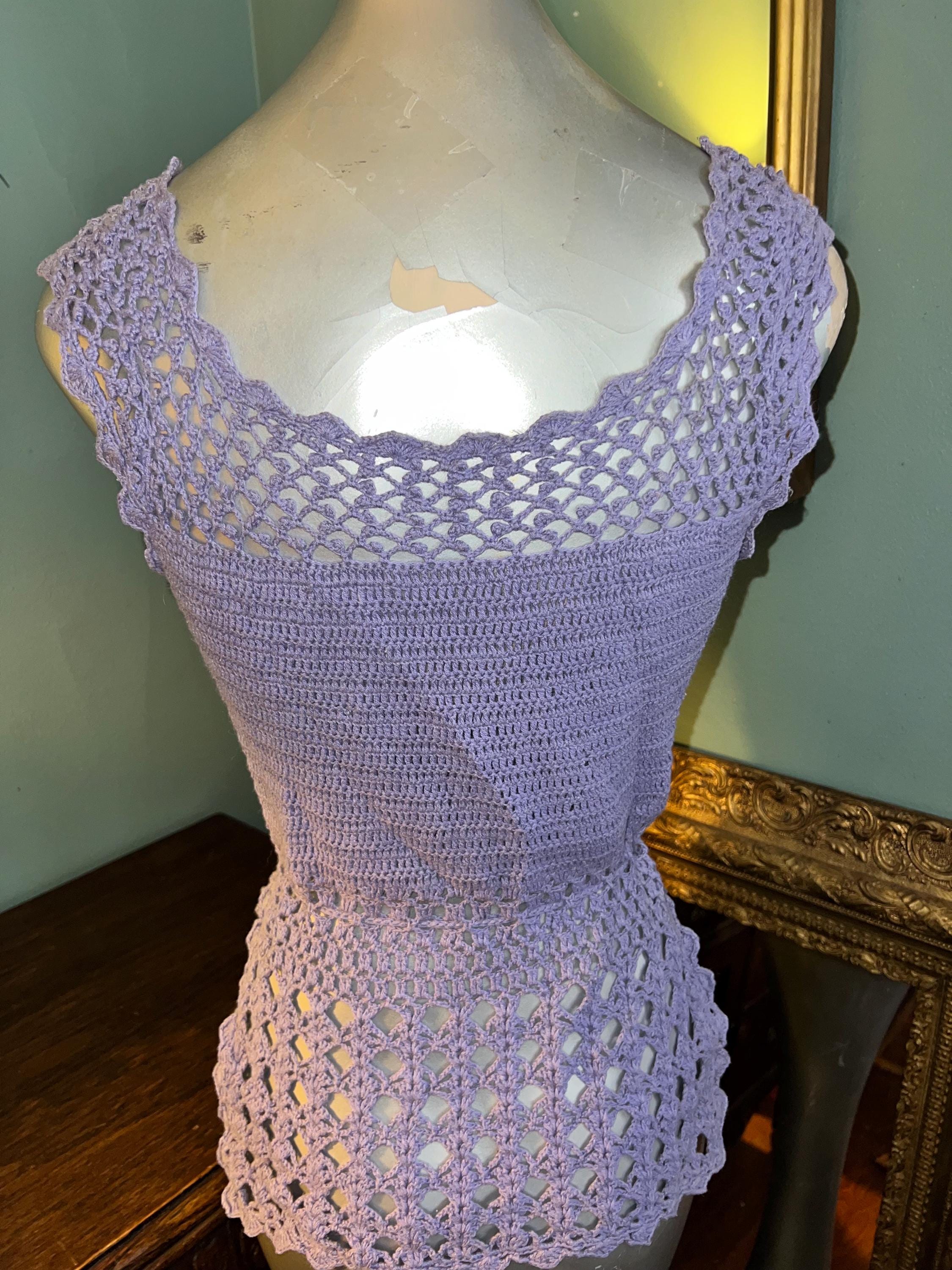 This is just too cute! I’m positive it’s from the early 90’s. It’s a really nice periwinkle purple and it has a drawstring at its center. Definitely made for a pretty thin person! It’s in good vintage condition.