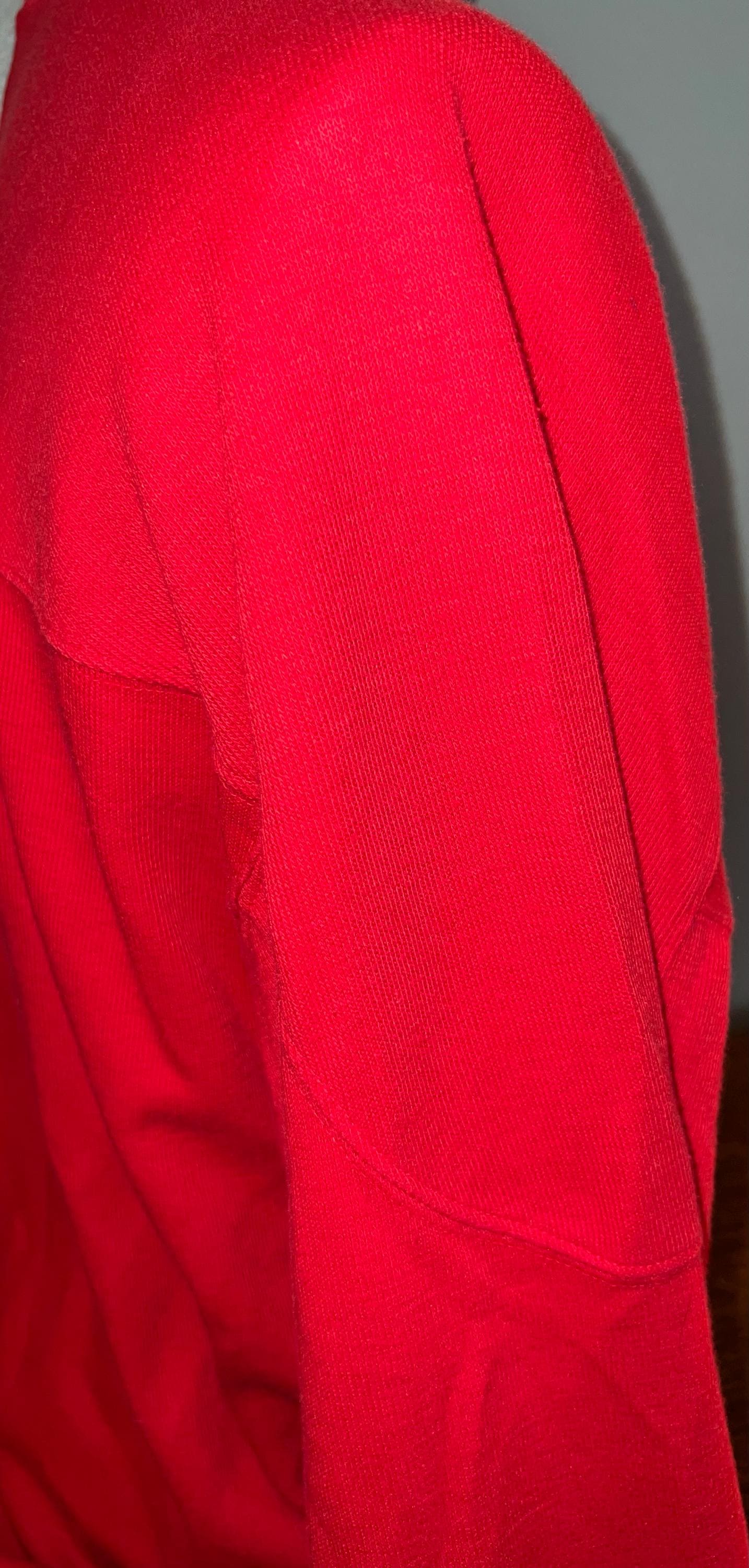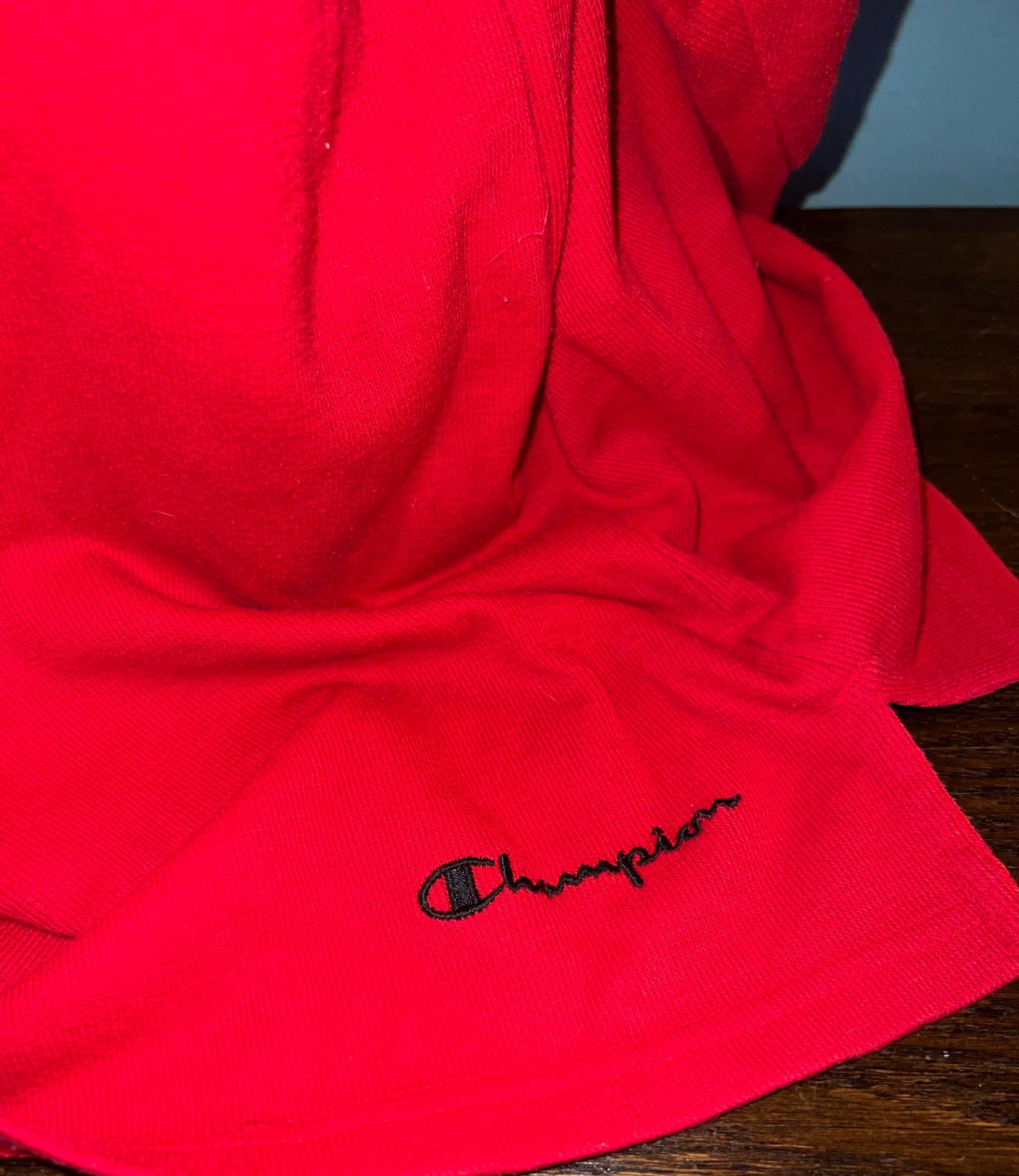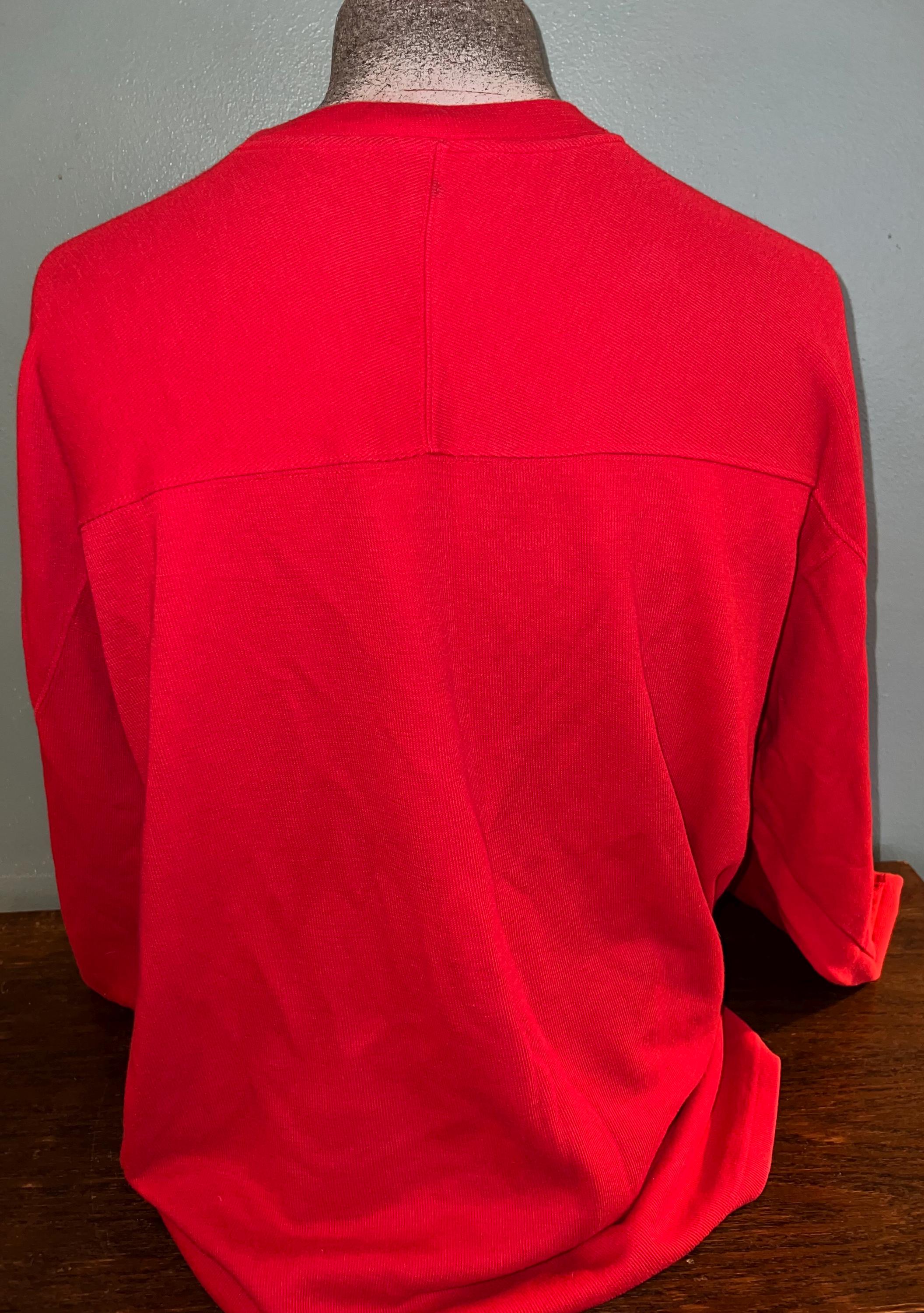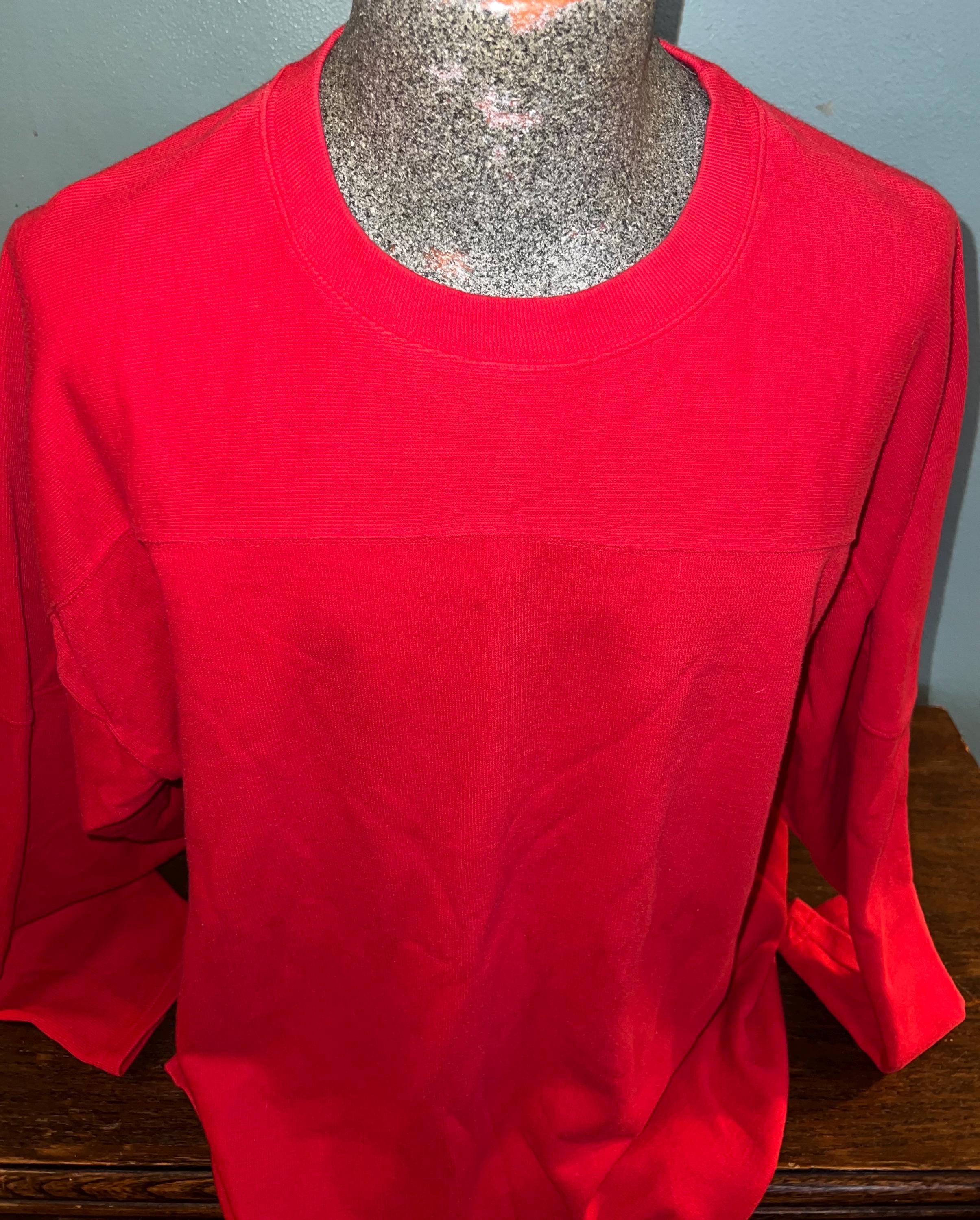 This is a really nice vintage 90’s red Champion shirt. It’s like thin sweatshirt material but a straight, long pullover shirt. It’s solid red with black “Champion” at the bottom. It’s in very good vintage condition!