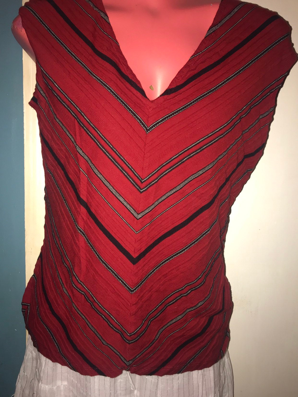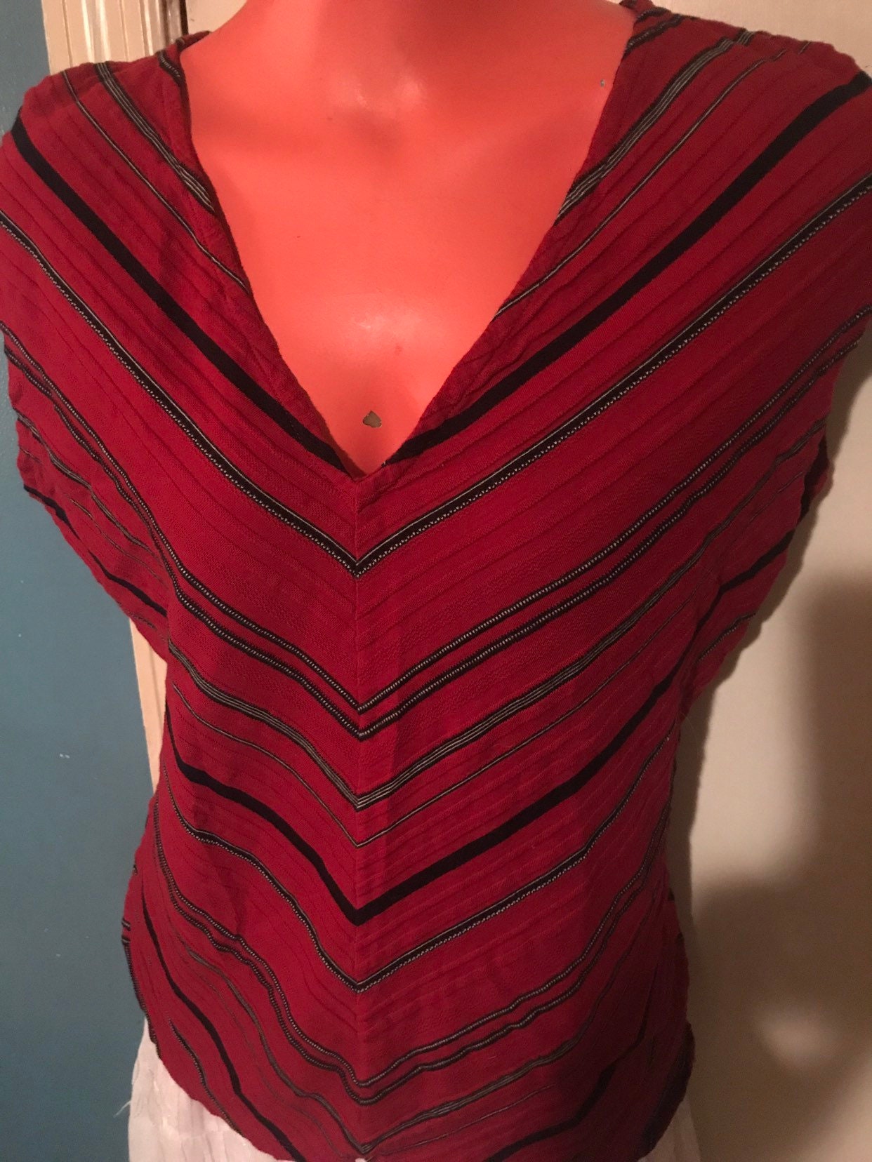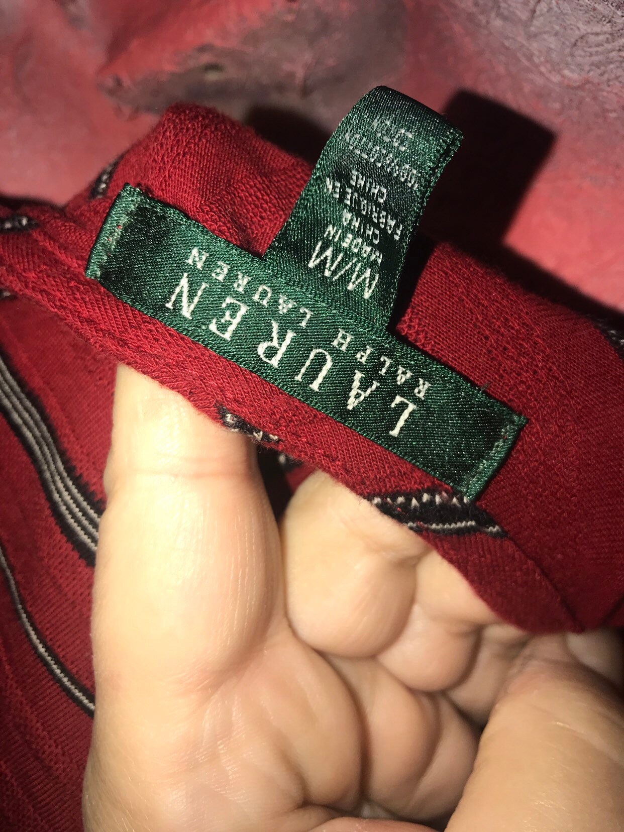 This is a nice short sleeved V-Neck Ralph Lauren shirt. It red with stripes in a v pattern. It’s in good vintage condition.