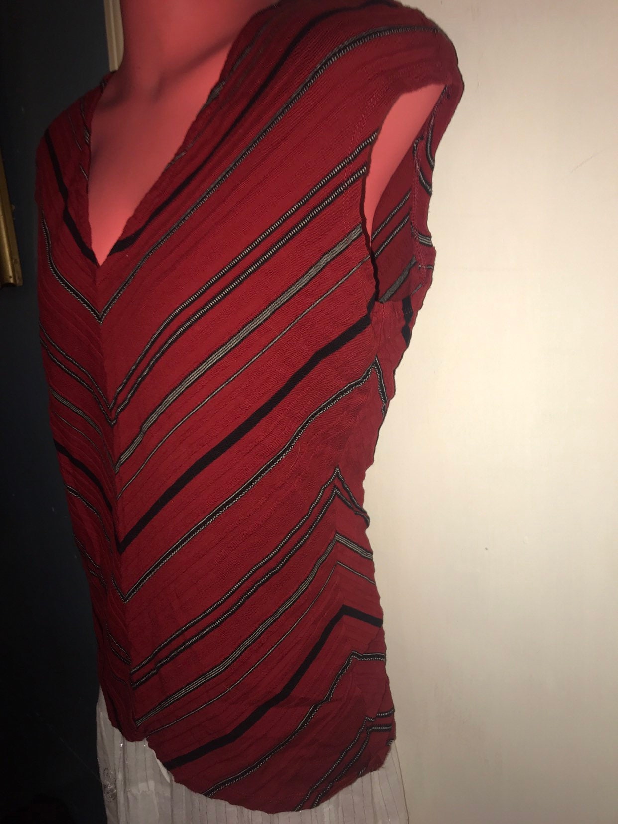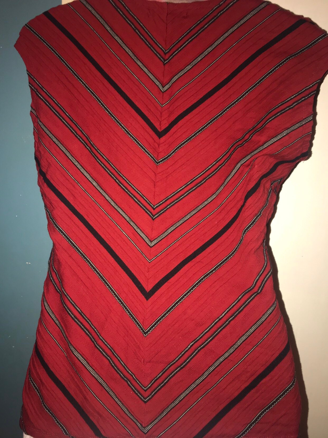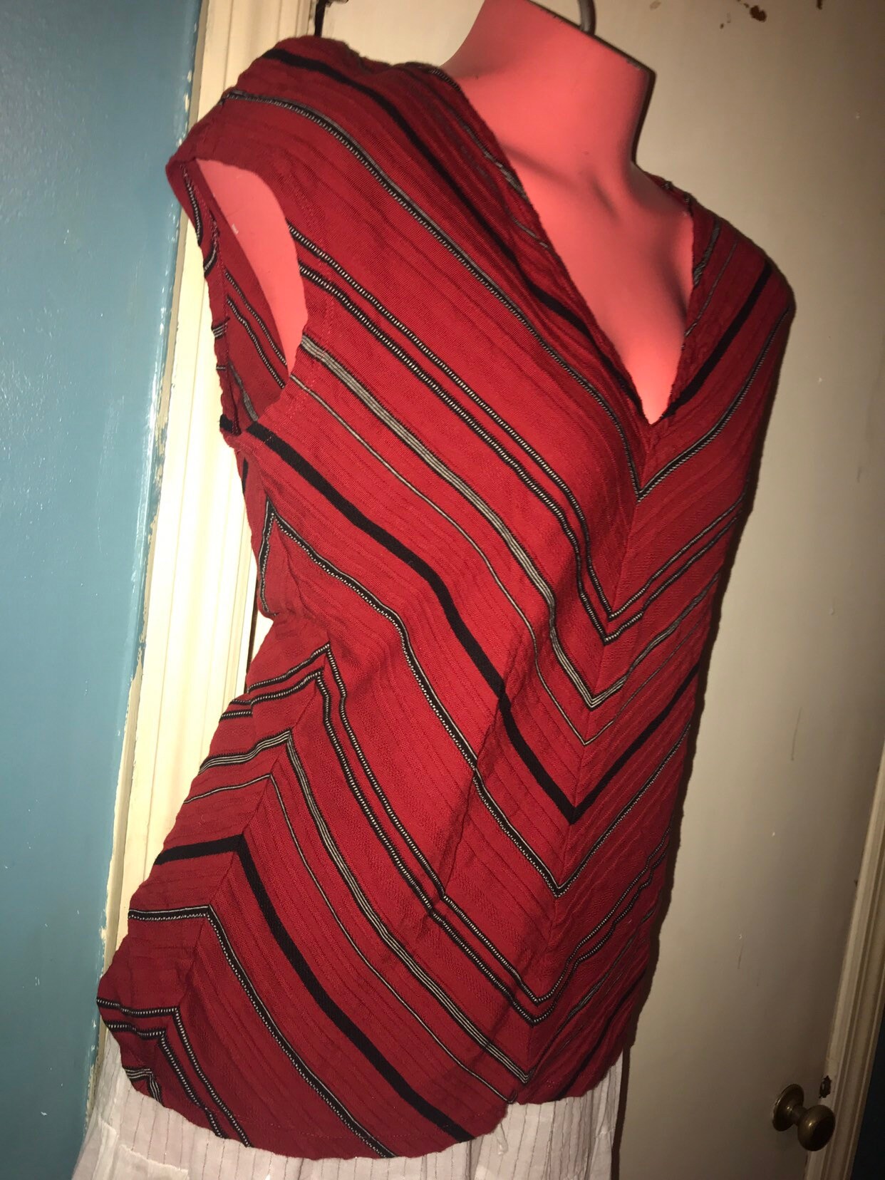 This is a nice short sleeved V-Neck Ralph Lauren shirt. It red with stripes in a v pattern. It’s in good vintage condition.
