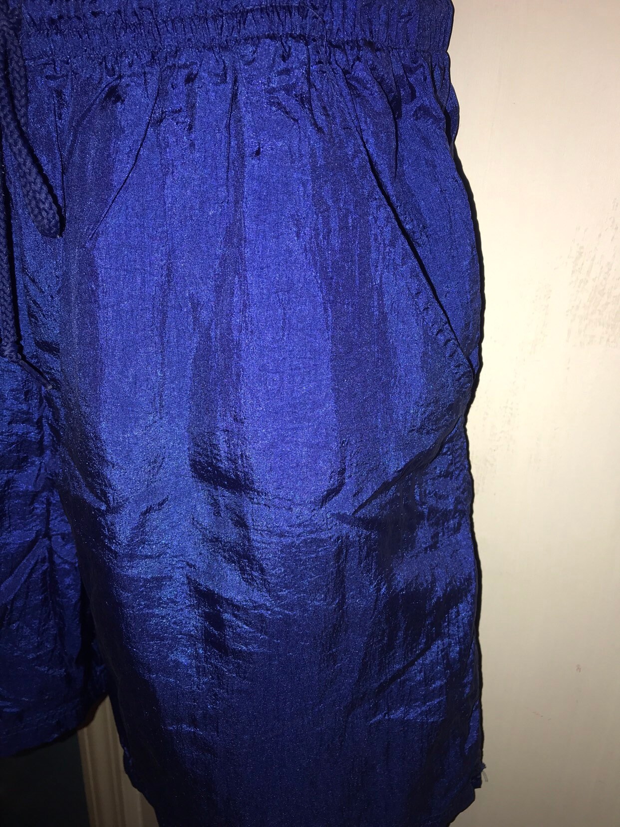 These are nice blue windbreaker shorts from the 80's or 90’s! They are unlined and in good vintage condition. They have a drawstring elastic waist and pockets.
