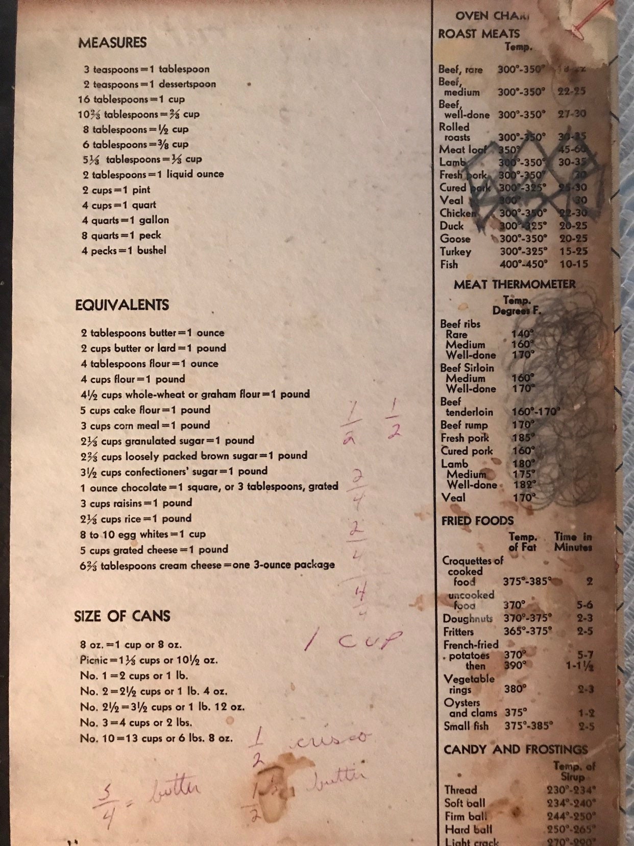 I love old cookbooks. This one is really great, it has a lot of information in it that you won’t find in cookbooks today. This one was printed in 1940, it is a binder and a few of the pages are ripped at the holes but they are still included. The binding on the outside is ripped (see photos with all of this). There are many areas where someone has written in the book with pencil. It’s not in the best condition but why would it be after 80 years of kitchen use!!!! I think it’s awesome. It has things like;