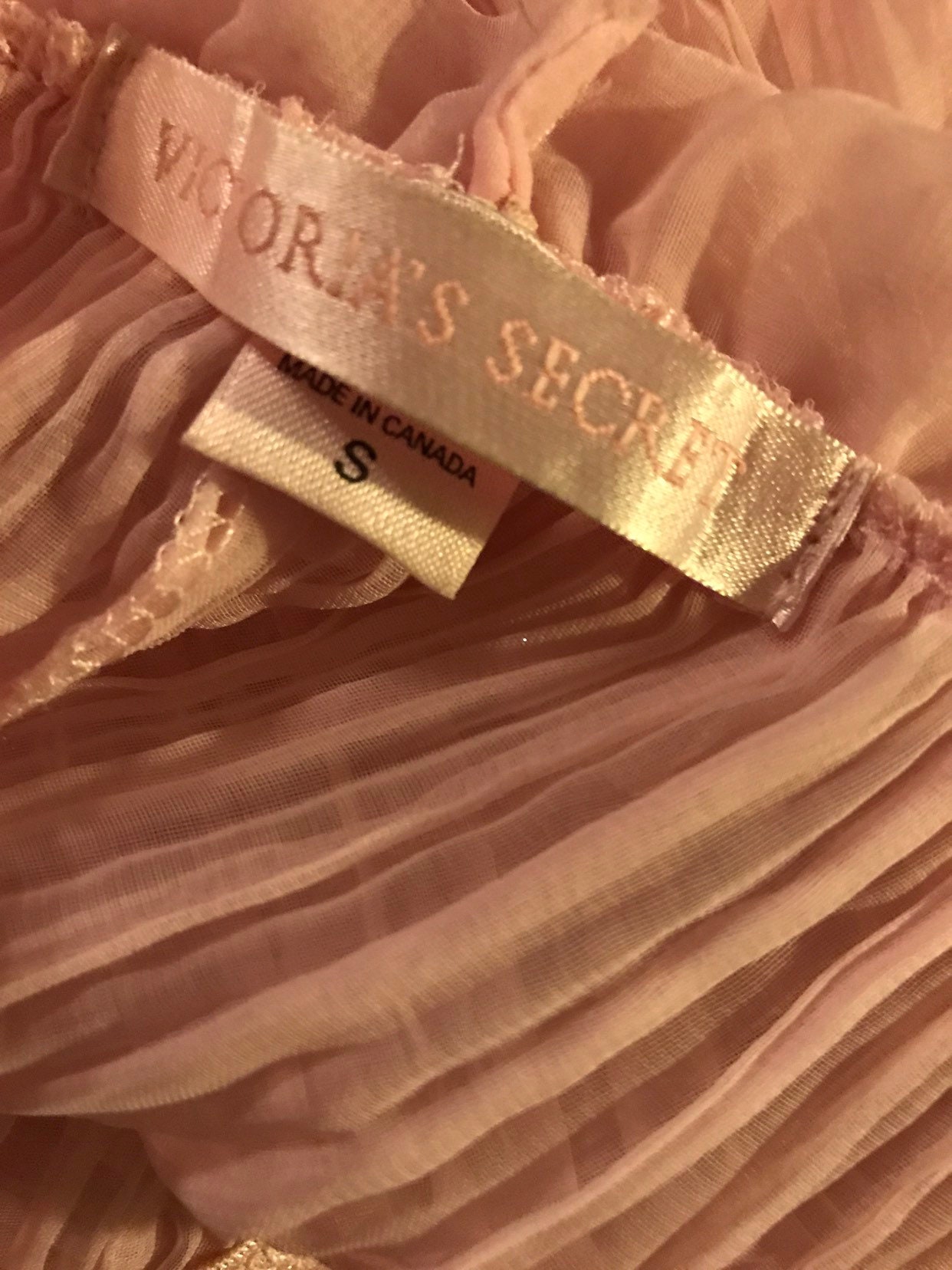 This is a very pretty short pink accordion ruffled pink, sheer nightie by Victoria’s Secret. It has non-adjustable straps with ruffled sheer on them, and a tiny rosette on each side of the bodice. It’s terribly cute and sexy too! It’s in good condition.