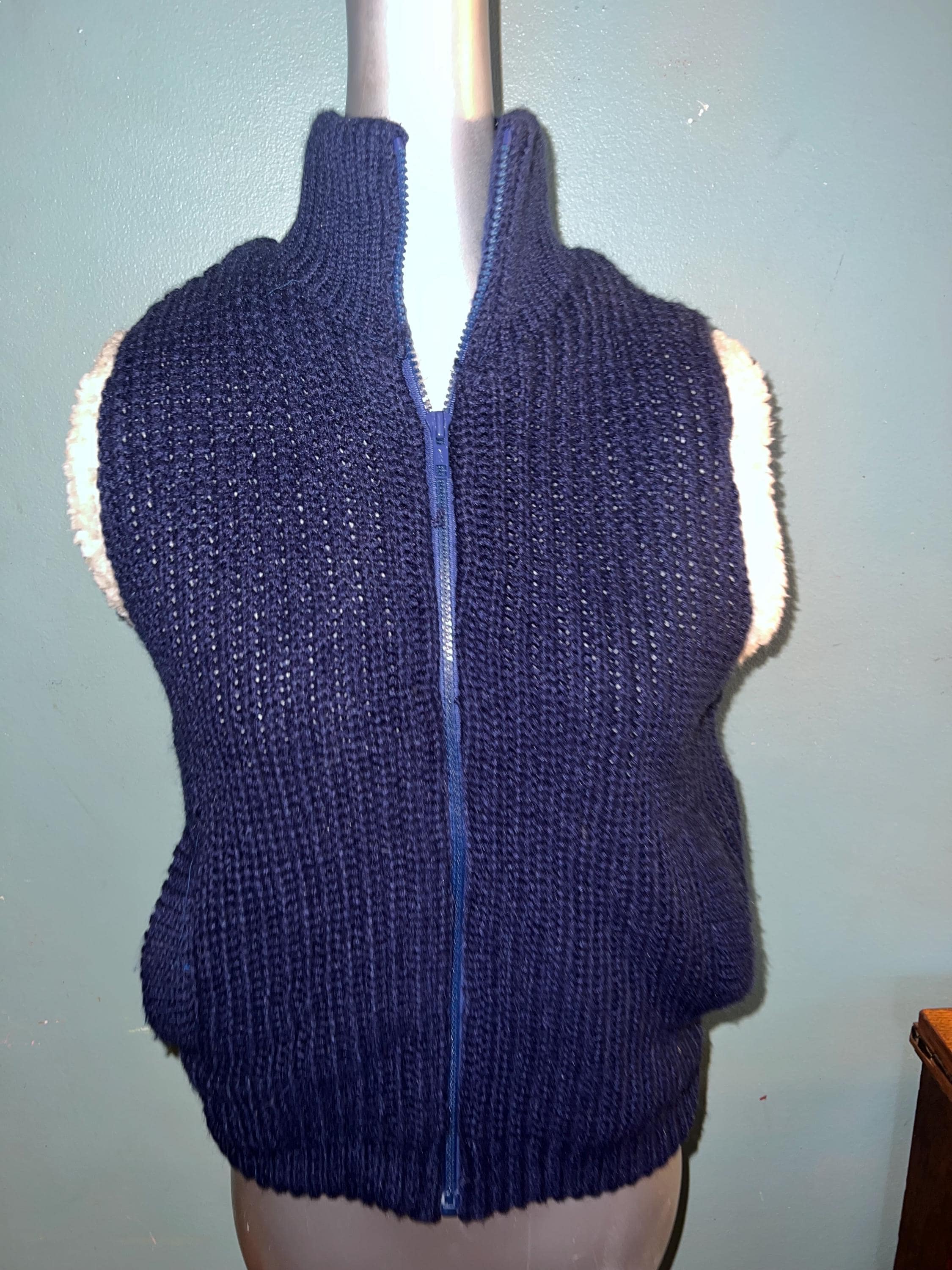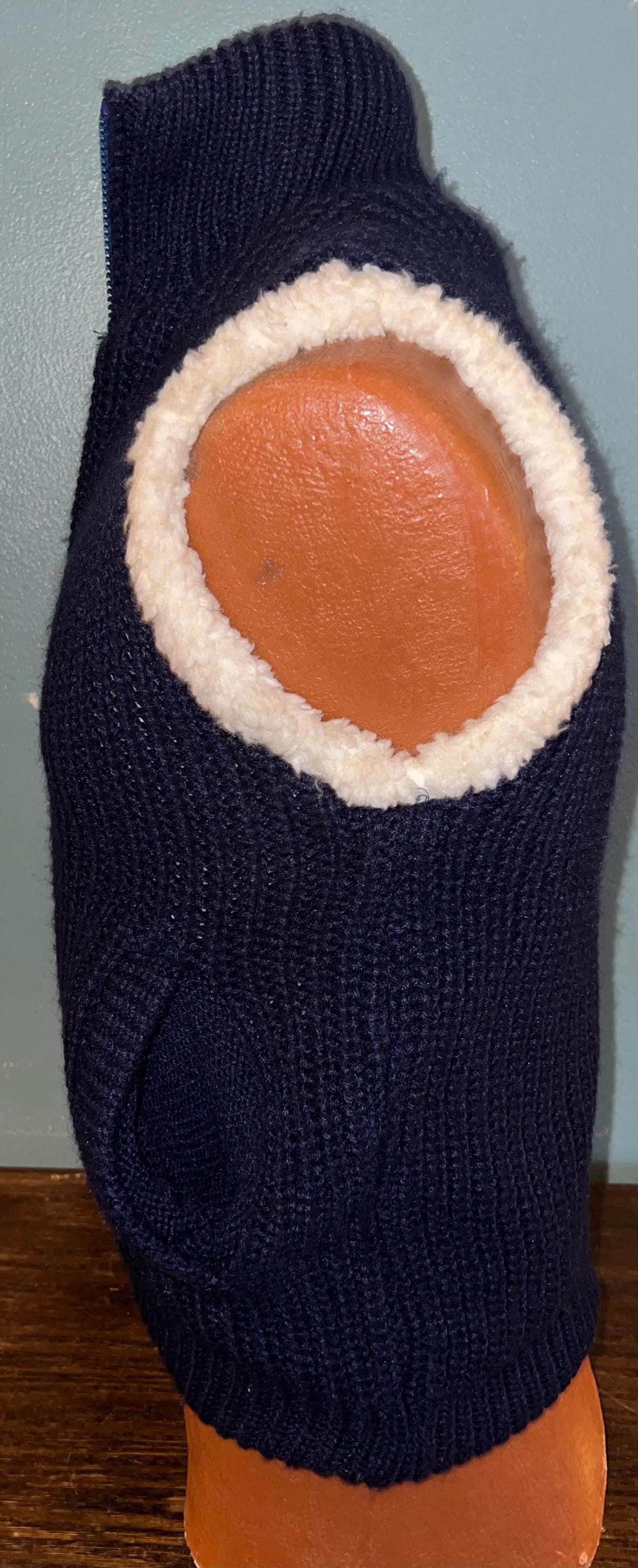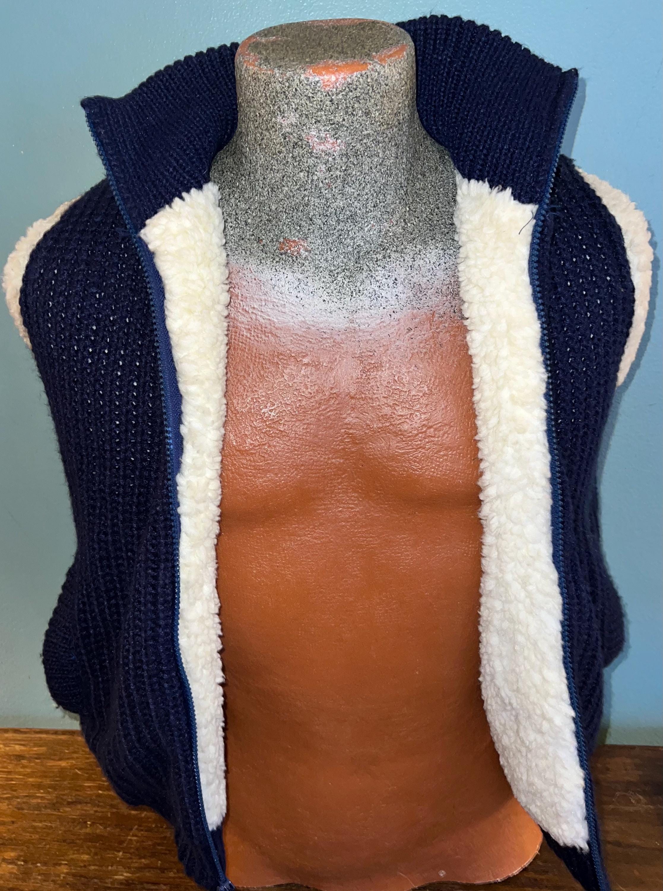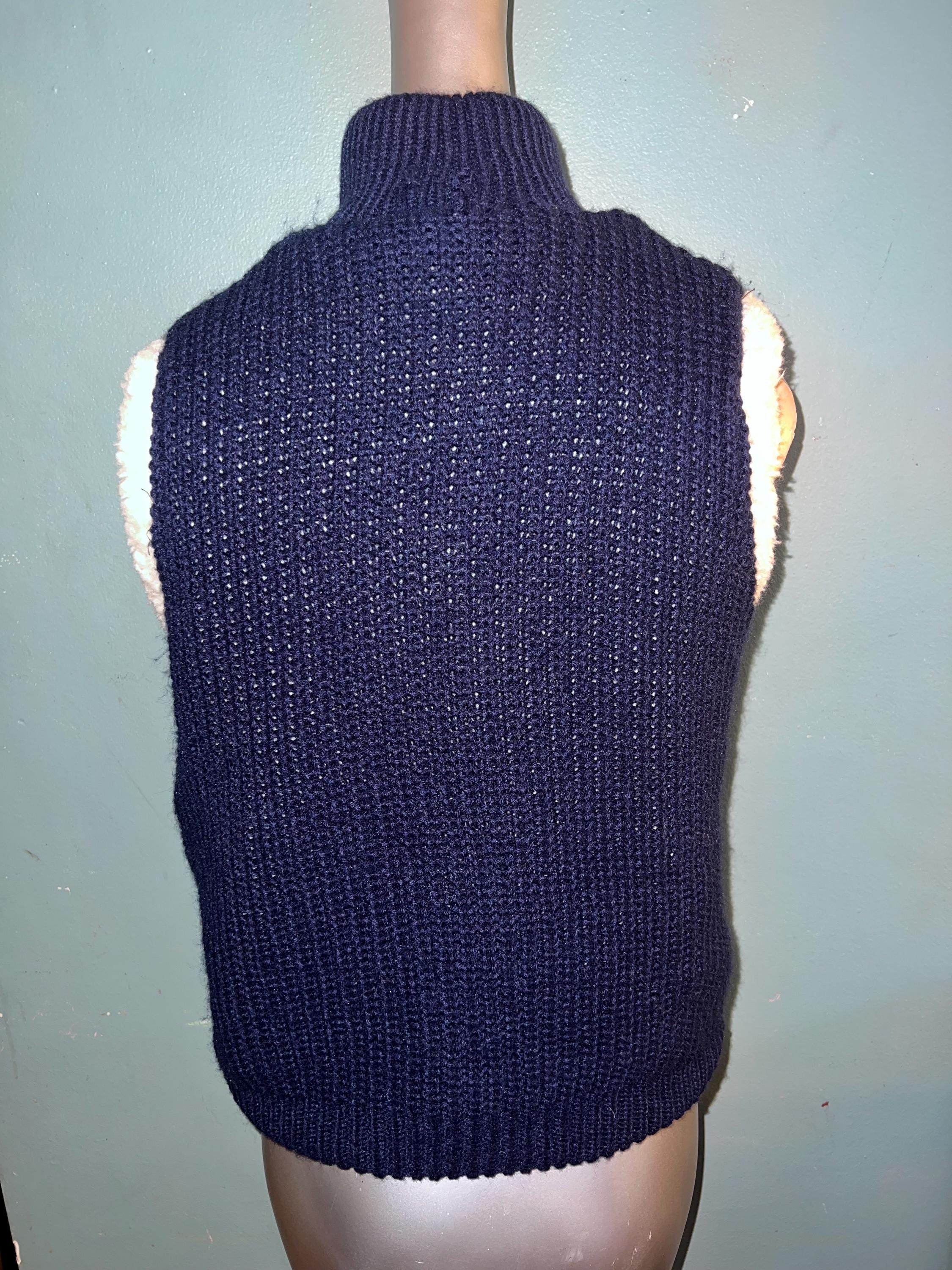 This is a navy blue sweater vest with outside pockets. It’s lined in fluffy white Sherpa. The only thing wrong with it is a pulled little hole on the back of the neck, (see photo). Other than that it’s in good vintage condition. It’s a size small and that means Small! I’d say it’s definitely unisex