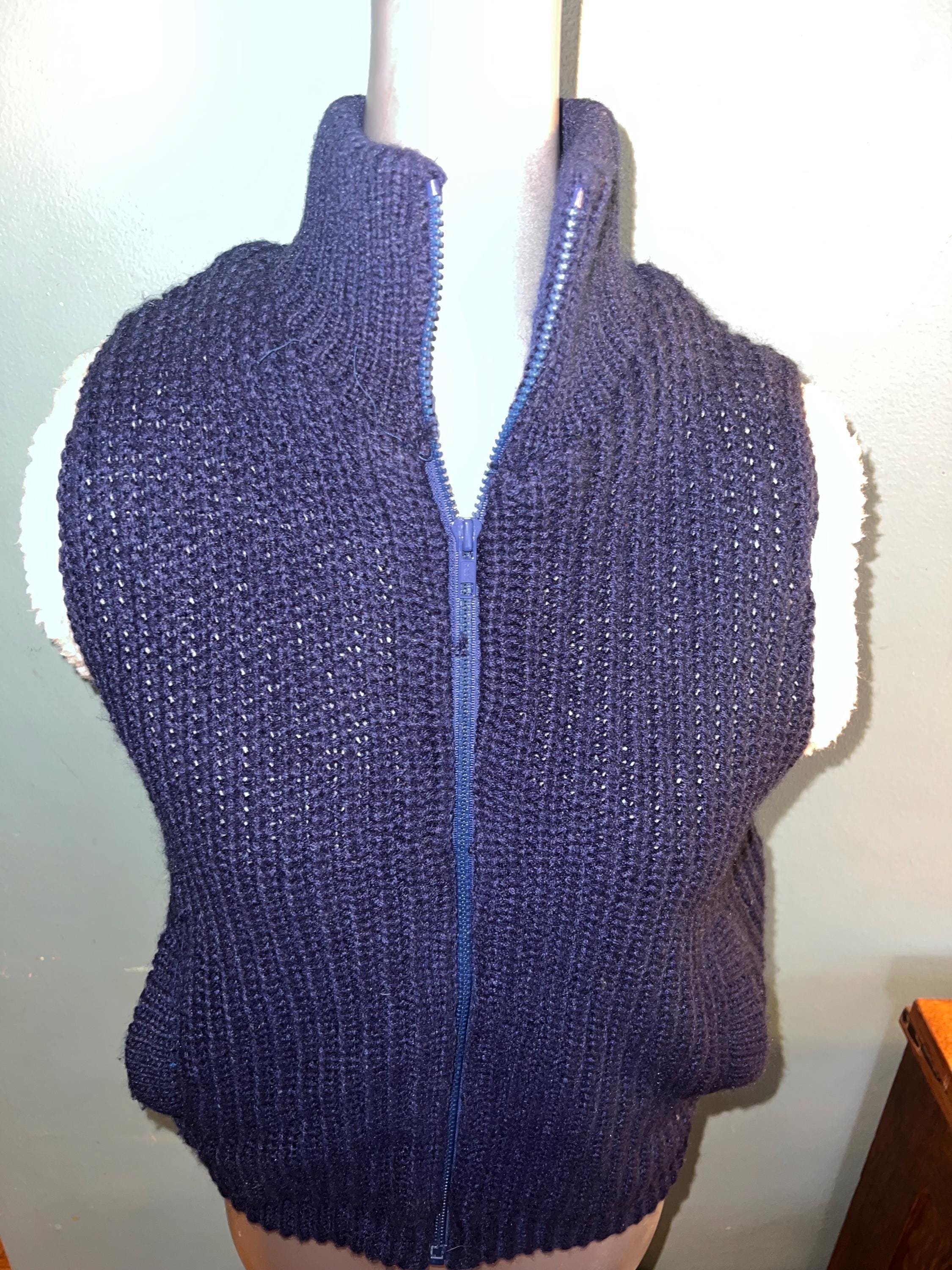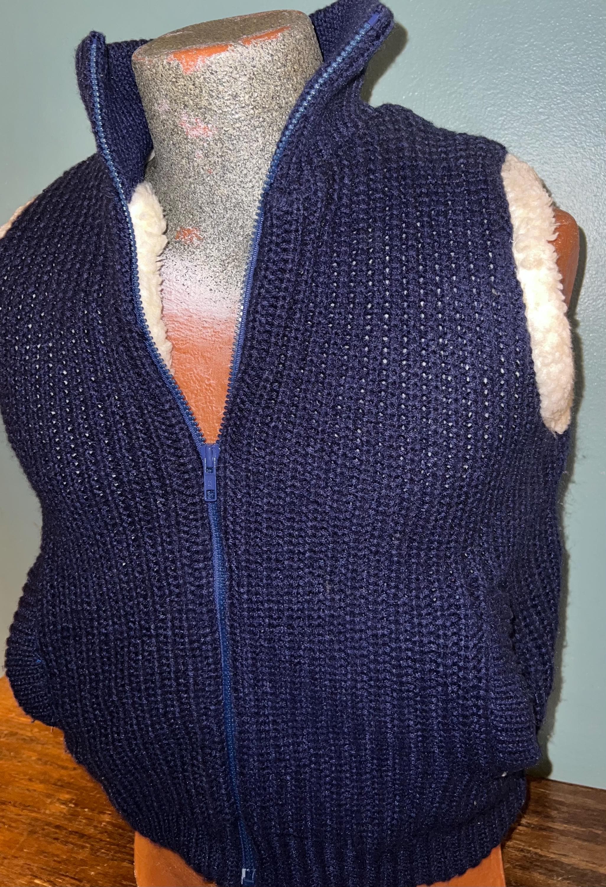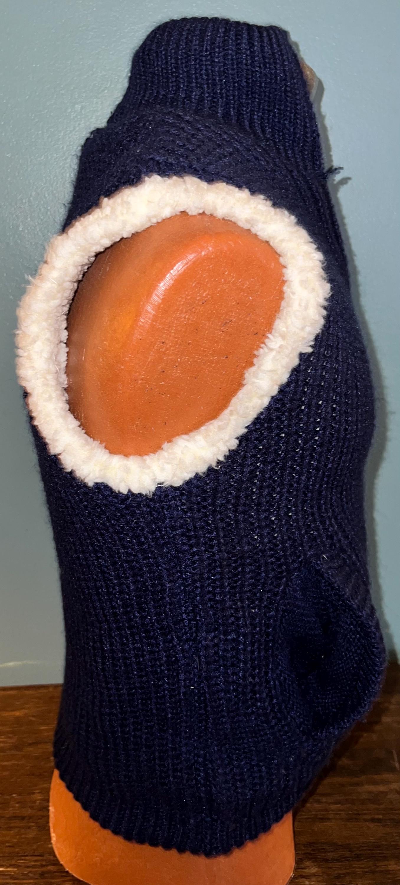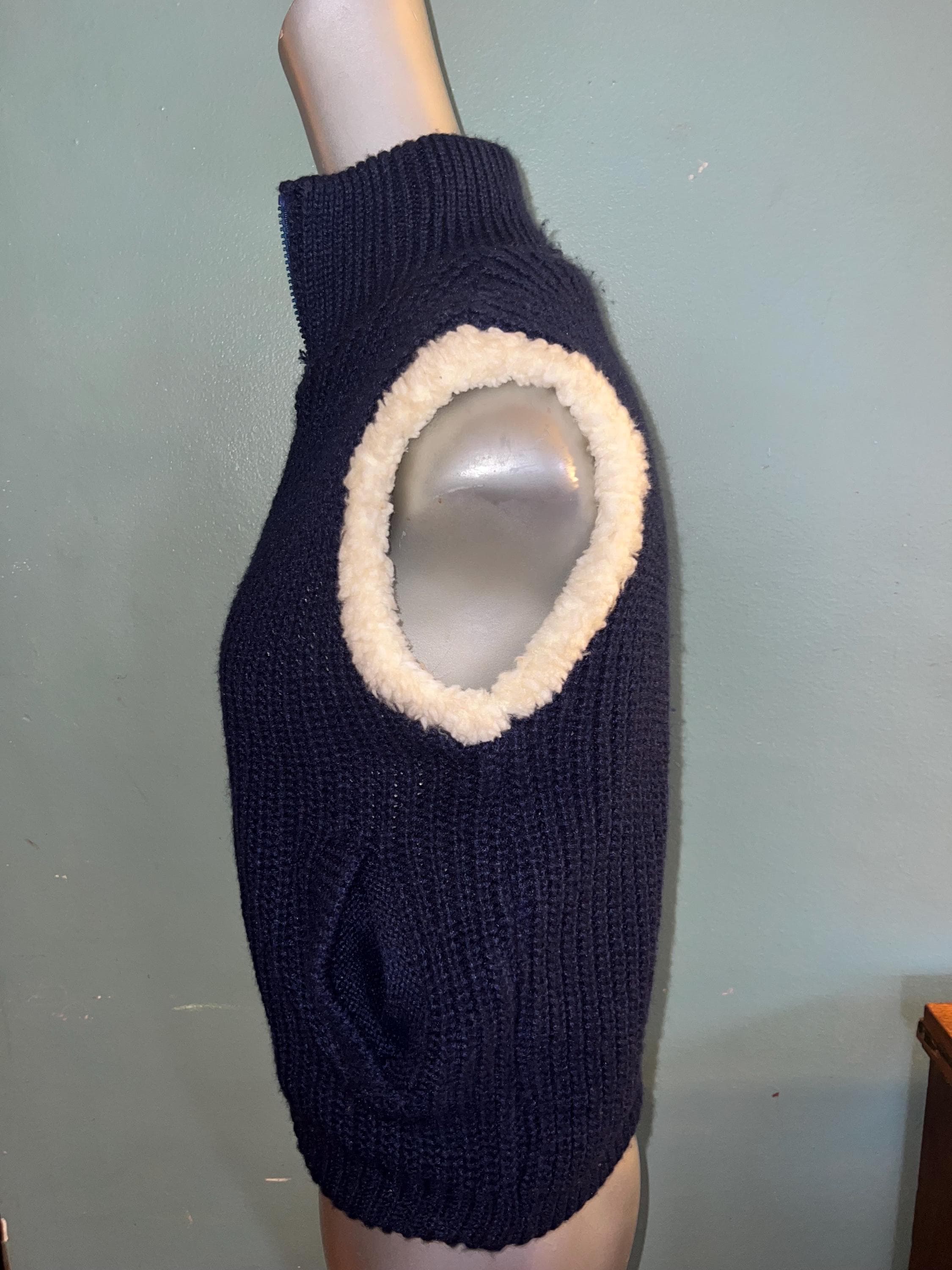 This is a navy blue sweater vest with outside pockets. It’s lined in fluffy white Sherpa. The only thing wrong with it is a pulled little hole on the back of the neck, (see photo). Other than that it’s in good vintage condition. It’s a size small and that means Small! I’d say it’s definitely unisex