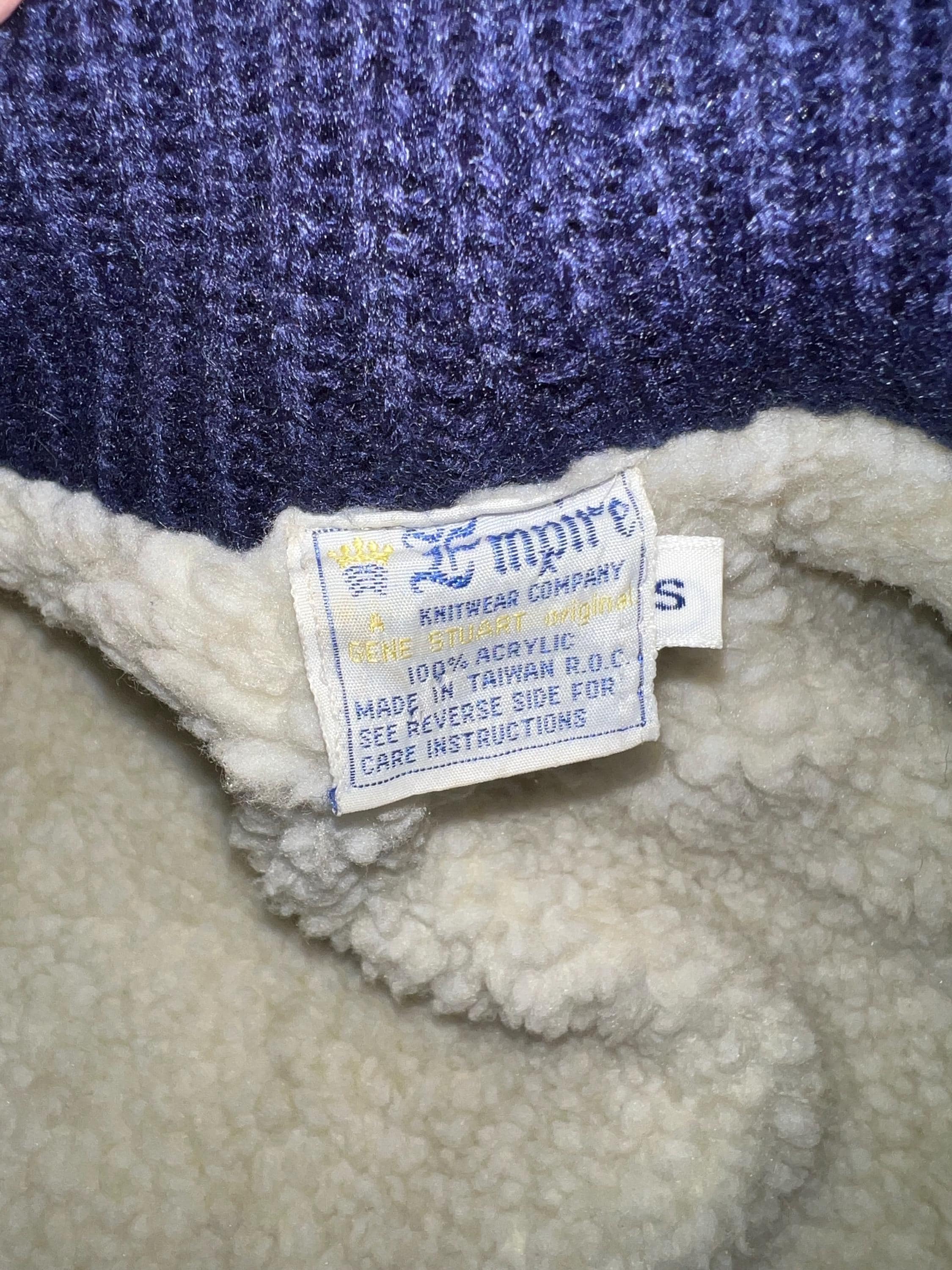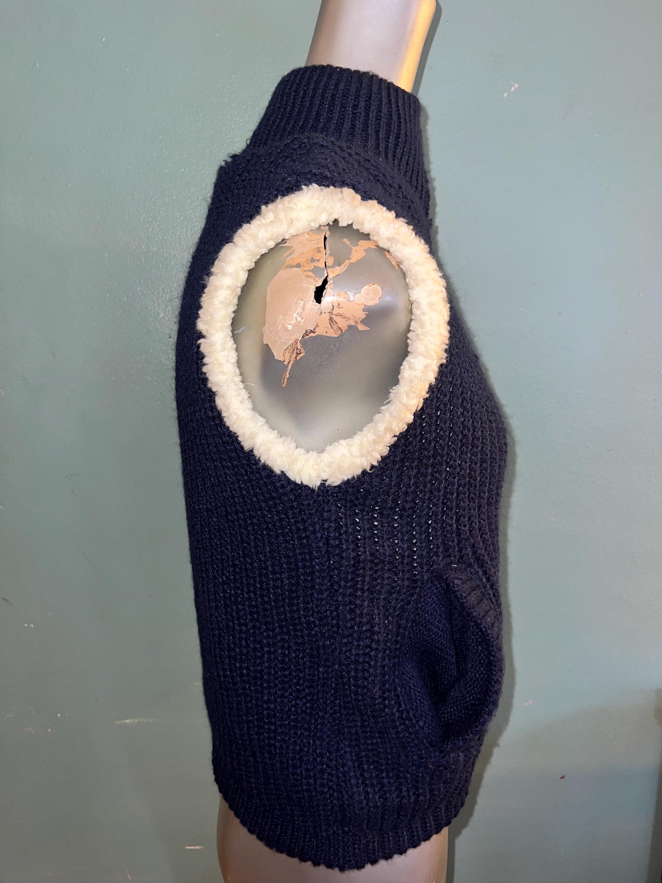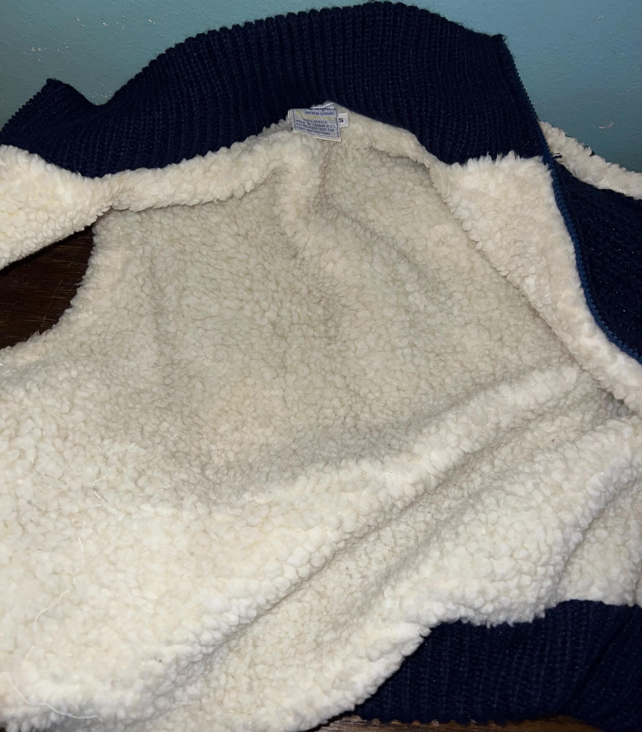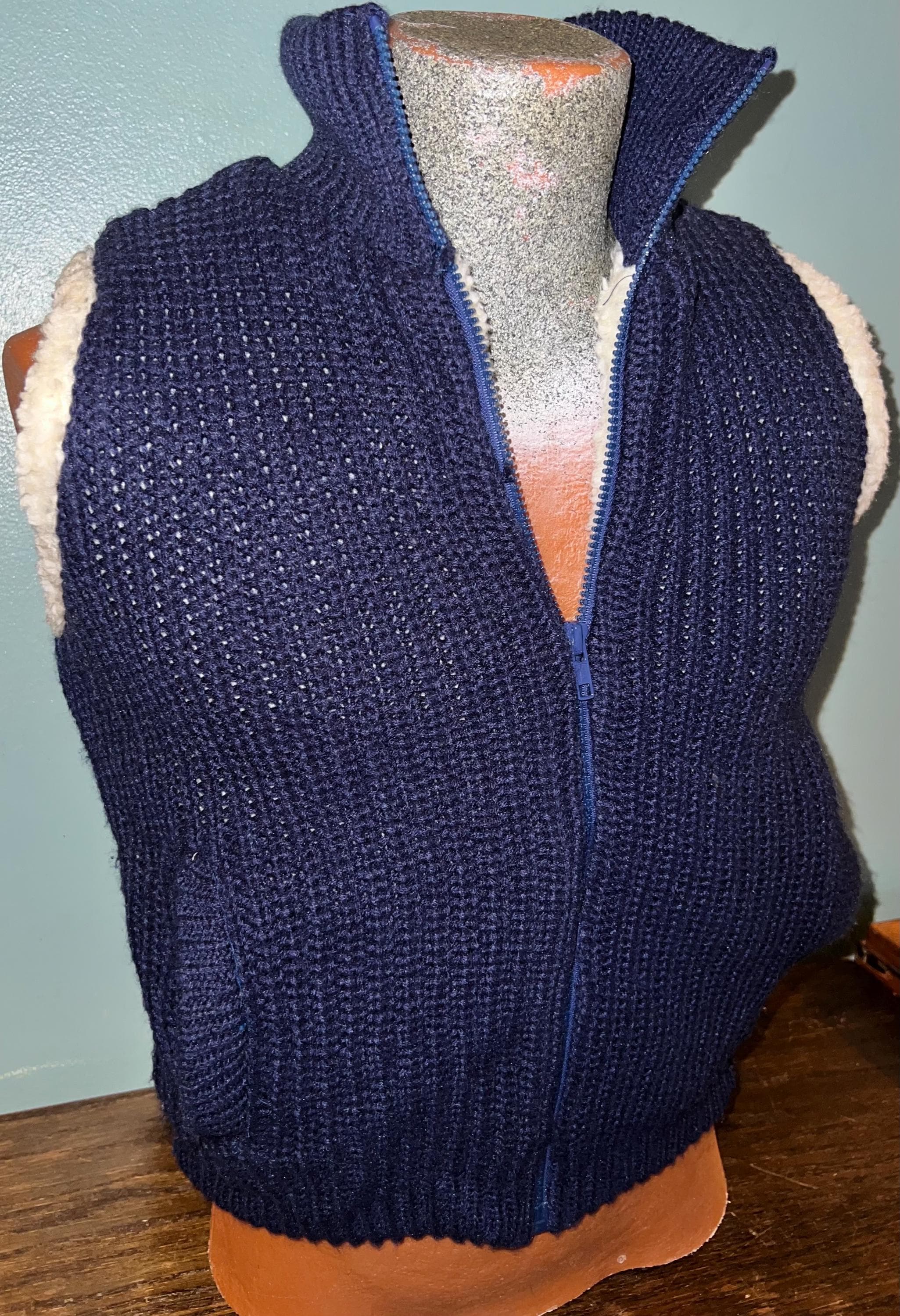 This is a navy blue sweater vest with outside pockets. It’s lined in fluffy white Sherpa. The only thing wrong with it is a pulled little hole on the back of the neck, (see photo). Other than that it’s in good vintage condition. It’s a size small and that means Small! I’d say it’s definitely unisex