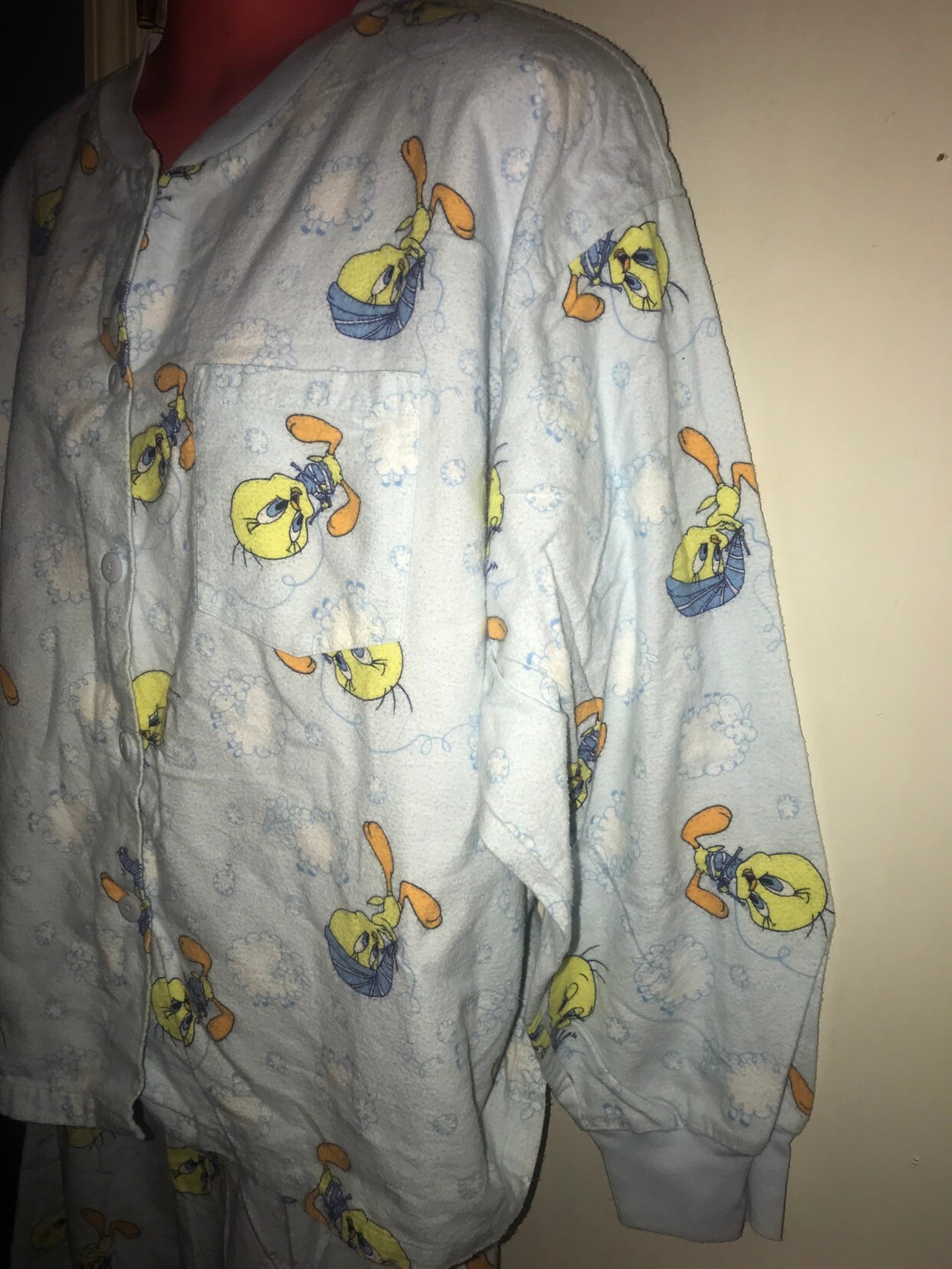 These sleepy tweety pajamas are too cute! They’ve got sheep that look like white clouds and images of Tweety trying to knit his sleeping hat with yarn coming directly from the little sheep. The pj’s are made of flannel so definitely made to be worn in the colder months.