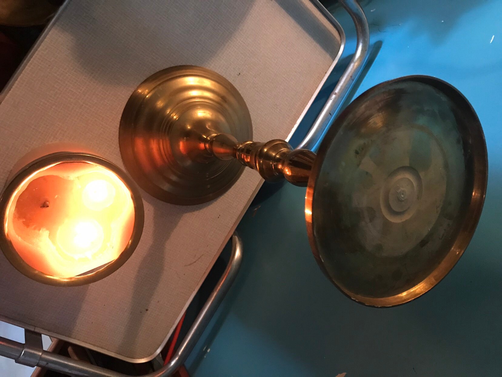 This is a beautiful very big candle holder. It can sit on a table or even on the floor like in front of a fireplace. It holds a huge big round candle and even has a brass ring that sits on top of the candle. I got this from a church clean out so I assume it was used in services, weddings and what not.