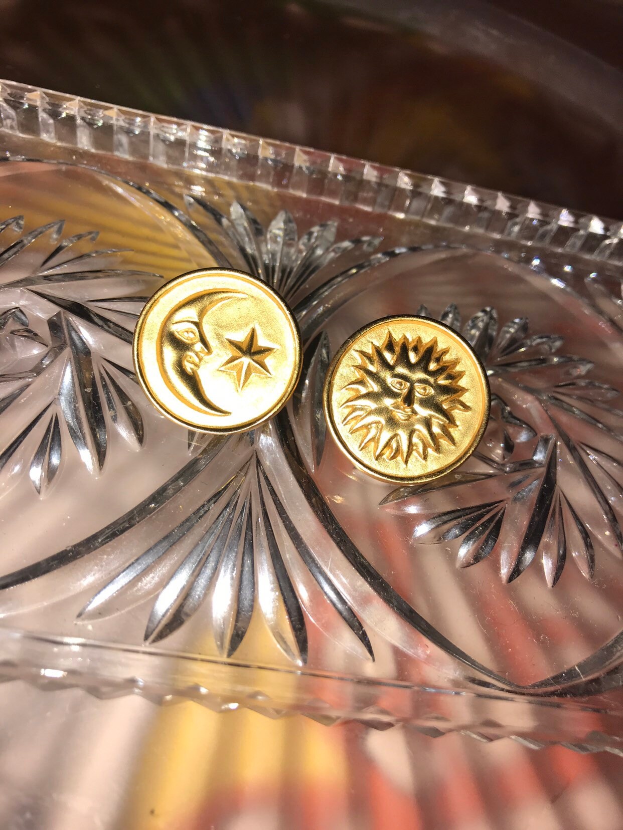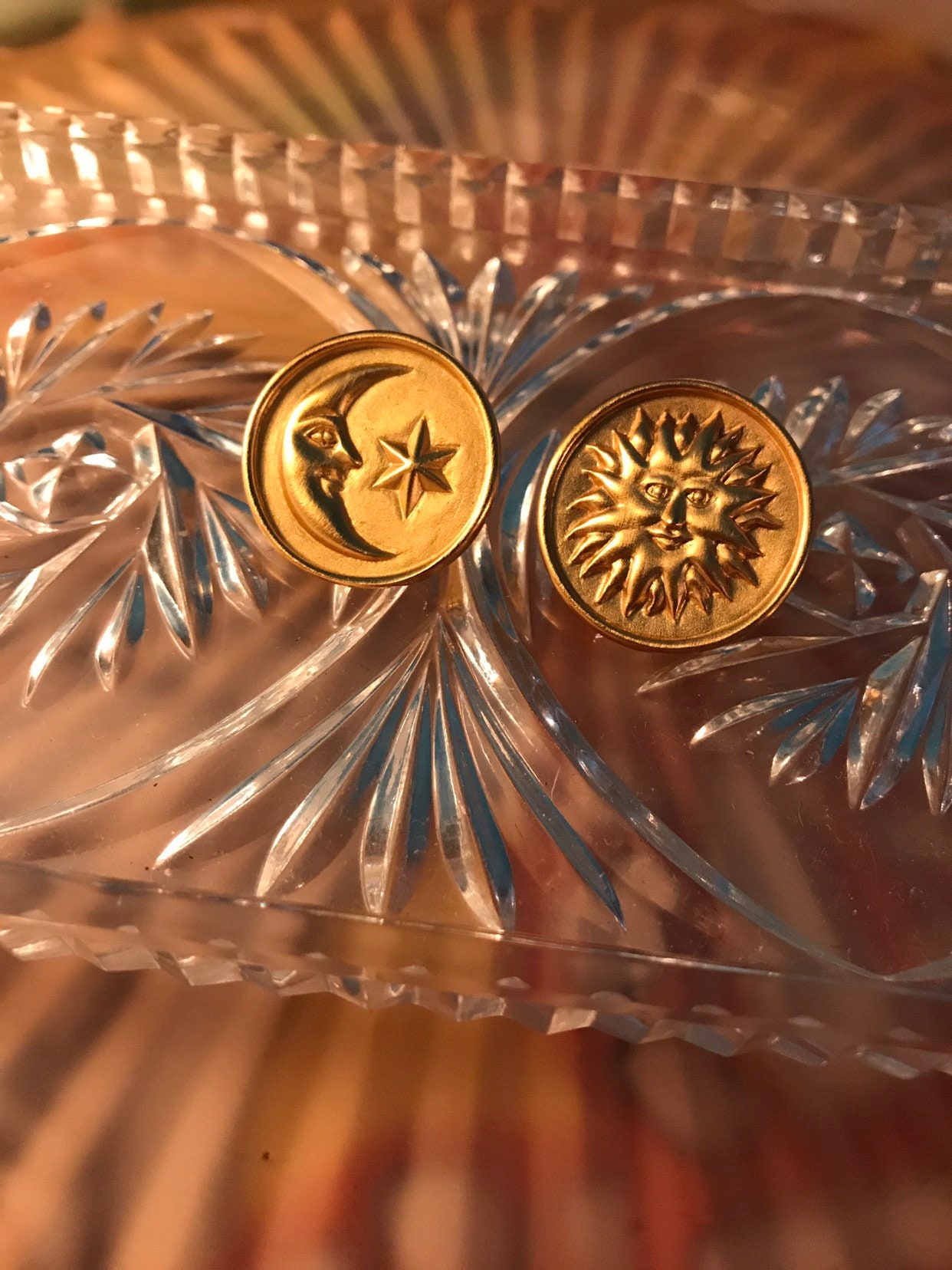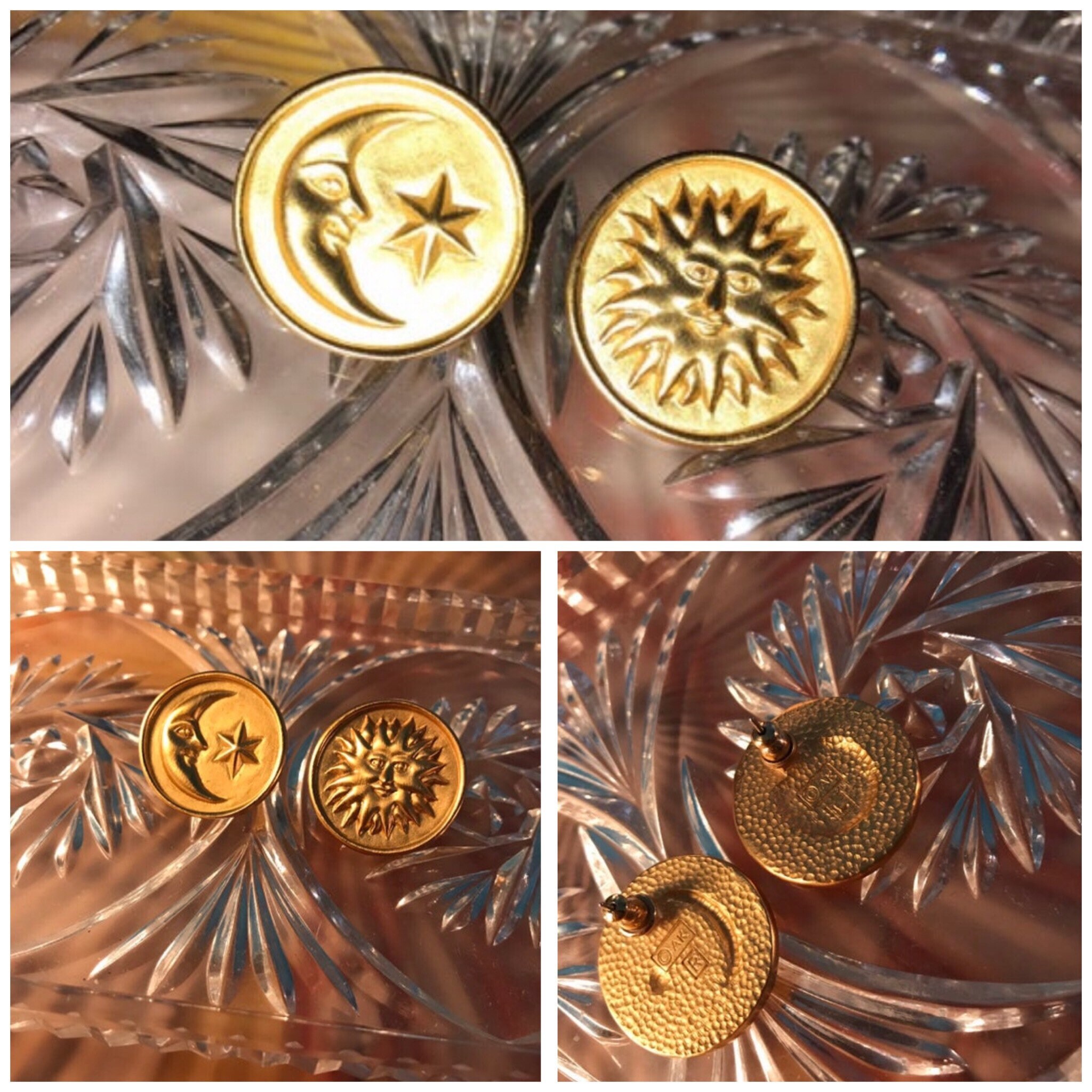 These are excellent 90’s Anne Klein Earrings. They are flat gold with the sun on one and the moon and star on the other. Nice nice earrings! They are in good vintage condition.