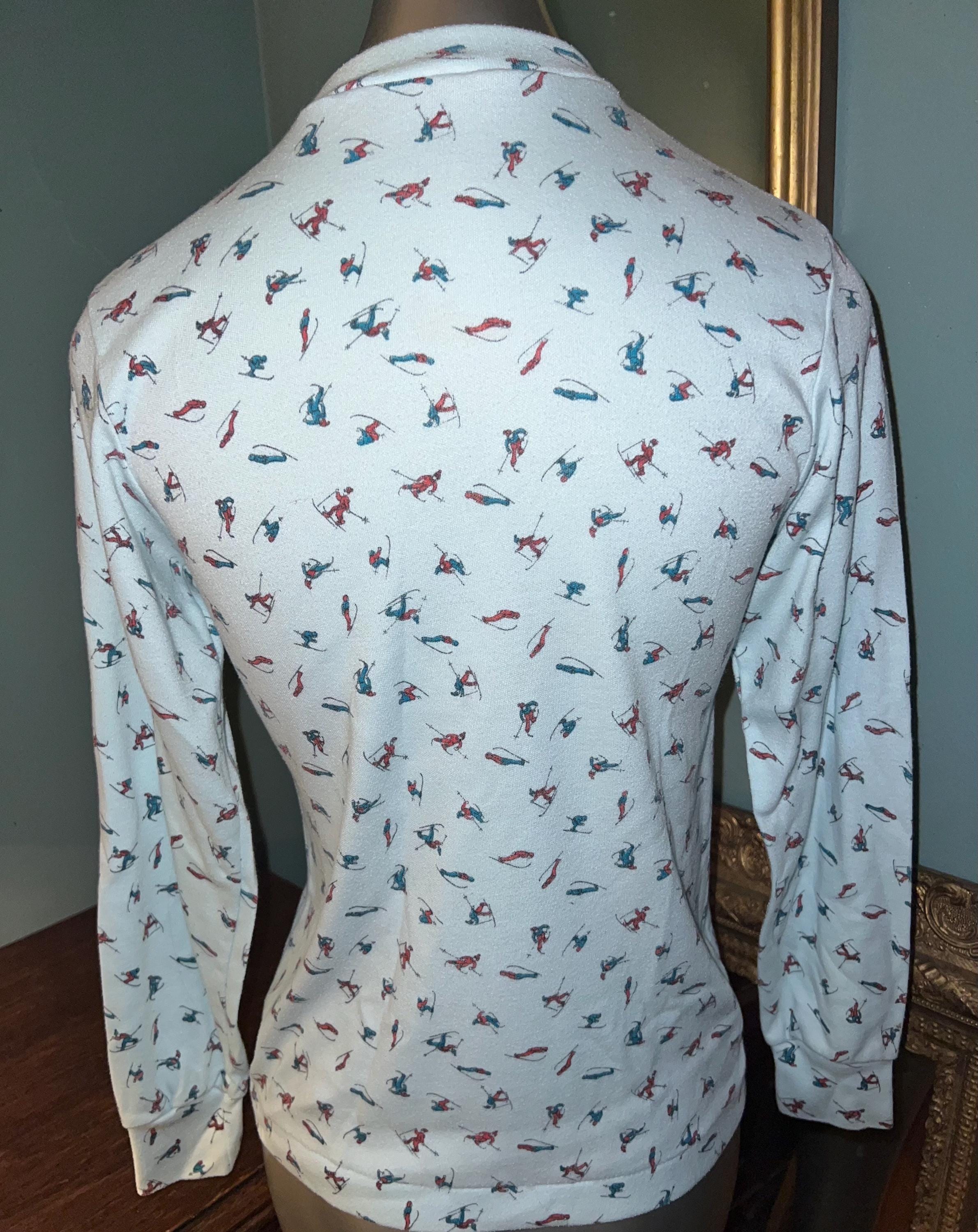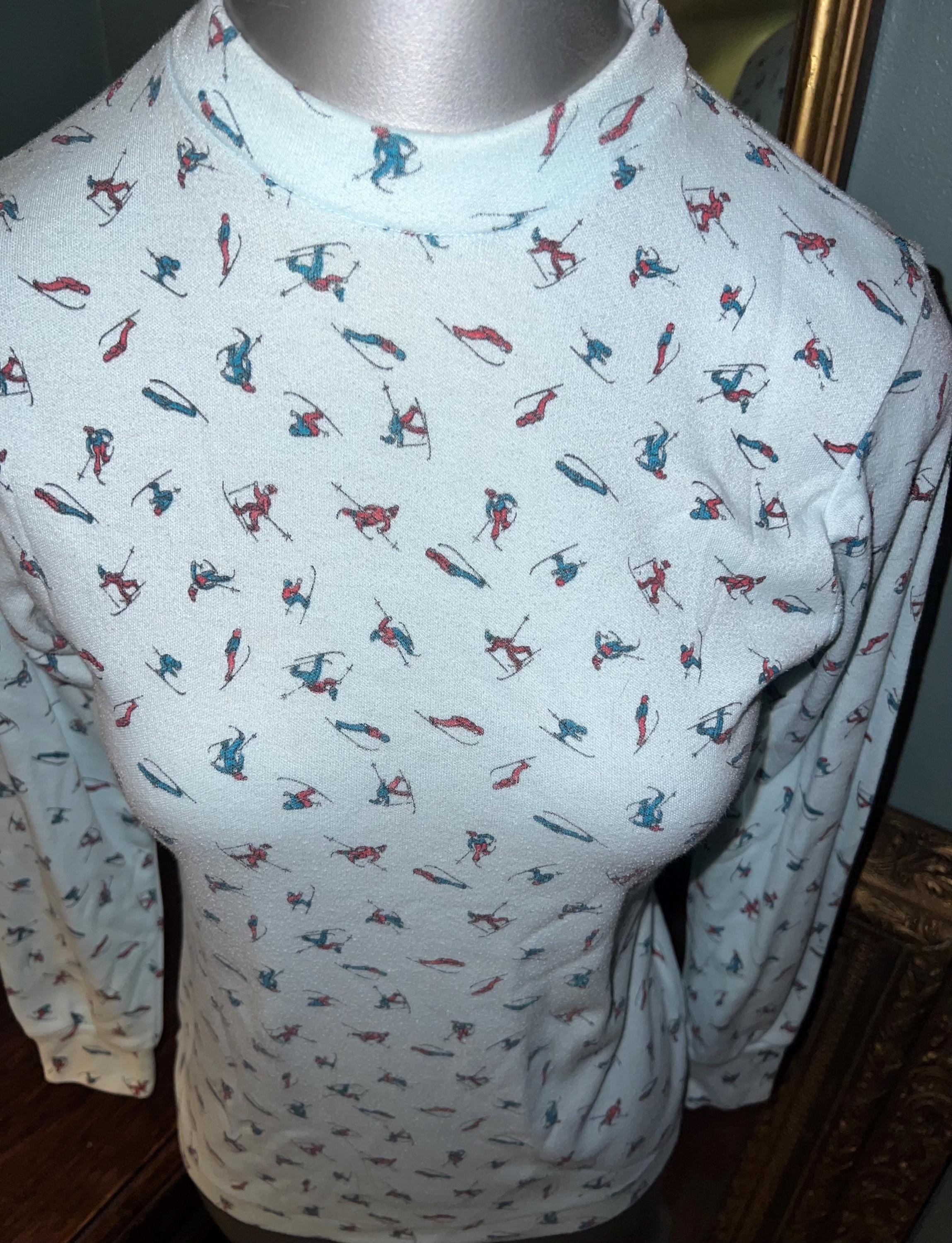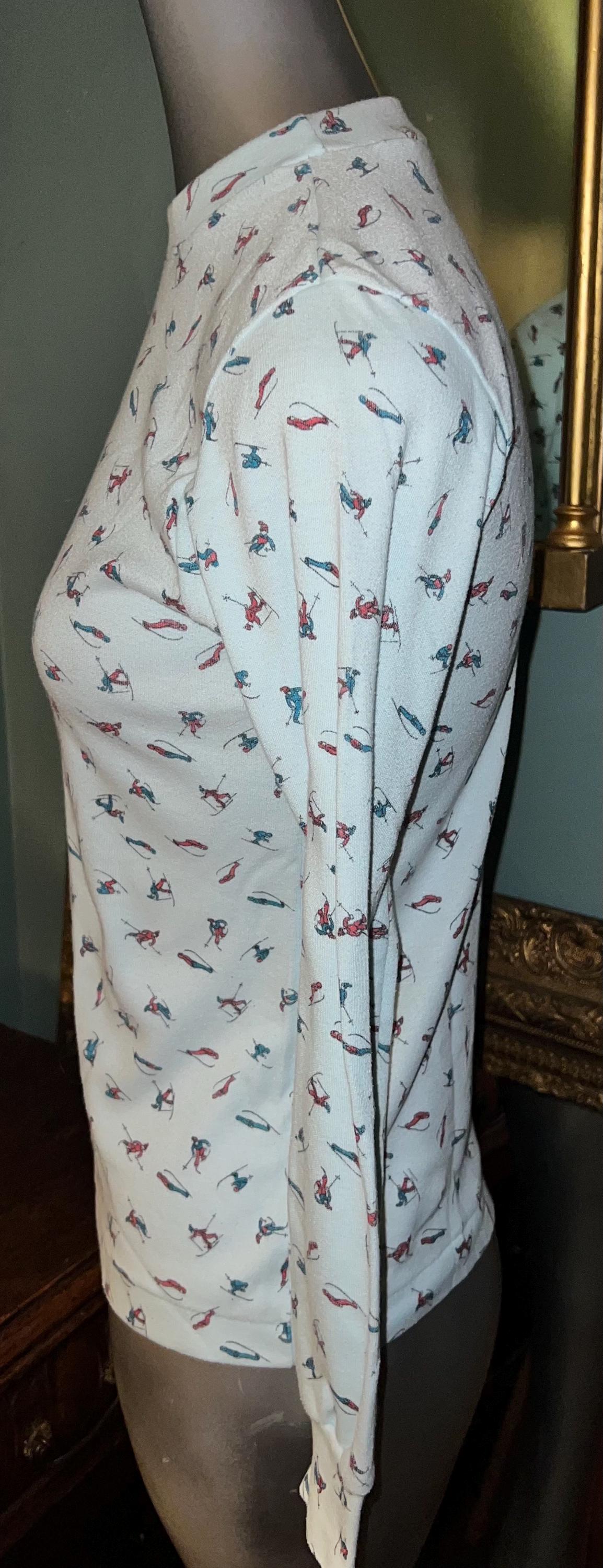 This is a very cute 70’s or 80’s shirt. I love the little skiers, in all sorts of ski poses, even falling! It’s got a little kneading of the material on the shirt but that’s just indicative of it’s age. Other than that it’s in good vintage condition.